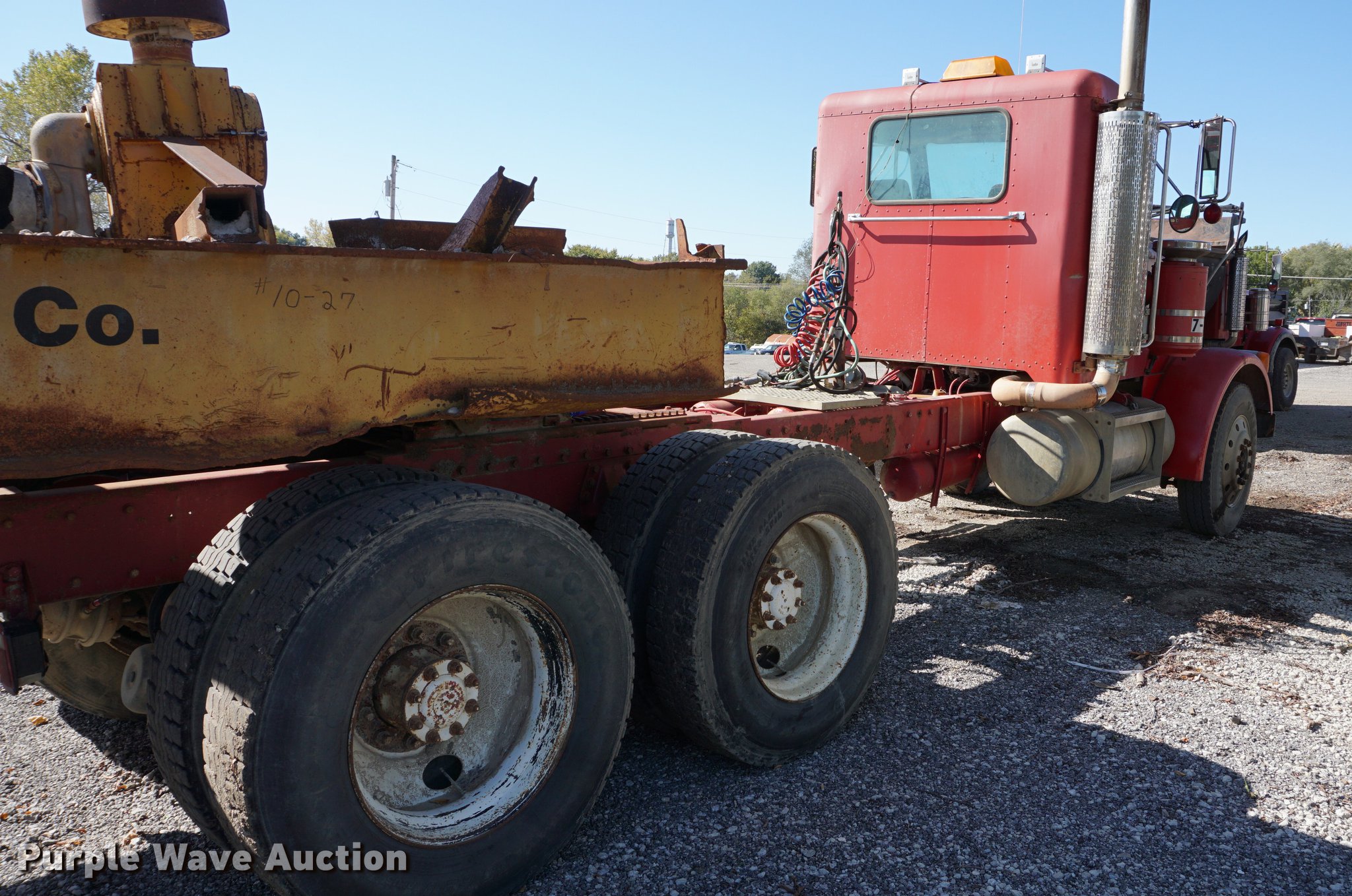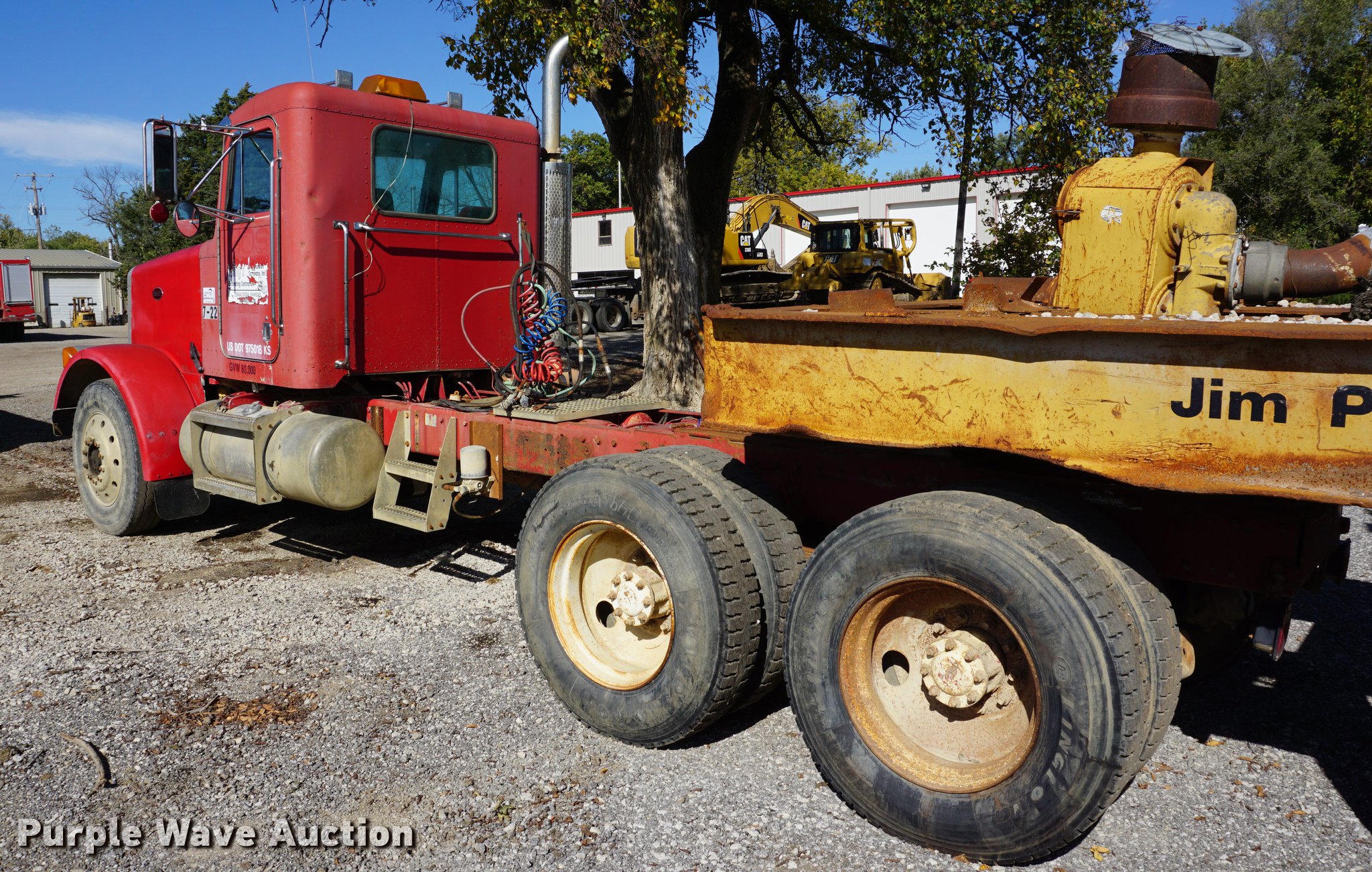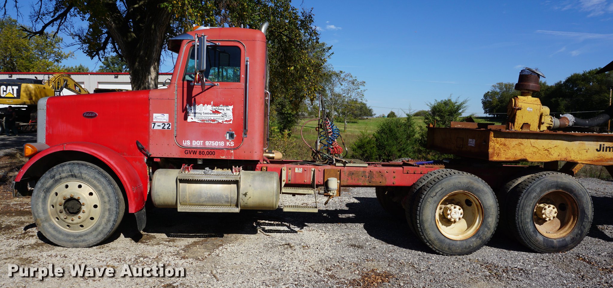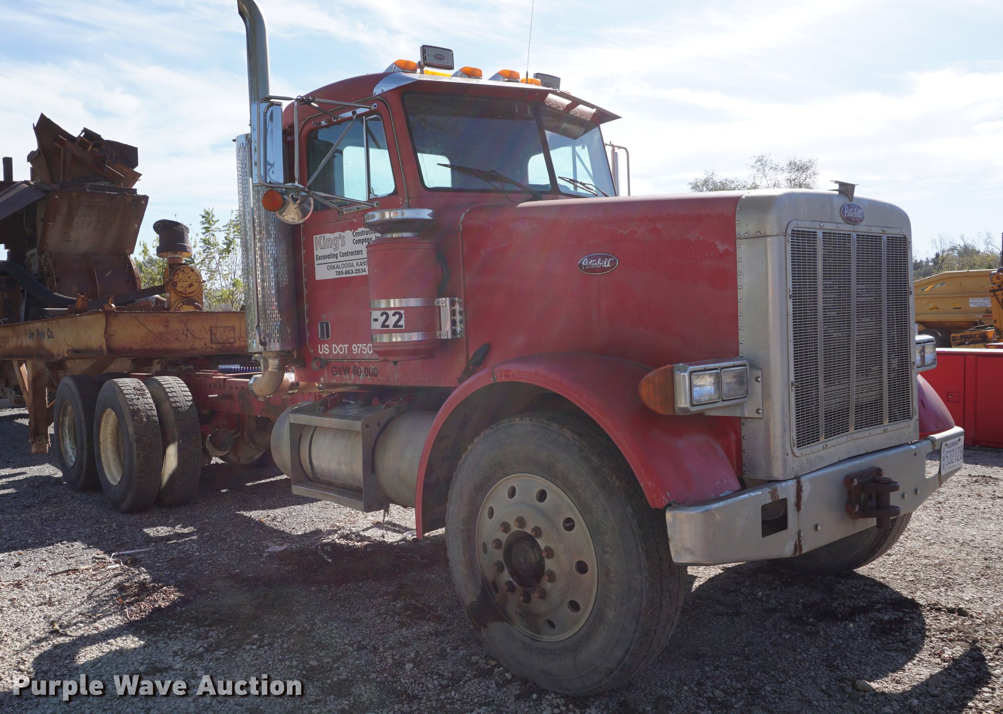 Purple Wave is selling a used Truck Tractor in Kansas. This item is a 1990 Peterbilt 378 semi truck with the following: 314,328 miles on odometer, 10,295 hours on meter, Caterpillar 3406 14.6L L6 turbo diesel engine, 261 kW, Eaton Fuller 18 speed manual transmission, Tandem axle, Inter-axle differential lock, AC and heat, AM/FM, Air suspension seat, Exterior visor, PTO, Wet kit, Single exhaust stack, Aluminum deck plate, Sliding fifth wheel plate, Dual fuel tanks, Spring over walking beam suspension, Air brakes, 11R24.5 tires, GVWR 54,400 lbs, FAWR 14,400 lbs, IAWR 20,000 lbs, RAWR 20,000 lbs