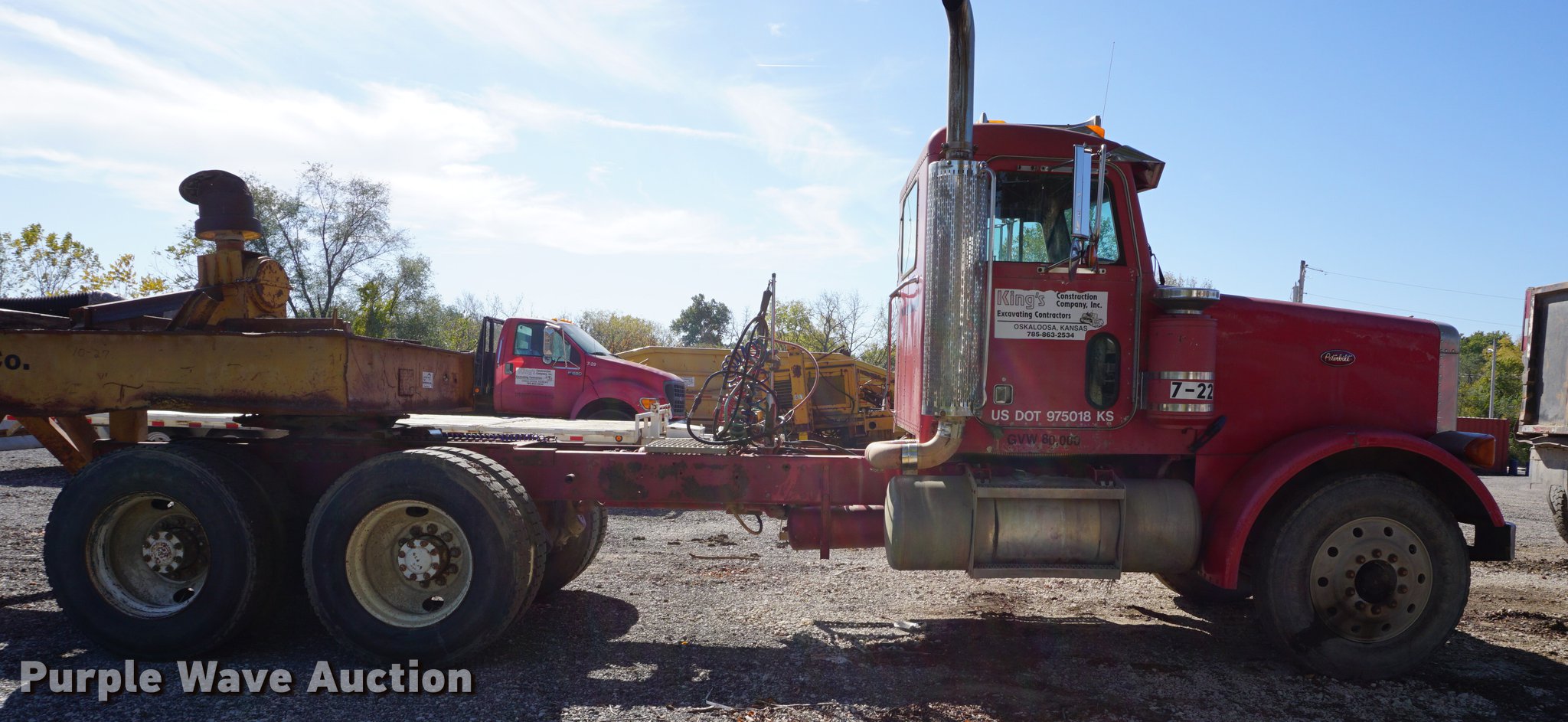 1990 Peterbilt 378 semi truck. 314,328 miles on odometer, 10,295 hours on meter, Caterpillar 3406 14.6L L6 turbo diesel engine 261 kW, Eaton Fuller 18 speed manual transmission, Tandem axle, Inter-axle differential lock, AC and heat, AM/FM, Air suspension seat, Exterior visor, PTO, Wet kit, Single exhaust stack, Aluminum deck plate, Sliding fifth wheel plate, Dual fuel tanks, Spring over walking beam suspension, Air brakes, 11R24.5 tires, GVWR 54,400 lbs, FAWR 14,400 lbs, IAWR 20,000 lbs, RAWR 20,000 lbs. Kansas title. Title distribution may be delayed up to 14 days from verification of funds. 1XPFDB9XXLD299602. King Construction. 205 Walnut St. Oskaloosa, KS 66066