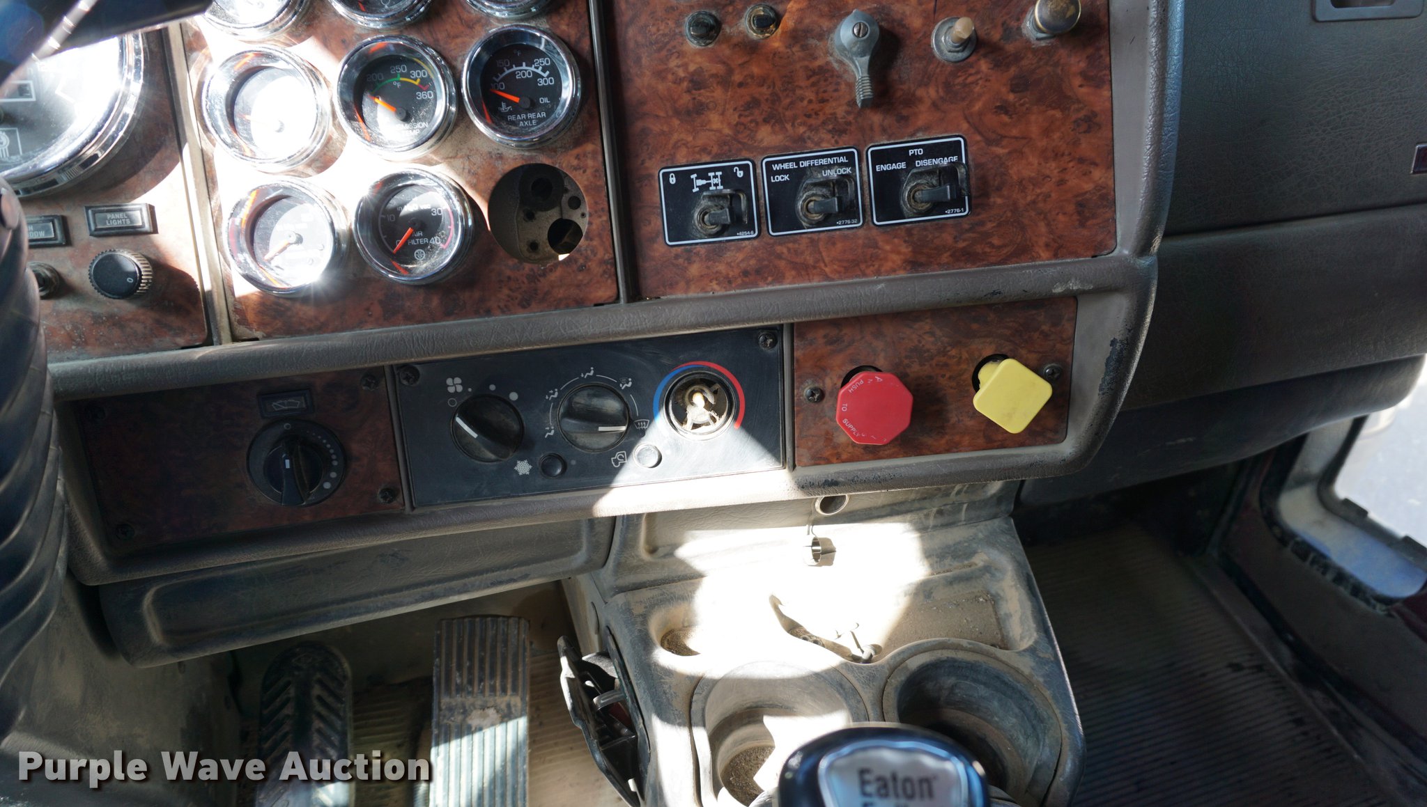 2003 Kenworth W900 dump truck. 548,651 miles on odometer, Caterpillar C15 14.6L L6 turbo diesel engine 475 HP, Eaton Fuller RTO16908LL eight speed Lo-Lo Lo manual transmission, Tandem axle, Inter-axle differential lock, AC and heat, AM/FM, Heated mirrors, Air suspension seat, Exterior visor, PTO, 16'L x 8'W steel barrel bed Single ram hoist, Roll tarp, Air operated end gate, Single fuel tank, Walking beam suspension, Air brakes, 385/65R22.5 front tires, 11R24.5 rear tires, GVWR 58,000 lbs, FAWR 18,000 lbs, IAWR 20,000 lbs, RAWR 20,000 lbs. Kansas title. Title distribution may be delayed up to 14 days from verification of funds. 1NKWLB0X63J396135. King Construction. 205 Walnut St. Oskaloosa, KS 66066