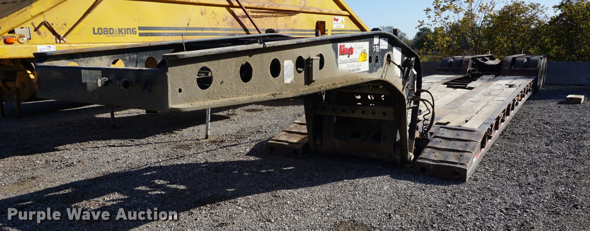 2001 Fontaine TH55-FLD lowboy equipment trailer. 52' overall length, 102"W, 25' well length, 13'9" over rear axles, 12" swing-out side boards, Wood deck, D-ring tie downs, Detachable neck, Fifth wheel plate, Triple axle, Air suspension, Air brakes, 275/70R22.5 tires, GVWR 110,000 lbs, GAWR 23,000 lbs, Chains and boomers not included, (2) brake pots need replaced. Kansas title. Title distribution may be delayed up to 14 days from verification of funds. 4LF4S533213510614. King Construction. 205 Walnut St. Oskaloosa, KS 66066