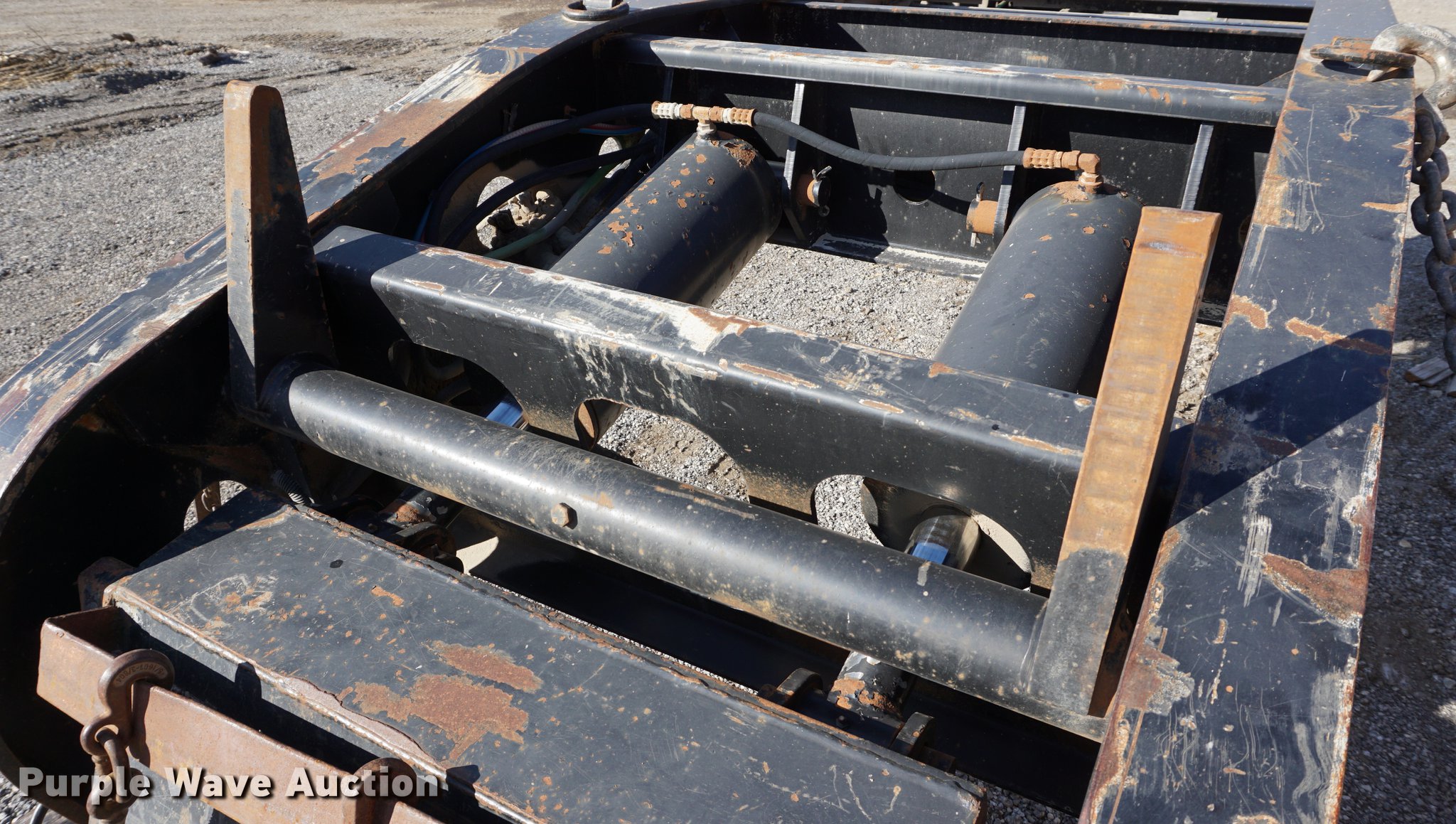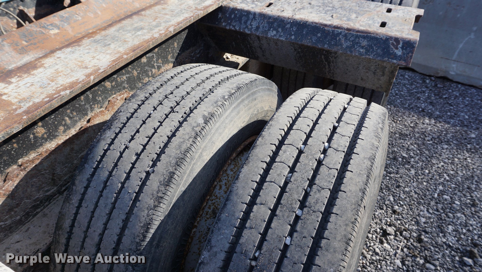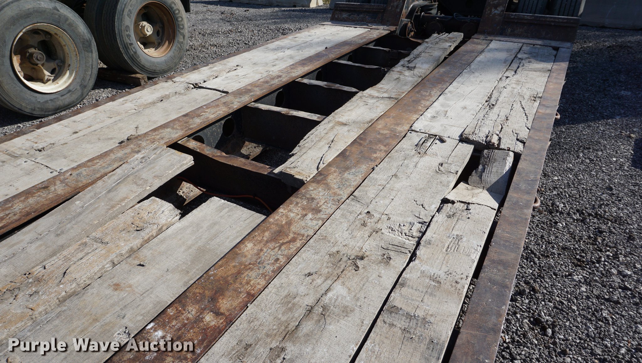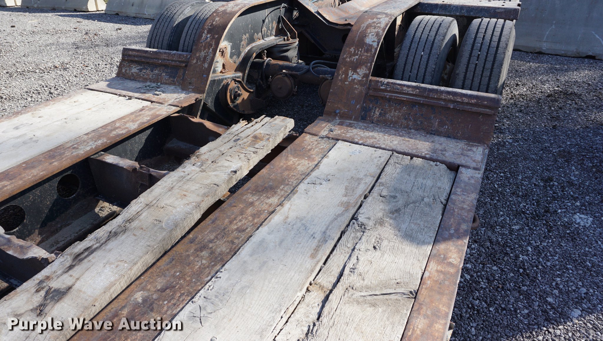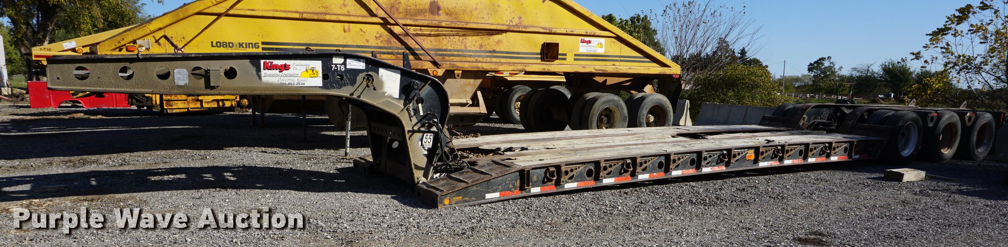 Purple Wave is selling a used Equip. Trailer in Kansas. This item is a 2001 Fontaine TH55-FLD lowboy equipment trailer with the following: 52' overall length, 102"W, 25' well length, 13'9" over rear axles, 12" swing-out side boards, Wood deck, D-ring tie downs, Detachable neck, Fifth wheel plate, Triple axle, Air suspension, Air brakes, 275/70R22.5 tires, GVWR 110,000 lbs, GAWR 23,000 lbs, Chains and boomers not included, (2) brake pots need replaced