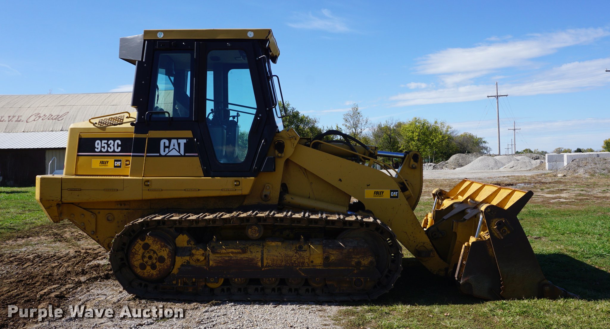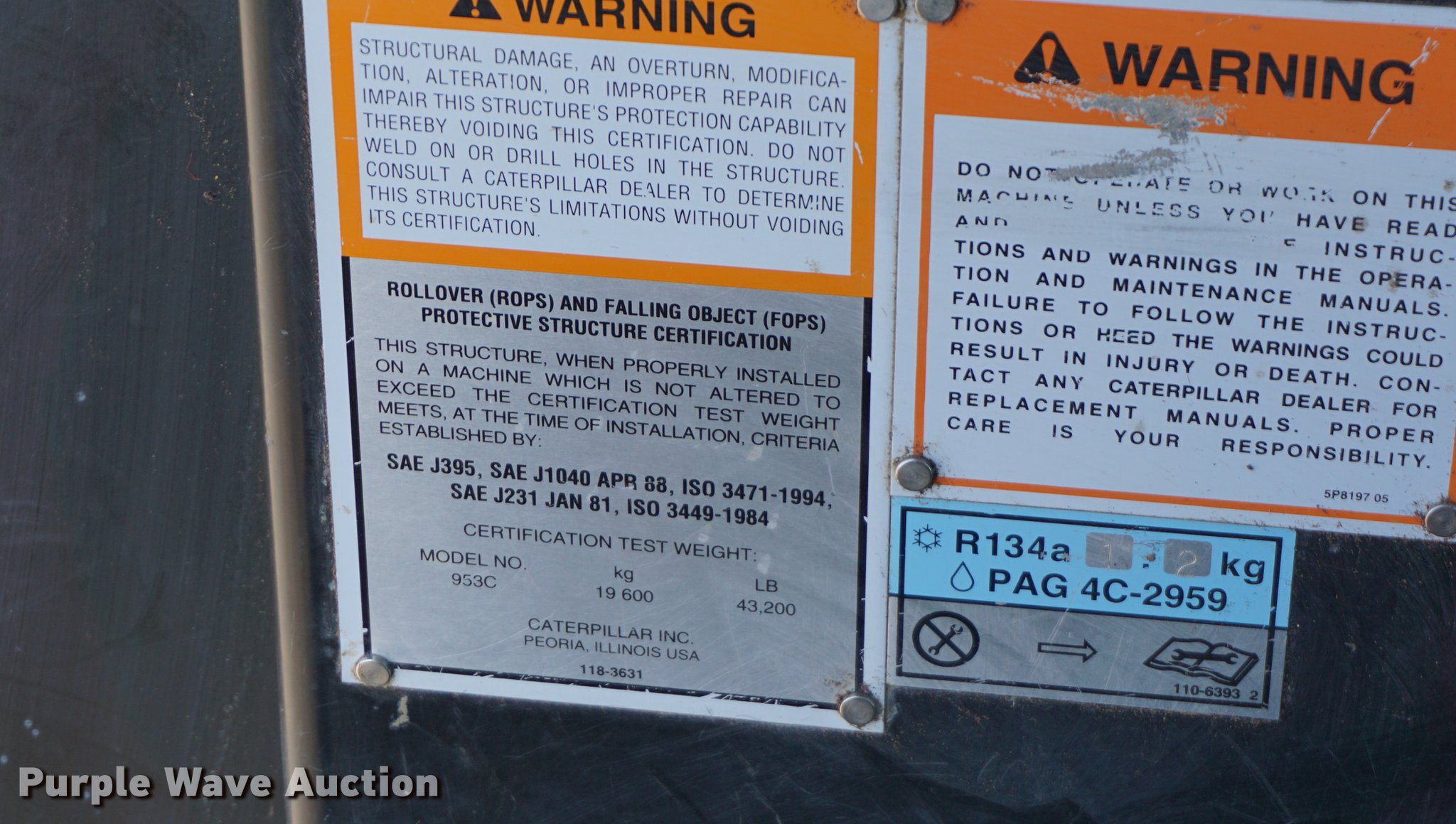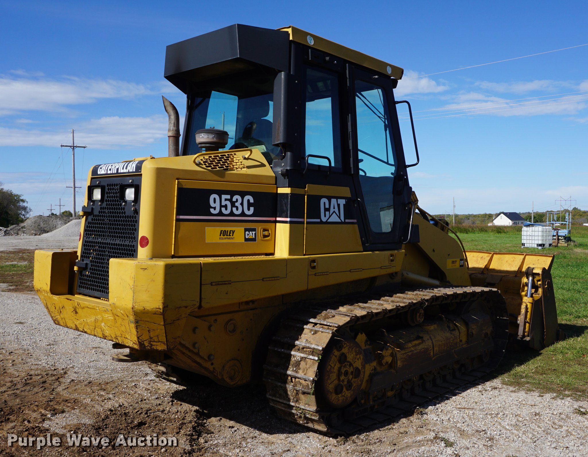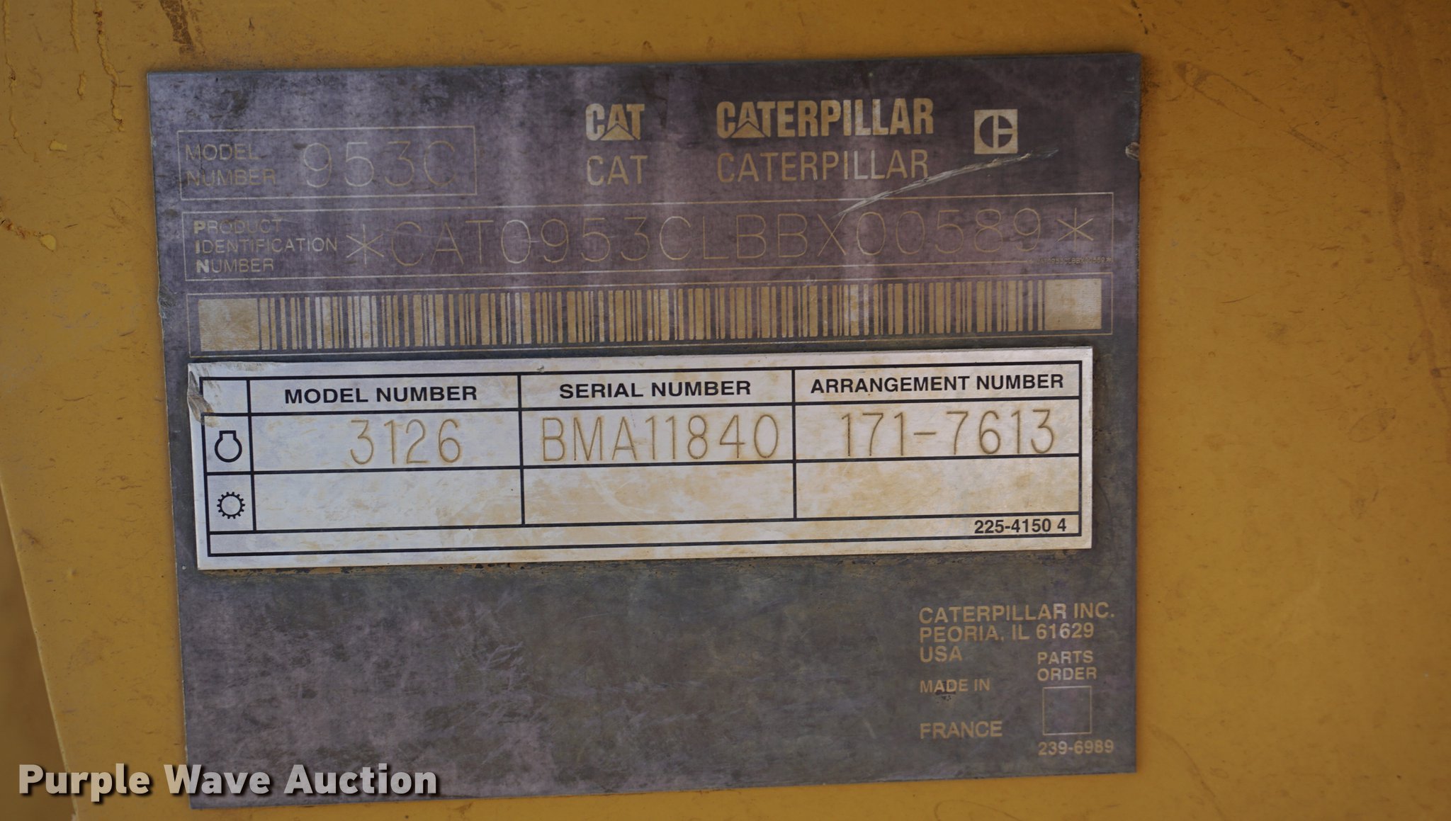 Purple Wave is selling a used Crawler Loader in Kansas. This item is a 2004 Caterpillar 953C track loader with the following: 7,567 hours on meter, Caterpillar 3126 7.2L six cylinder turbo diesel engine, 128 HP, Serial BMA11840, Two speed hydrostatic transmission, Enclosed cab, AC and heat, AM/FM, Suspension seat, Joystick bucket controls, Wipers, Front work lights, Caterpillar 96"W multi purpose bucket, 2 cu. yd. capacity, Bolt-on cutting edge, (8) teeth, Counterweights, 19 3/4"W double grouser track pads, Serial CAT0953CLBBX00589