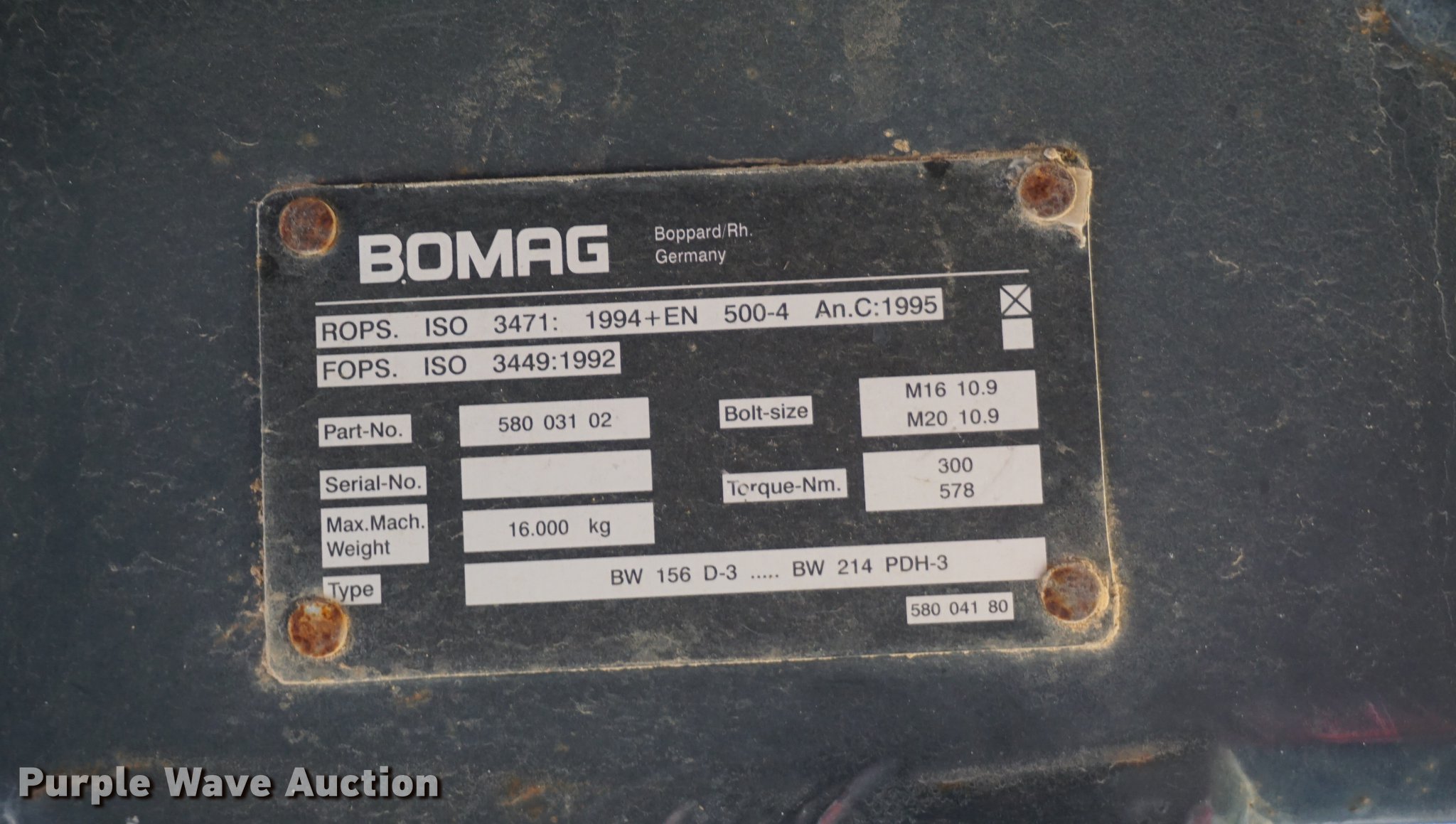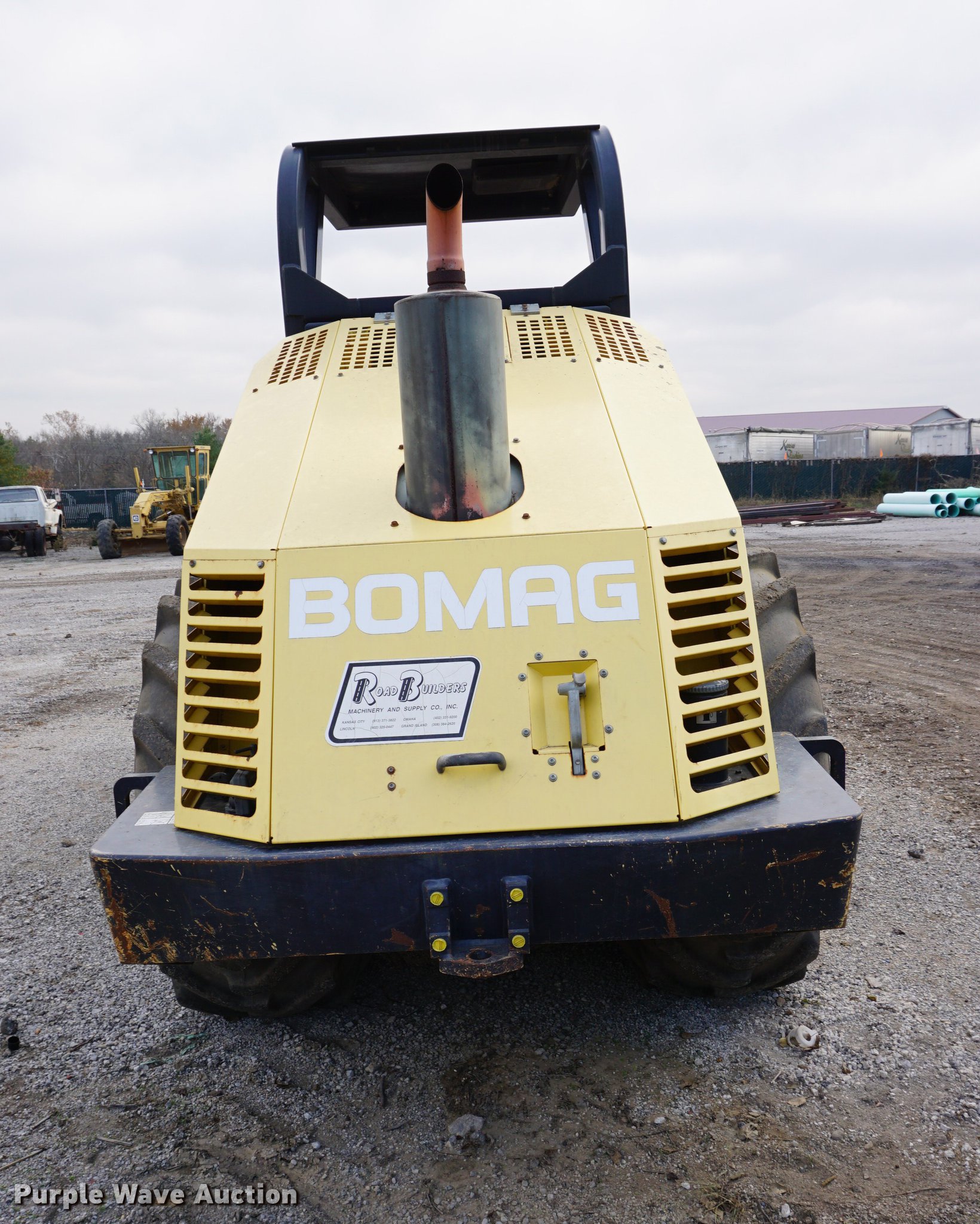 Purple Wave is selling a used Single Drum Roller Compactor in Kansas. This item is a 2006 Bomag BW213PDH-3 single drum roller with the following: 1,285 hours on meter, Cummins QSB155C six cylinder turbo diesel engine, 155 HP, Hydrostatic transmission, Canopy, Suspension seat, 7'W x 58.5" padfoot soil compactor drum, Single vibratory system, 100.5"W blade, (2) 23.1-26 tires, Serial 901581521151