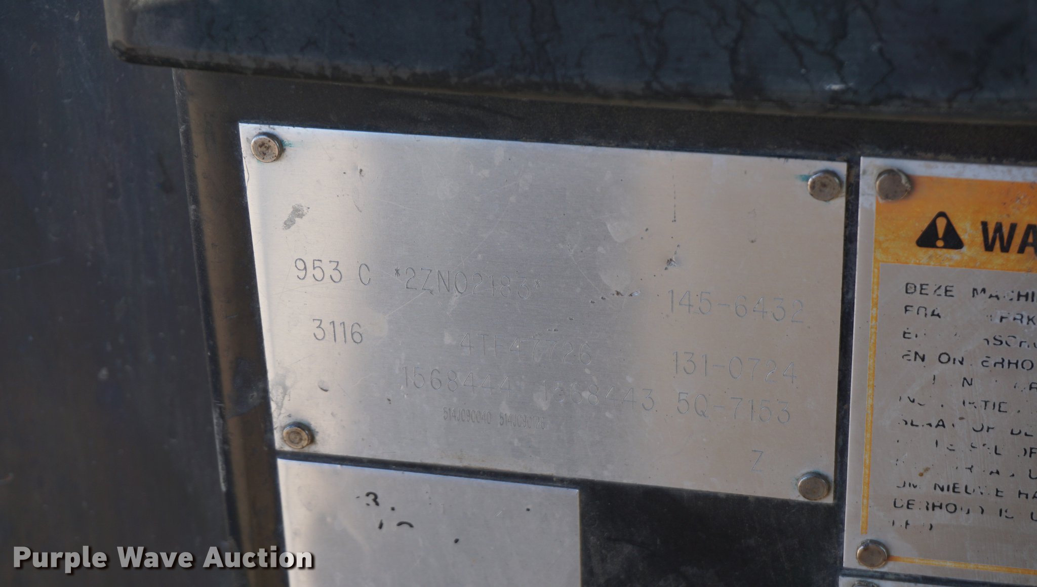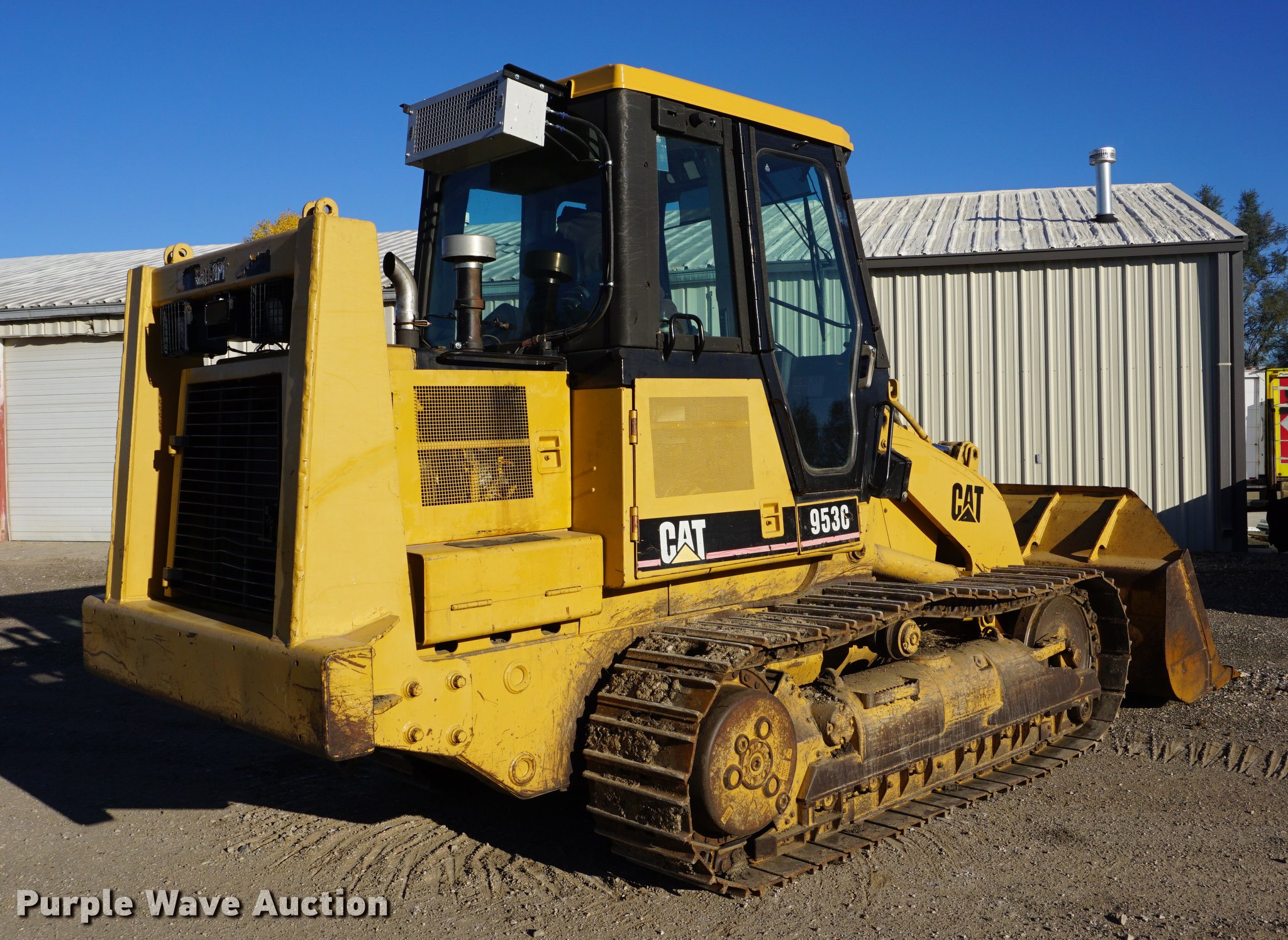 Purple Wave is selling a used Crawler Loader in Kansas. This item is a 1998 Caterpillar 953C track loader with the following: 3,741 hours on meter, 6,943 total hours on unit, Caterpillar 3116 six cylinder turbo diesel engine, Serial 4TF47726, Hydrostatic transmission, Enclosed cab, AC and heat, Suspension seat, Joystick bucket controls, Front and rear work lights, 8'W general purpose bucket, Weld-on cutting edge, (8) teeth, Double grouser track pads, Serial 2ZN02183