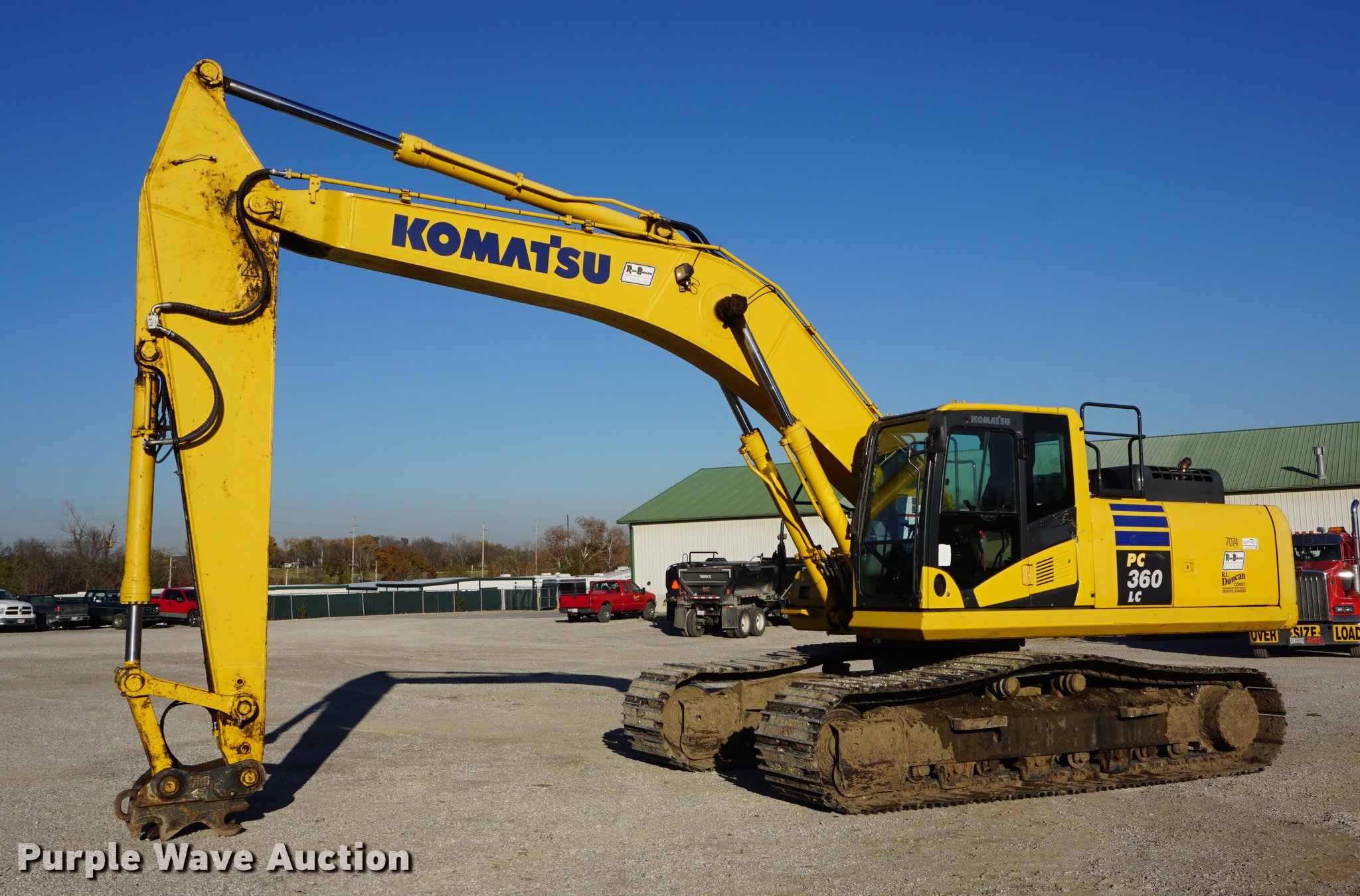 2013 Komatsu PC360LC-10 excavator. 5,738 hours on meter, Komatsu 5AA6D114E-5 8.9L six cylinder turbo diesel engine 271 HP, Serial 73443955, Three speed hydrostatic transmission, EROPS, AC and heat, AM/FM, Suspension seat, Pattern changer, Wipers, Front work lights, Backup camera, Standard boom, 13'2" stick length, JRB hydraulic quick coupler, 33.5"W steel triple grouser track pads, Serial KMTPC242H54A32809. R.L. Duncan Construction. 9560 Lexington St. DeSoto, KS 66018