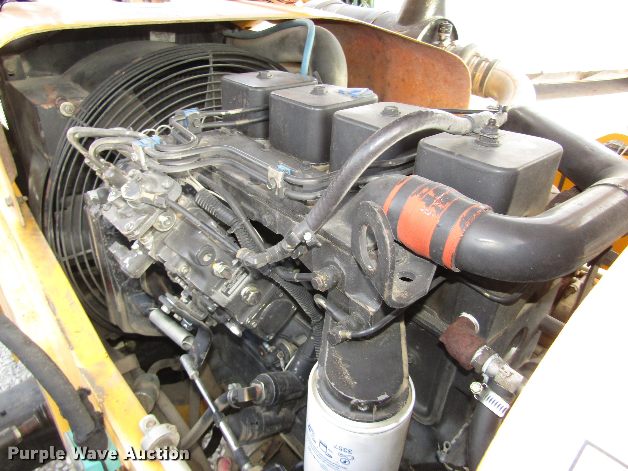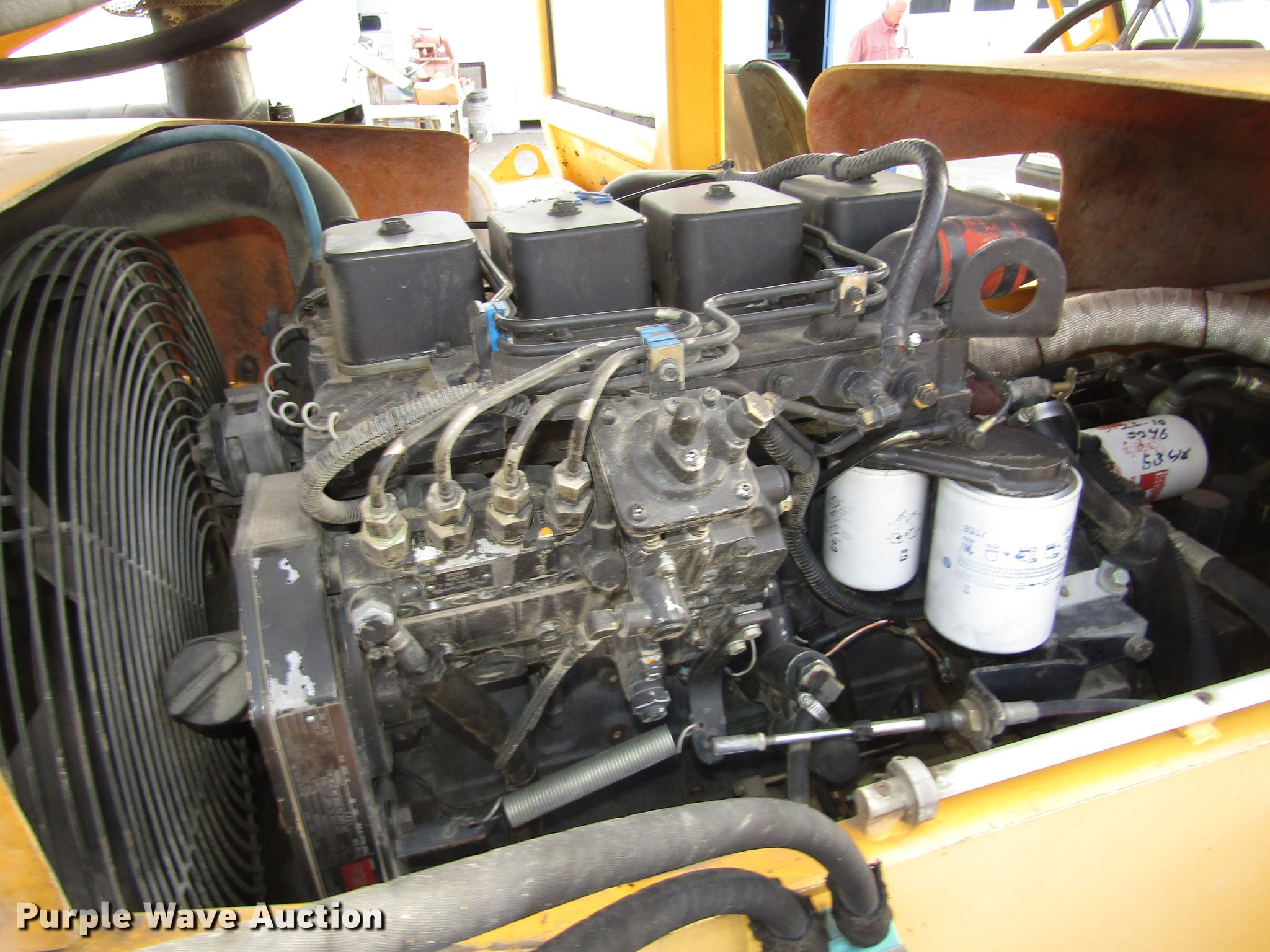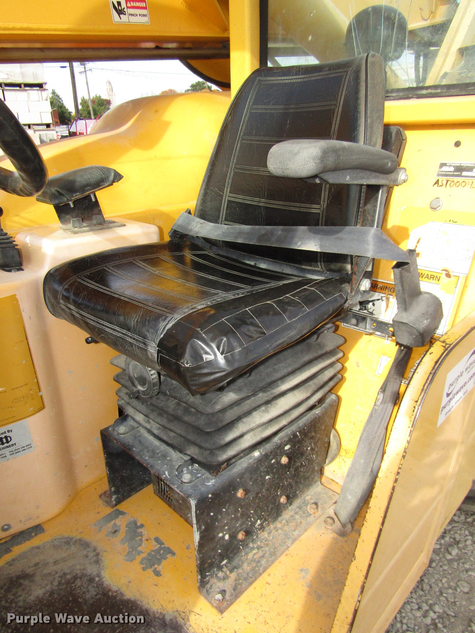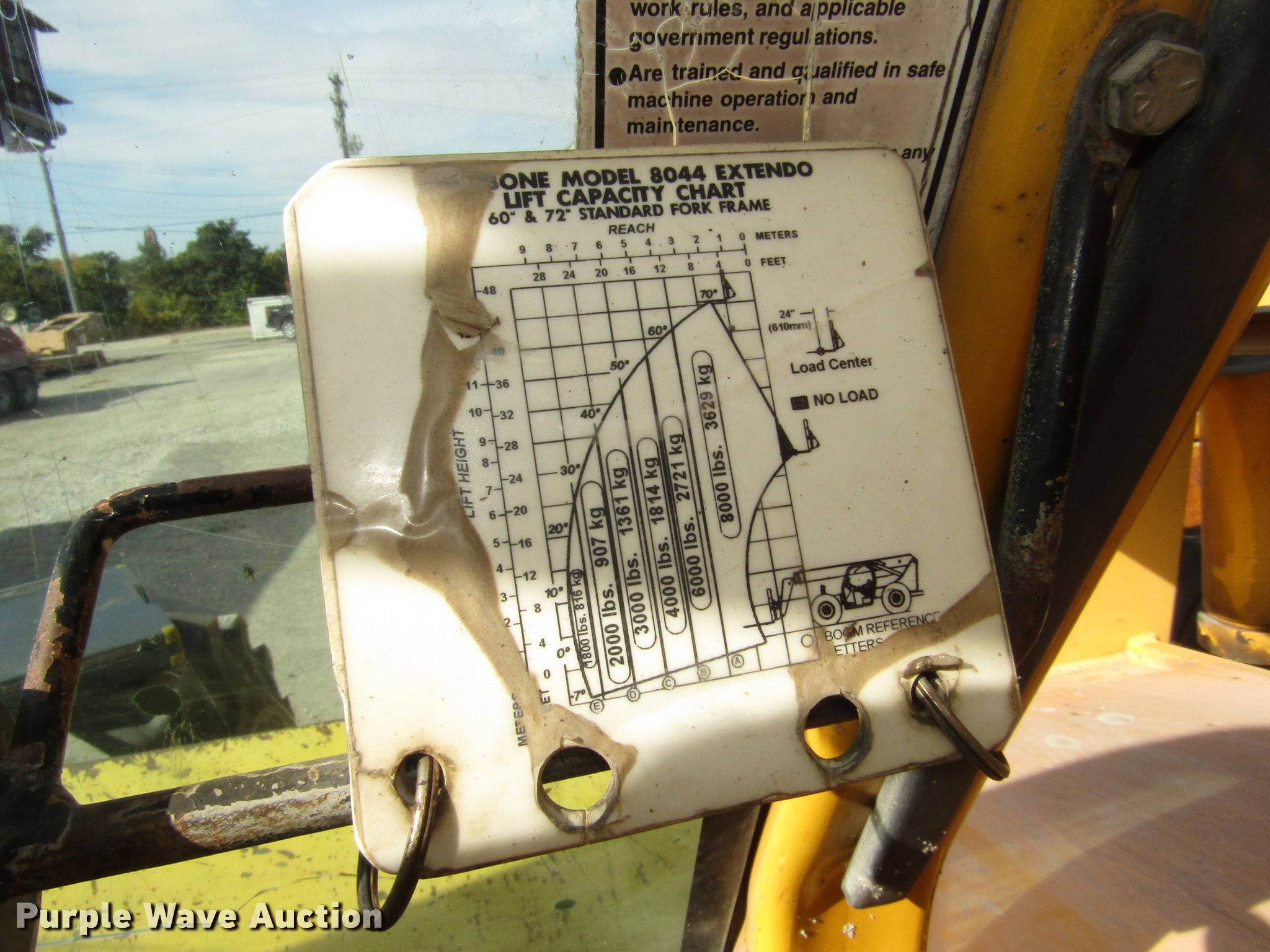 Purple Wave is selling a used Telehandler in Nebraska. This item is a Pettibone 8044 telehandler with the following: 7,551 hours on meter, Cummins B3.9C 3.9L four cylinder turbo diesel engine, 110 HP, Serial 45928248, Powershift transmission, 3F-3R gears, Four wheel drive, Crab steer, Four wheel steer, EROPS, Heat, Spring suspension seat, Backup alarm, Block heater, Front and rear work lights, 8,000 lbs maximum lift capacity, 1,800 lbs maximum lift capacity at 30' reach, 44' maximum lift height, 30' maximum reach, Two boom sections, 48" fork length, 73.5"W x 50"H backrest, Hydraulic leveling, Auxiliary hydraulics, Spicer axles, 14.00-24 tires, 25,700 lbs. base operating weight, Operation manual, Cab door and window uninstalled, but included, Windshield cracked, Rear glass cracked, Serial 92, Unit# 454