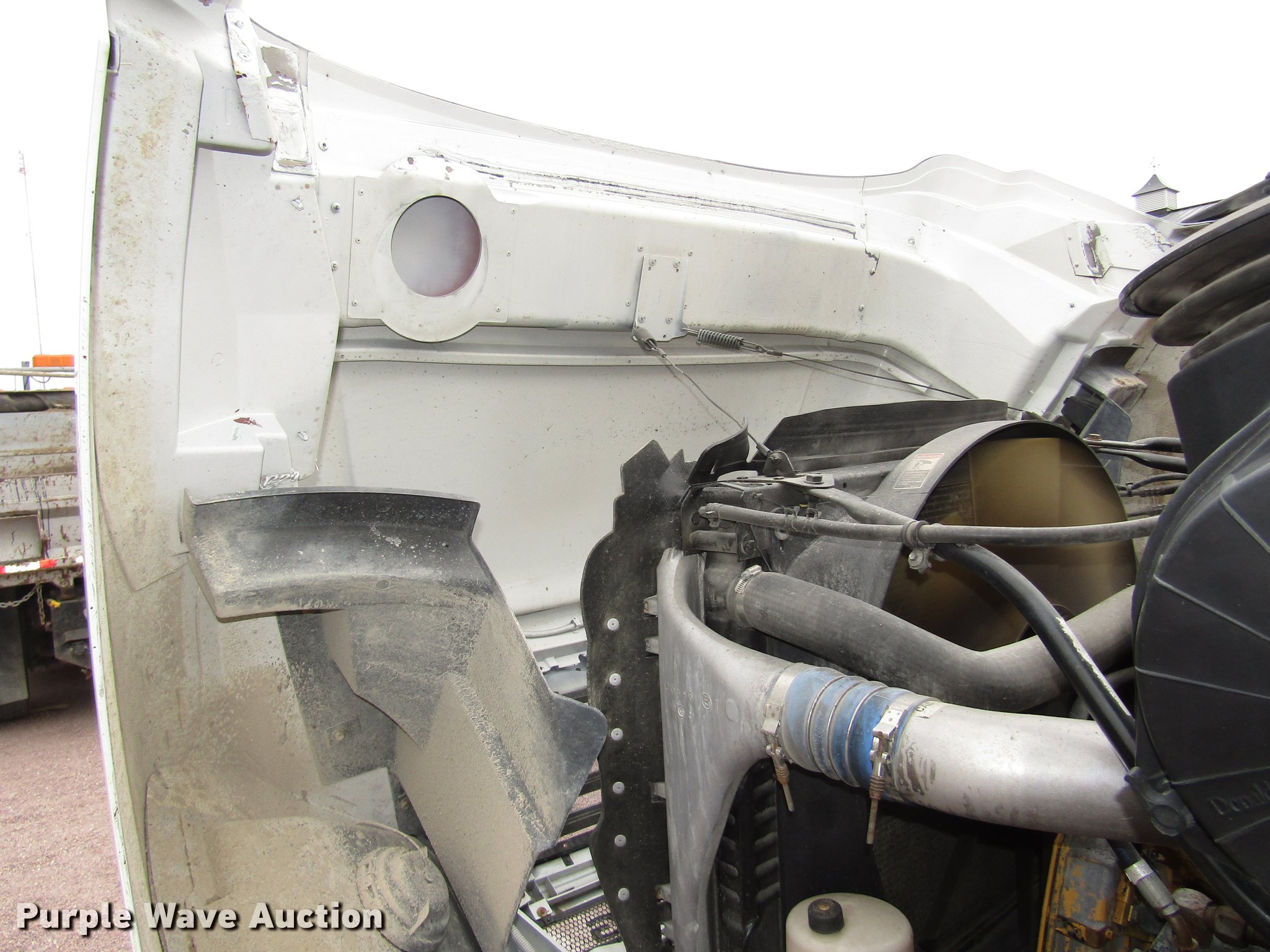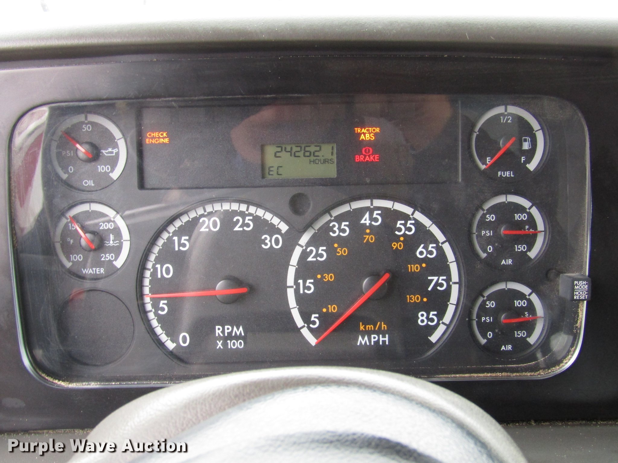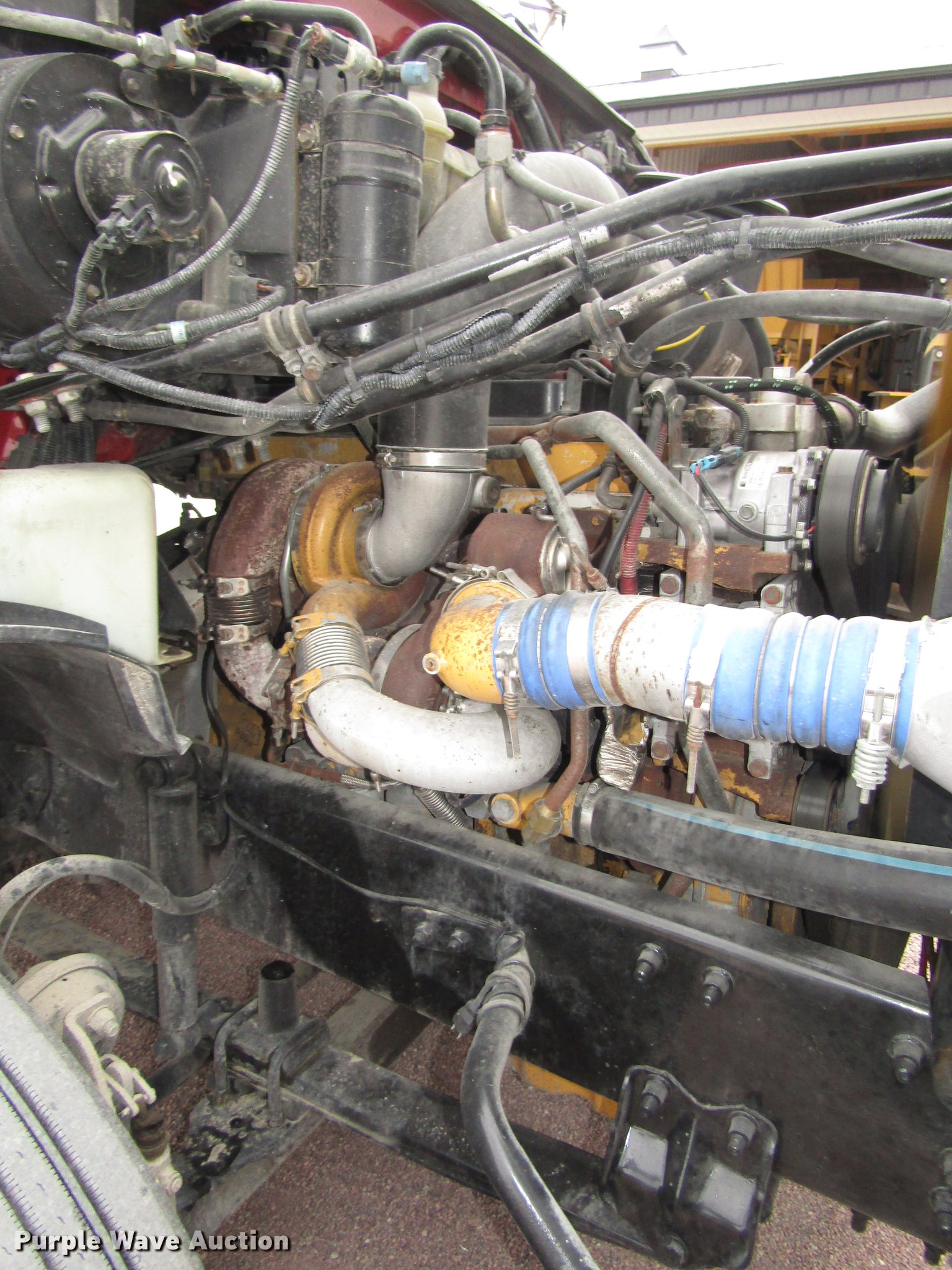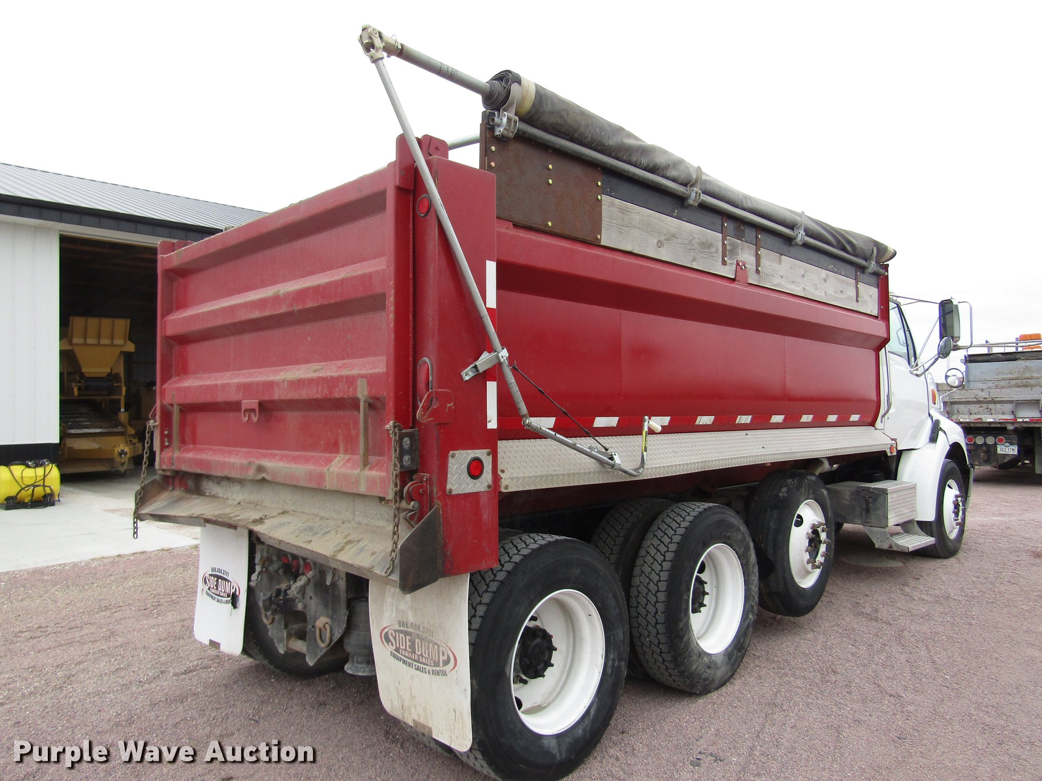 2006 Sterling AT9500 dump truck. 663,789 miles on odometer, 24,262 hours on meter, Caterpillar C13 12.5L L6 turbo diesel engine, Eaton Fuller Road Ranger 10 speed manual transmission, Axle lock, Triple axle, AC and heat, Tilt, Cruise, AM/FM/cassette, Heated mirrors, Air suspension seat, Backup alarm, PTO, Air ride cab, Exterior visor, 16'L x 100"W steel dump bed 48" side height, 16" side board height, 106" from ground to top of sides, Single ram hoist, Roll tarp, Air operated end gate, Single fuel tank, Mud flaps, Pintle hitch, Trailer wiring, Air connections, 212" wheelbase, Steerable pusher axle, Air suspension, Air brakes, Steel wheels, 295/75R22.5 front tires, 275/80R22.5 pusher axle tires, 295/75R22.5 rear tires. Iowa title. 2FWNA3DE46AW44723. Midwest Coatings. 1425 280th St. Modale, IA 51556