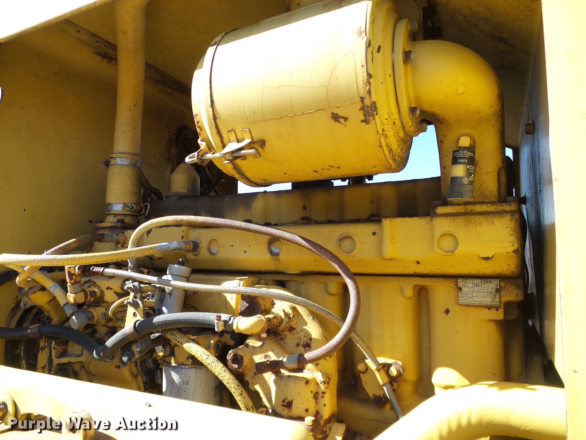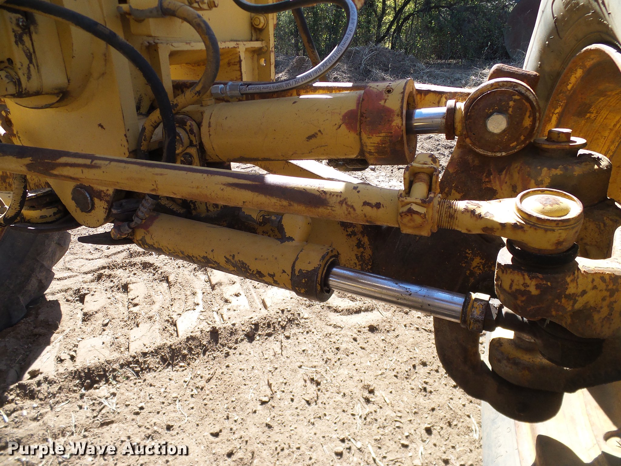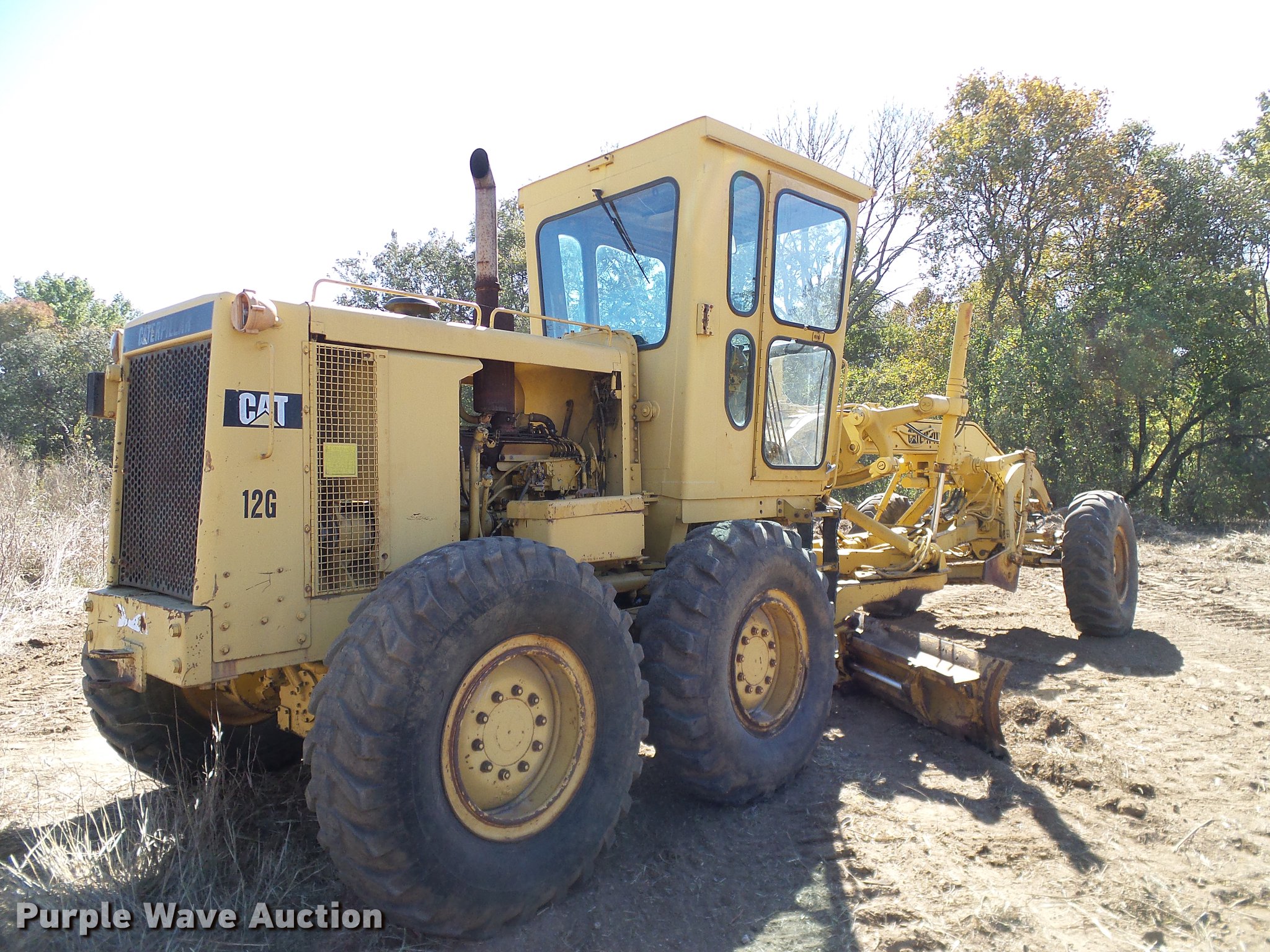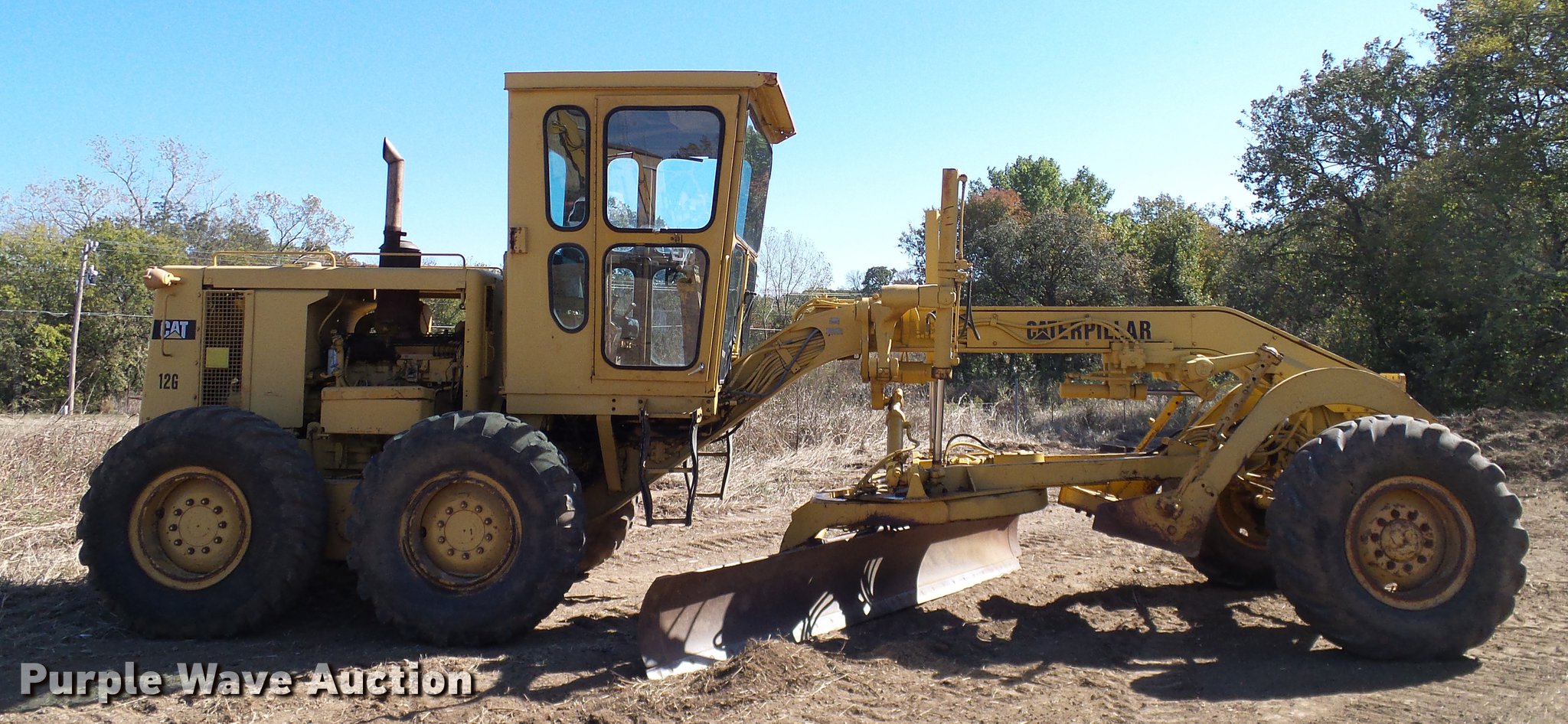 Purple Wave is selling a used Motor Grader in Oklahoma. This item is a 1976 Caterpillar 12G motor grader with the following: 608 hours on meter, Caterpillar 3306PC six cylinder turbo diesel engine, Serial 3N4536, Powershift transmission, 6F-6R gears, Differential lock, EROPS, Tilt steering, Suspension seat, Nine control valves, 14'W moldboard, Tip control, Side shift, Blade accumulators, Circle slip clutch, Front mounted scarifier, Rear pin hitch, 14.00-24 tires, Glass cracked, Serial 61M3693