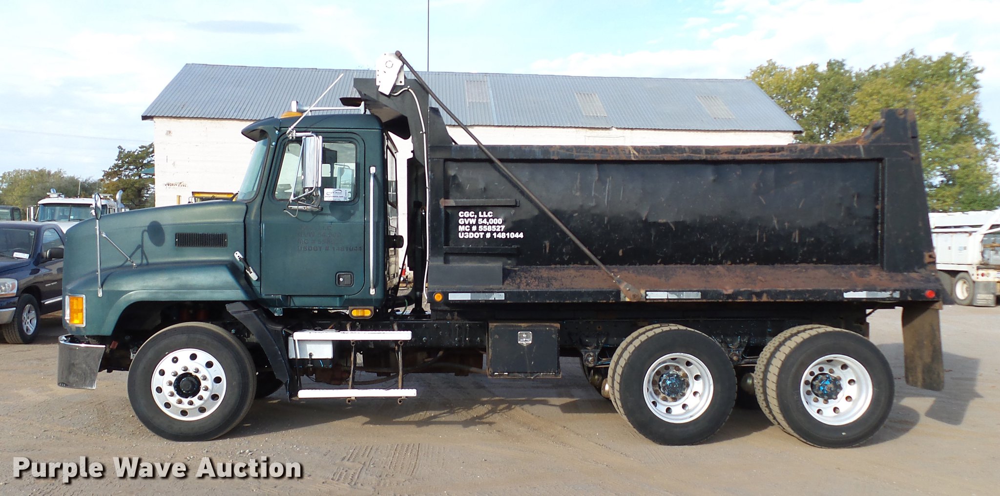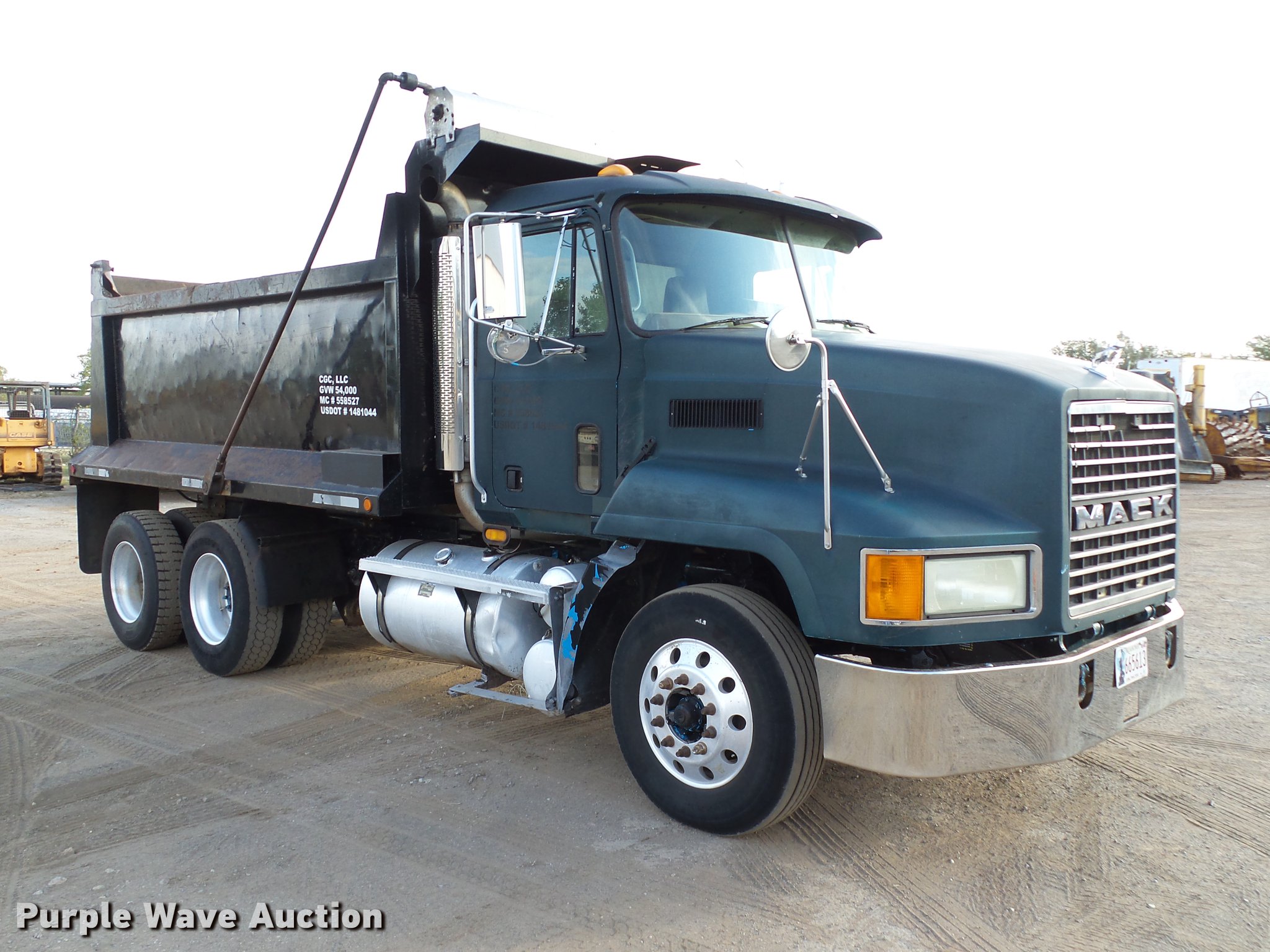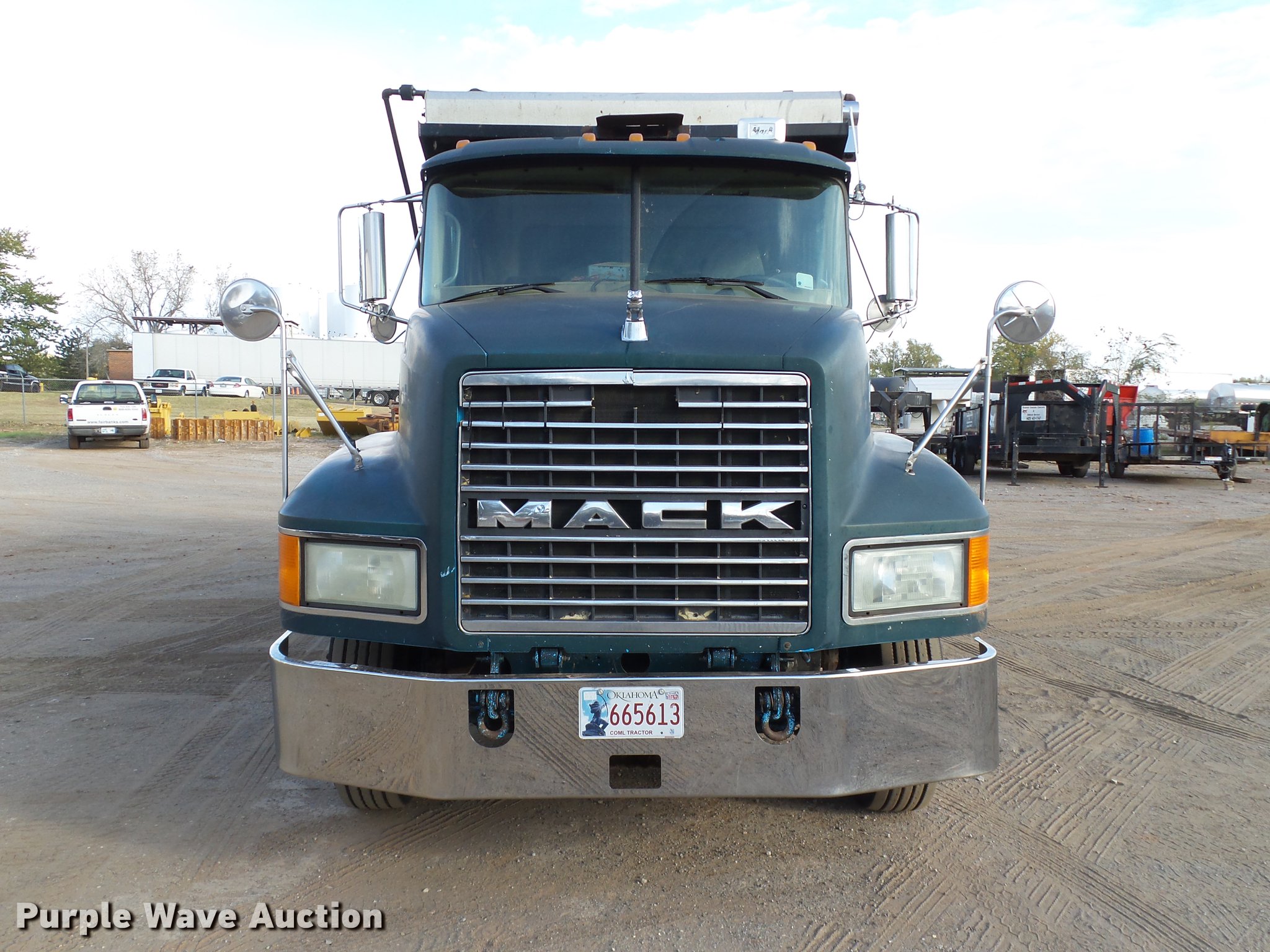 Purple Wave is selling a used Construction Dump Truck in Oklahoma. This item is a 2001 Mack CH613 dump truck with the following: 629,795 miles on odometer, 22,877 hours on meter, Mack E7 12.0L L6 turbo diesel engine, Serial 051545, Eaton Fuller 10 speed manual transmission, Tandem axle, AC and heat, Tilt, Cruise, AM/FM/CD, Power windows, Power and heated mirrors, Air suspension seat, Air ride cab, Front tow hooks, Exterior visor, PTO, 14'L x 96"W steel dump bed, 52" side height, Single ram hoist, Roll tarp, Air operated end gate, Single fuel tank, Pintle hitch, 188" wheelbase, Air suspension, Air brakes, 285/75R22.5 tires, GVWR 54,000 lbs, FAWR 14,000 lbs, IAWR 20,000 lbs, RAWR 20,000 lbs