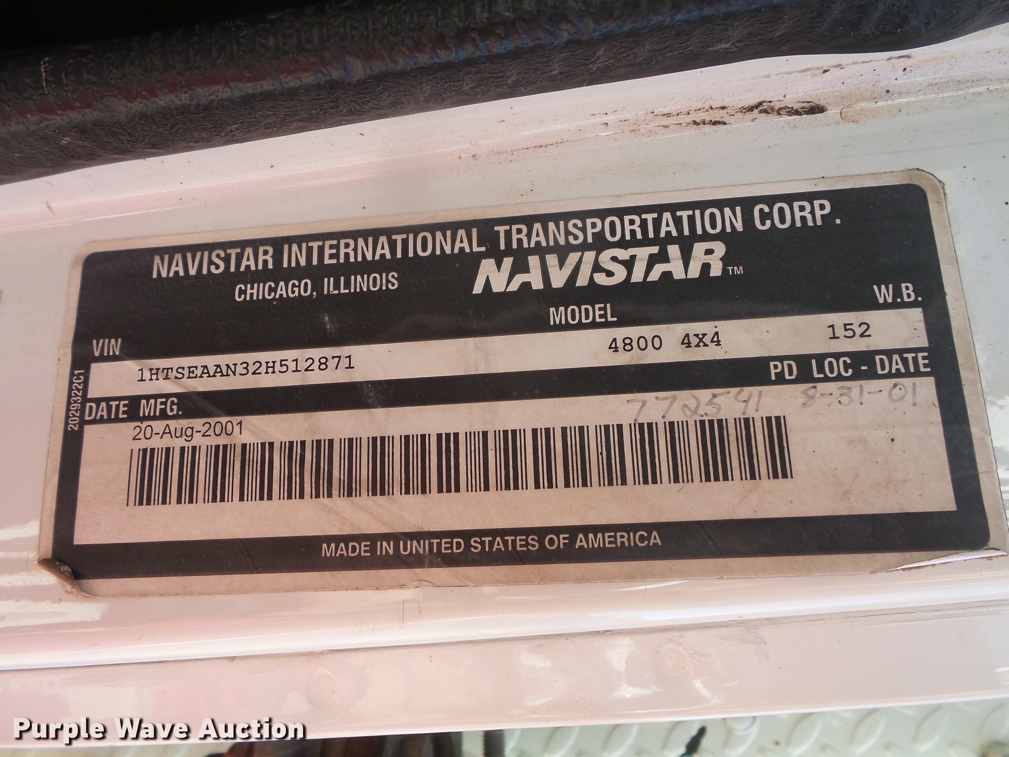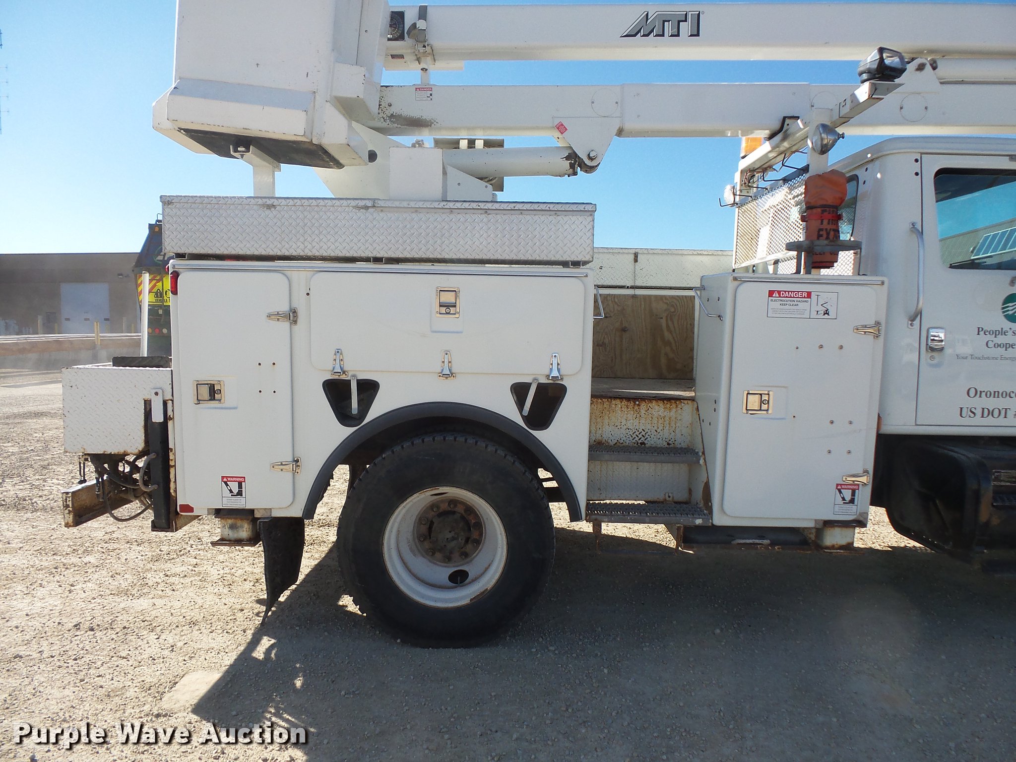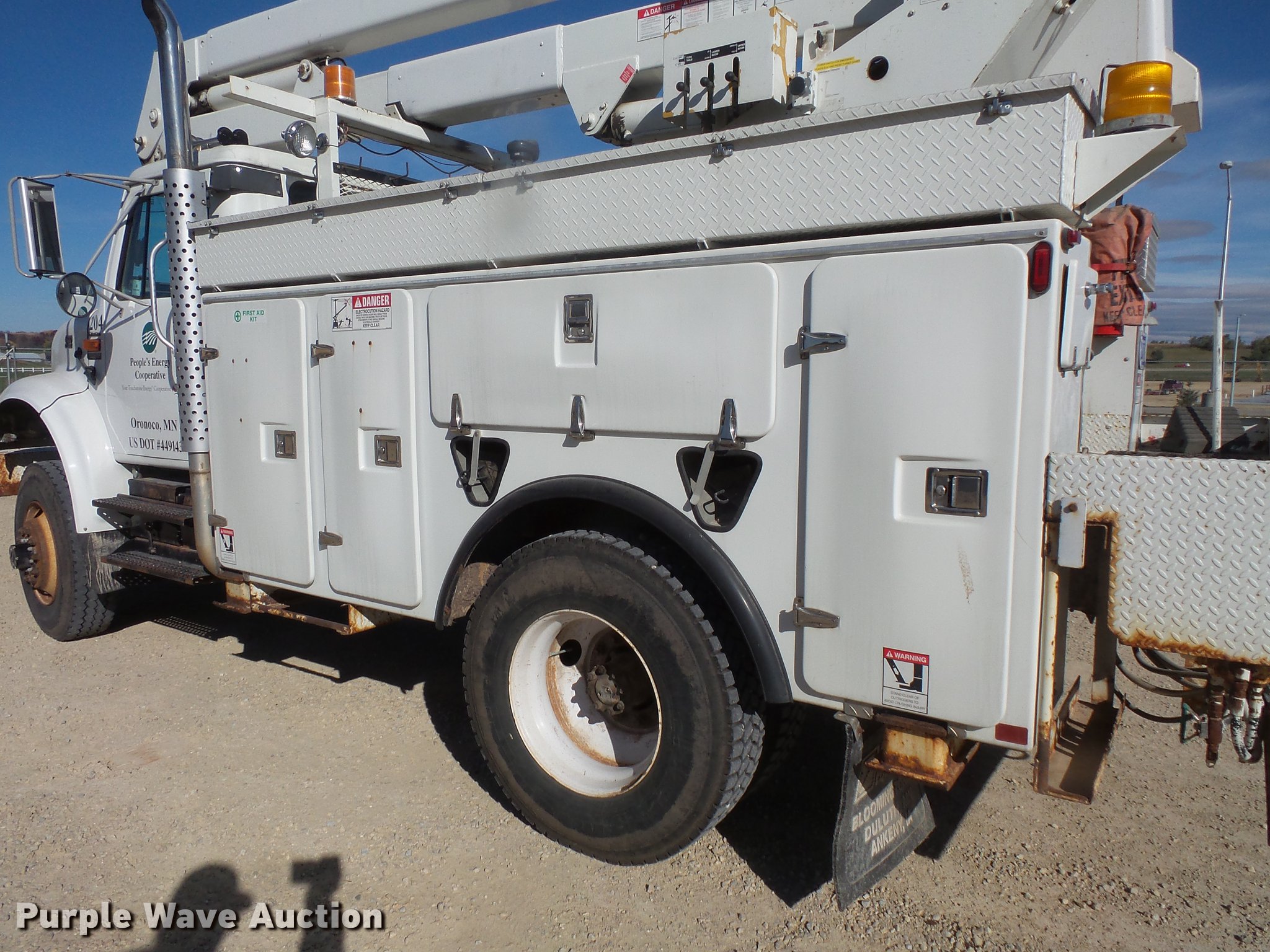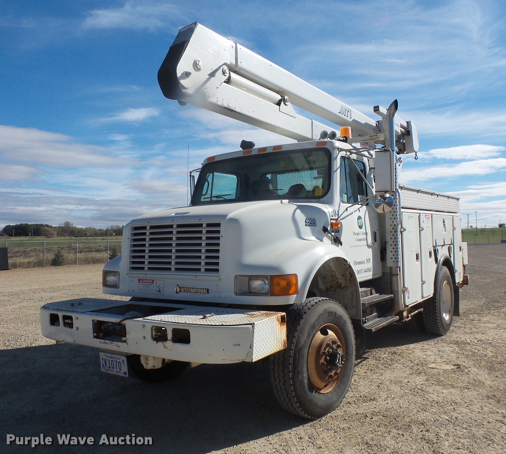 Purple Wave is selling a used Bucket Truck in Minnesota. This item is a 2002 International 4800 bucket truck with the following: 238,435 miles on odometer, 10,085 hours on meter, International CH250 7.6L L6 turbo diesel engine, Serial 470HM2U1321177, Automatic transmission, Four wheel drive, Single axle, AC and heat, Cruise, AM/FM, Air suspension seat, Auxiliary controls, Front tow hooks, Beacon light, Single exhaust stack, Front winch, PTO, Astoria service bed, 11'L, Shelving, Slide-out drawers, (2) aluminum toolboxes, Serial 2252-01-8, 2001 MTI G5-421P-4TFS1 boom, 350 lbs max lift capacity, Man basket, 42' max lift height, Ground and platform boom controls, Boom rotation, Articulating boom, Remote hydraulics, Rope material handler, (4) outriggers, Serial 87860108, Single fuel tank, Receiver hitch, Trailer wiring, Spring suspension, Air brakes, 11R22.5 tires, GVWR 31,000 lbs, DOT inspection completed in October 2017, View inspection report