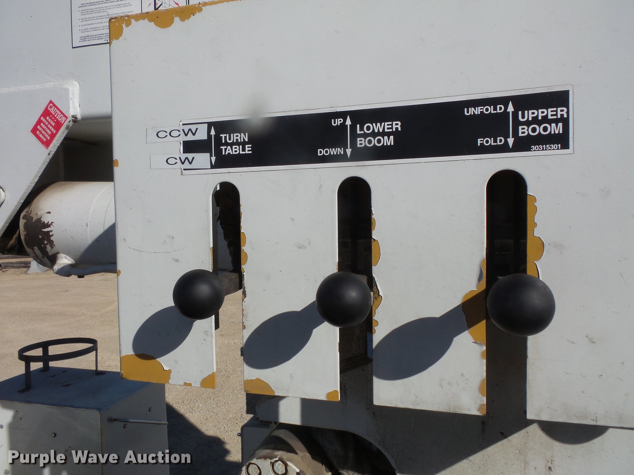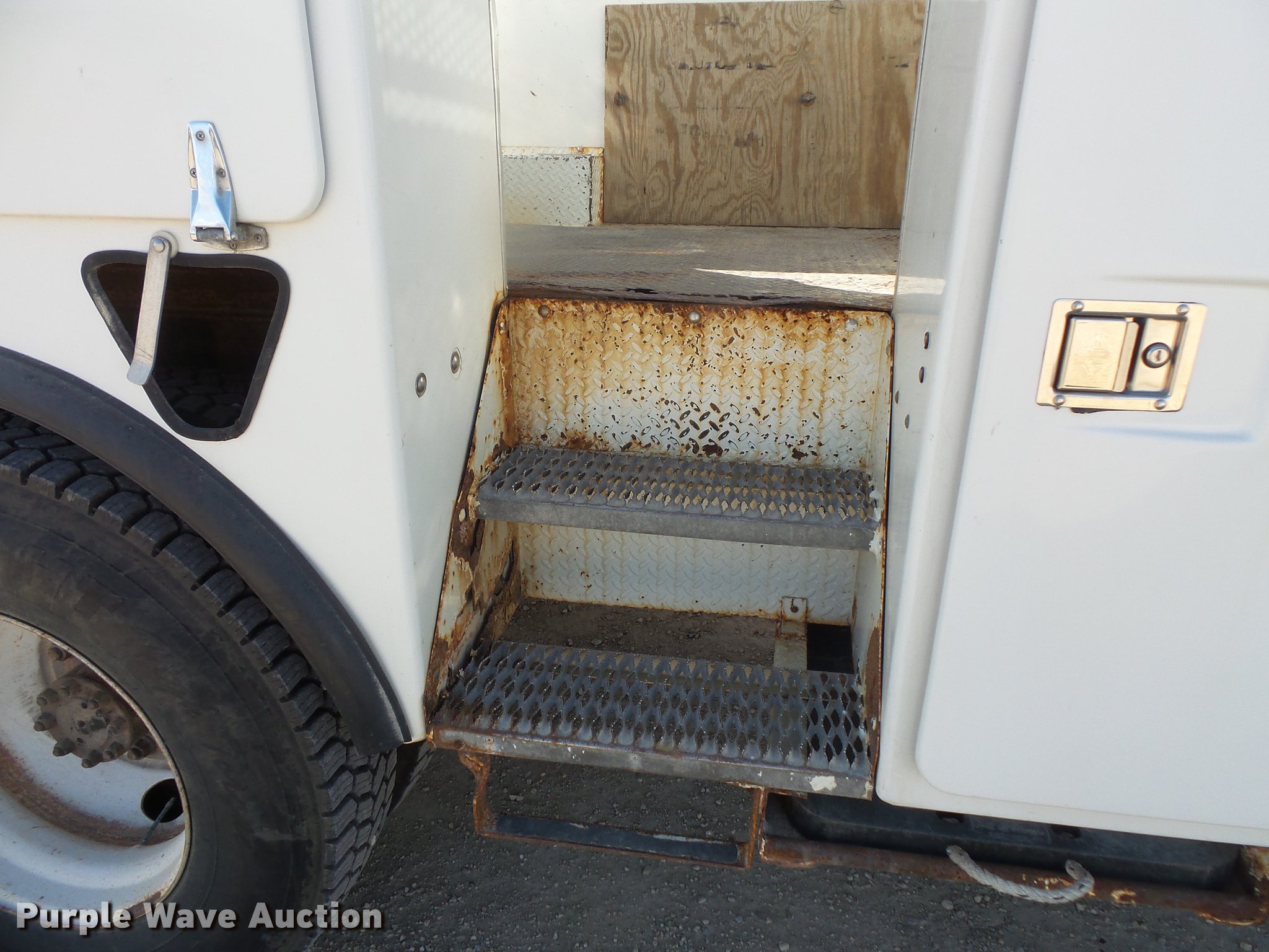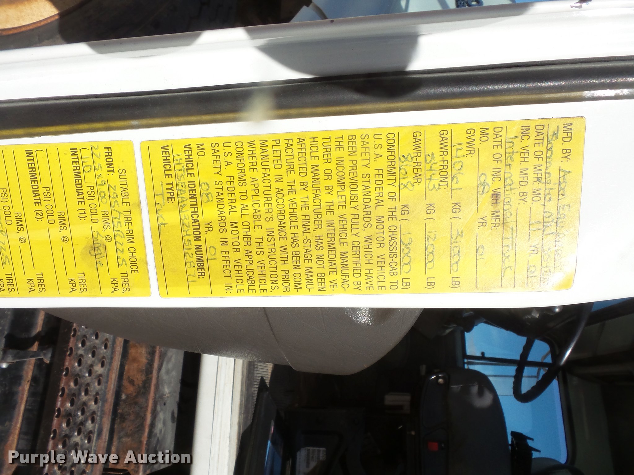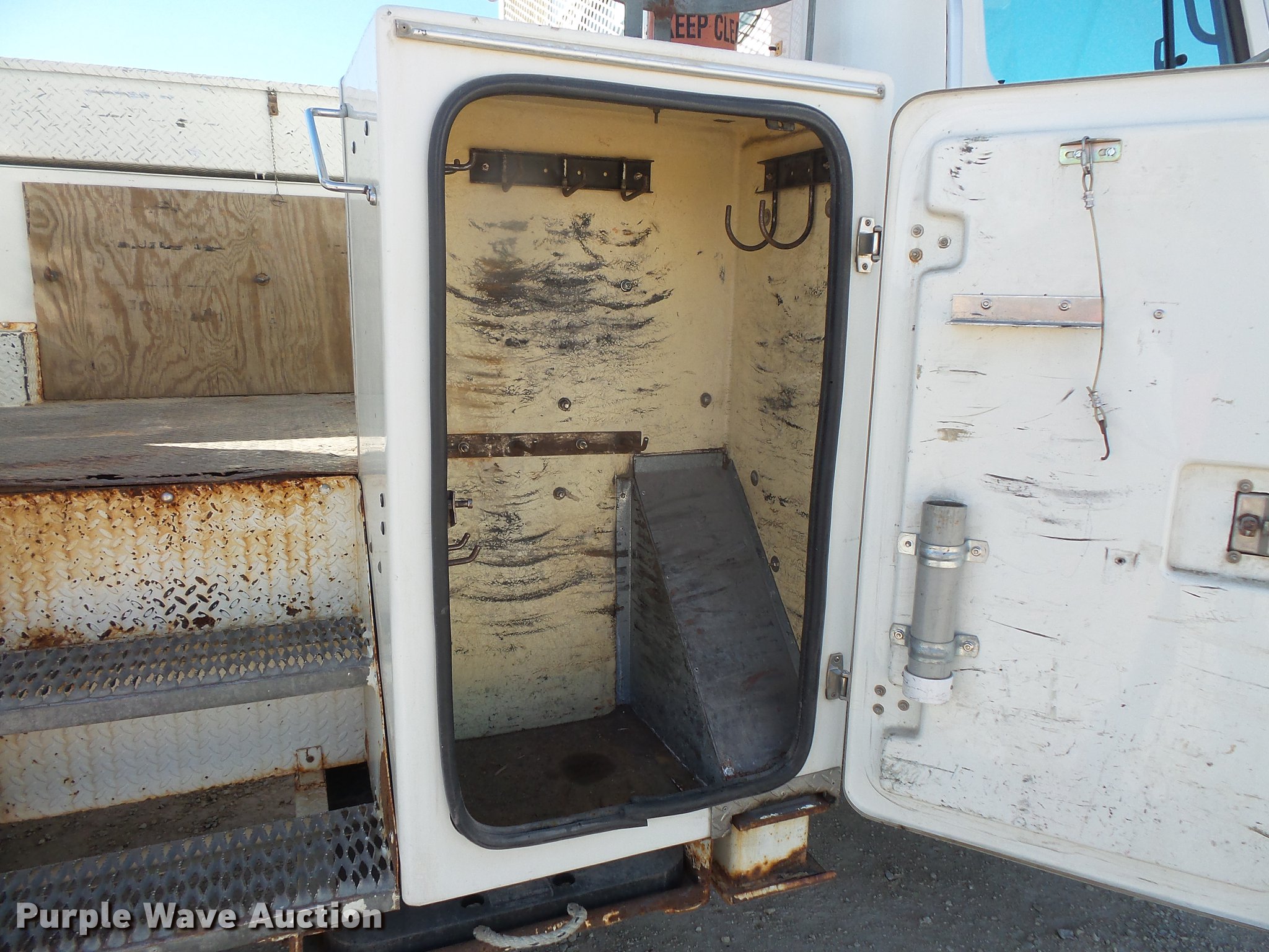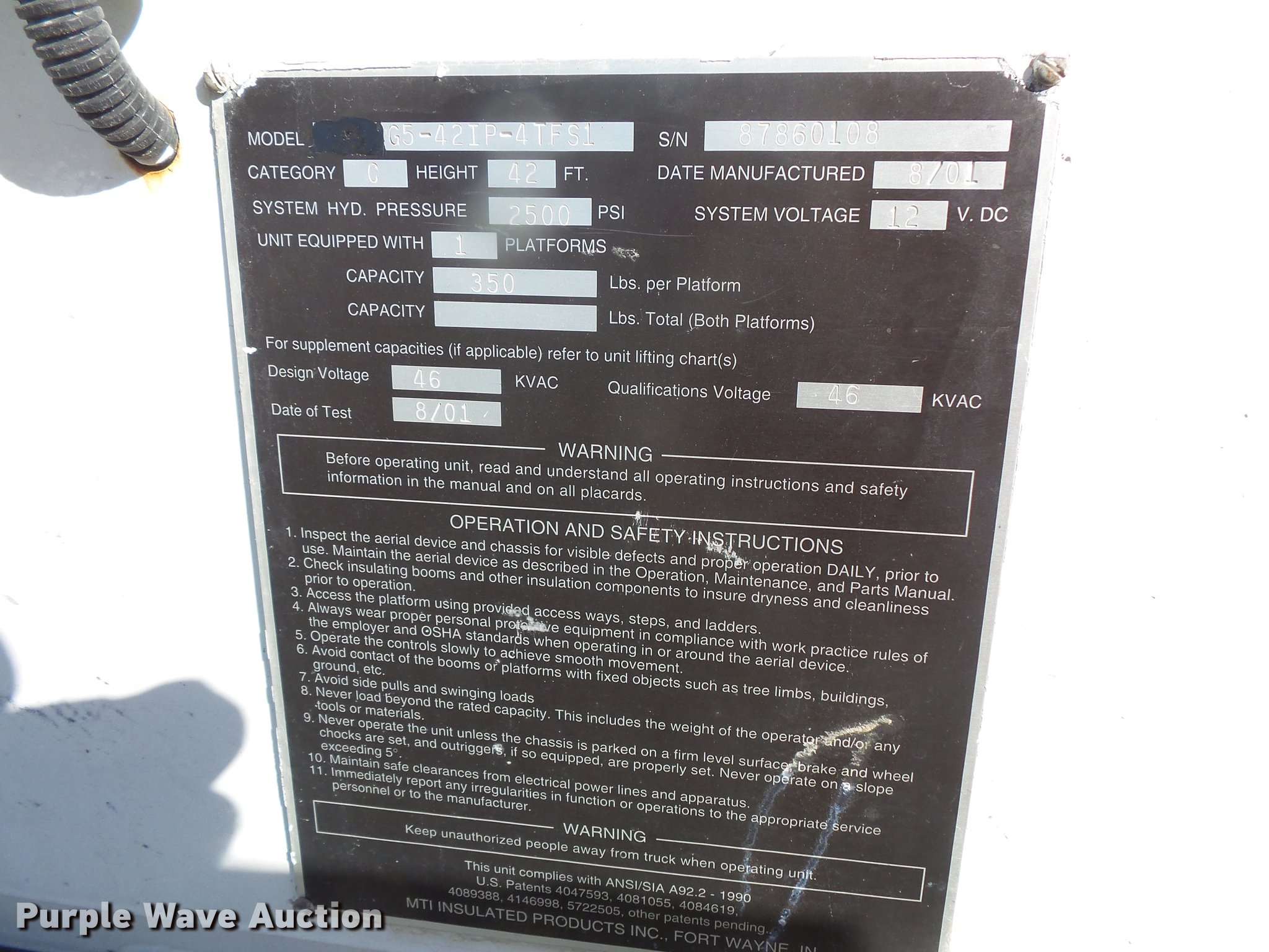 Purple Wave is selling a used Bucket Truck in Minnesota. This item is a 2002 International 4800 bucket truck with the following: 238,435 miles on odometer, 10,085 hours on meter, International CH250 7.6L L6 turbo diesel engine, Serial 470HM2U1321177, Automatic transmission, Four wheel drive, Single axle, AC and heat, Cruise, AM/FM, Air suspension seat, Auxiliary controls, Front tow hooks, Beacon light, Single exhaust stack, Front winch, PTO, Astoria service bed, 11'L, Shelving, Slide-out drawers, (2) aluminum toolboxes, Serial 2252-01-8, 2001 MTI G5-421P-4TFS1 boom, 350 lbs max lift capacity, Man basket, 42' max lift height, Ground and platform boom controls, Boom rotation, Articulating boom, Remote hydraulics, Rope material handler, (4) outriggers, Serial 87860108, Single fuel tank, Receiver hitch, Trailer wiring, Spring suspension, Air brakes, 11R22.5 tires, GVWR 31,000 lbs, DOT inspection completed in October 2017, View inspection report