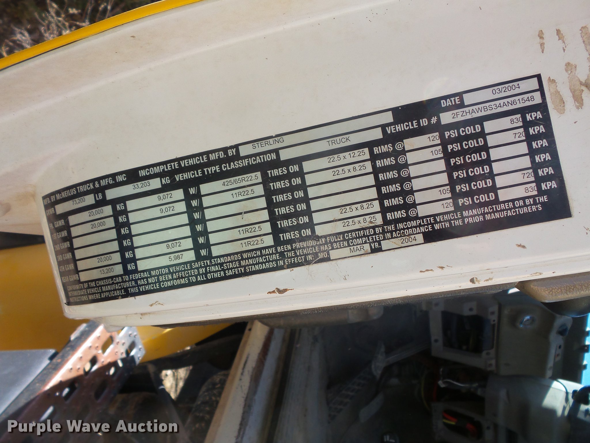 2004 Sterling L8500 ready mix truck. Unknown miles on odometer, Cummins ISC 8.3L L6 diesel engine, Eaton Fuller Road Ranger 8LL manual transmission, Tandem axle, Inter-axle differential lock, PTO, McNeilus 9.5 cu.yd. steel mixer bed Rear drum controls, (3) chute extensions, 125 gallon water tank, Serial 70859, Walking beam suspension, Air brakes, Engine brake, 285/75R24.5 front tires, 11R22.5 rear tires, GVWR 73,200 lbs, FAWR 20,000 lbs, IAWR 20,000 lbs, RAWR 20,000 lbs, 13,200 lbs tag axle, Parts missing, Non-operational Vehicle. Iowa title. 2FZHAWBS34AN61548. GCC Ready Mix. 4485 Hwy 60 Blvd. Alton, IA 51003