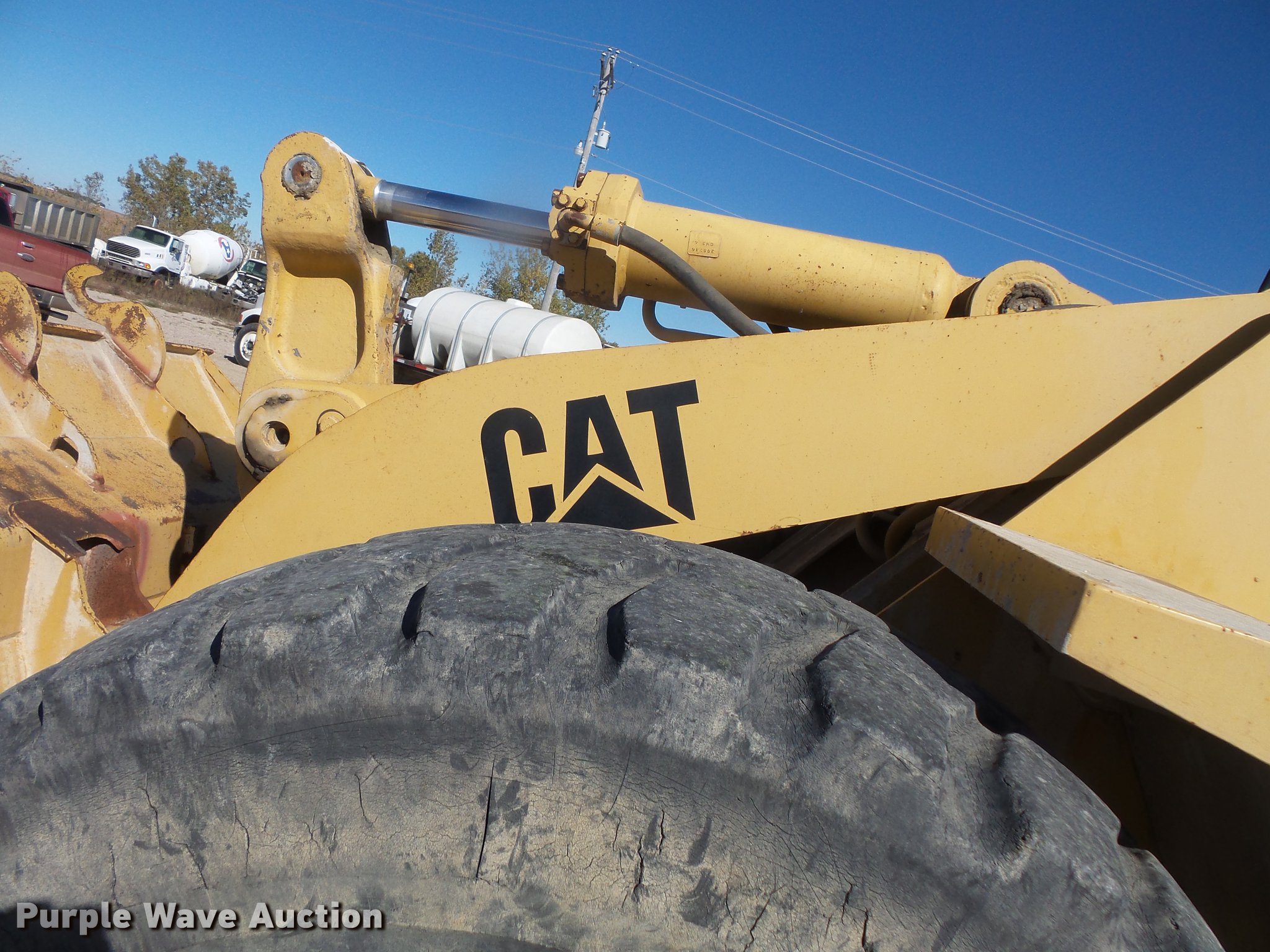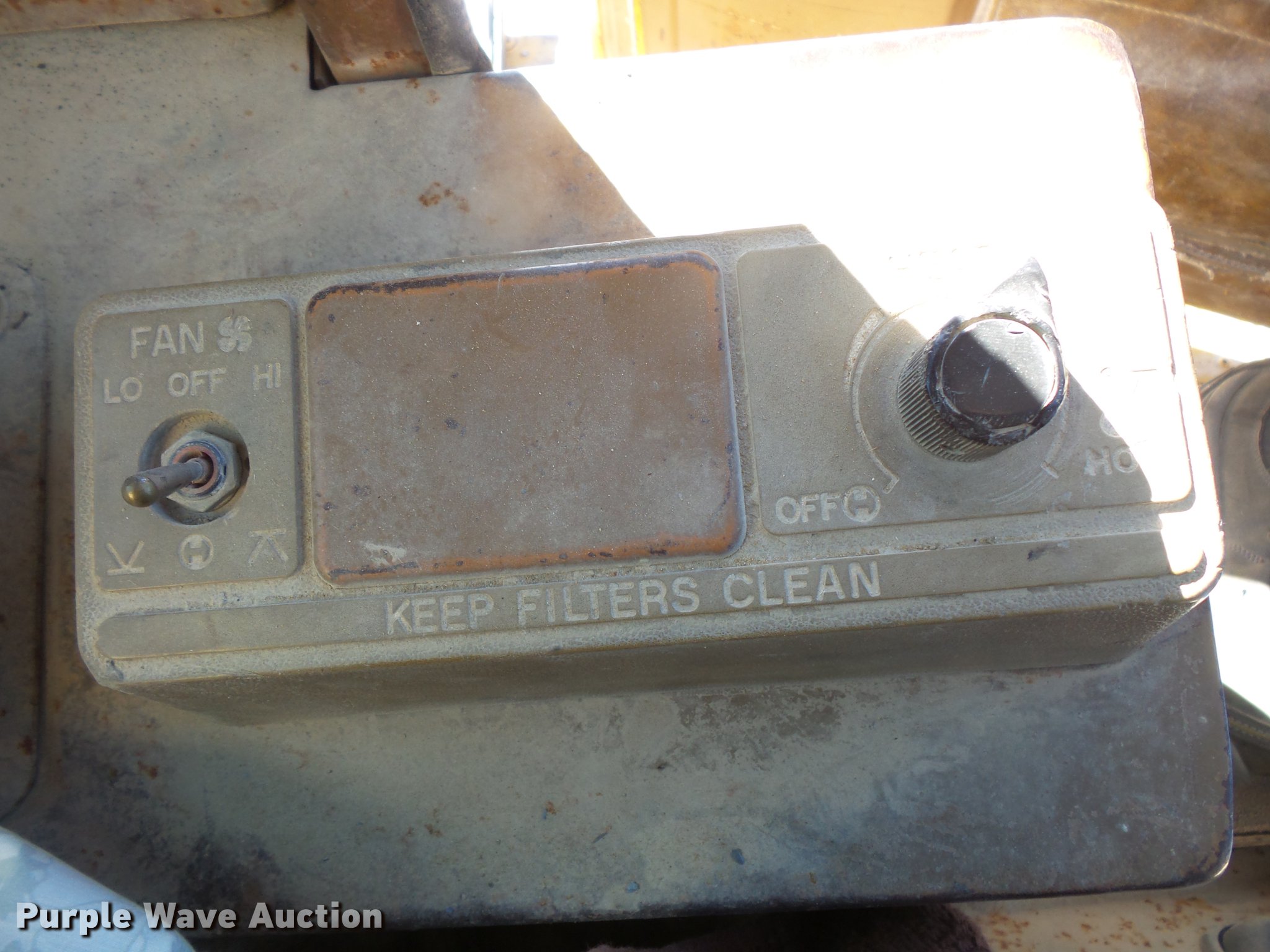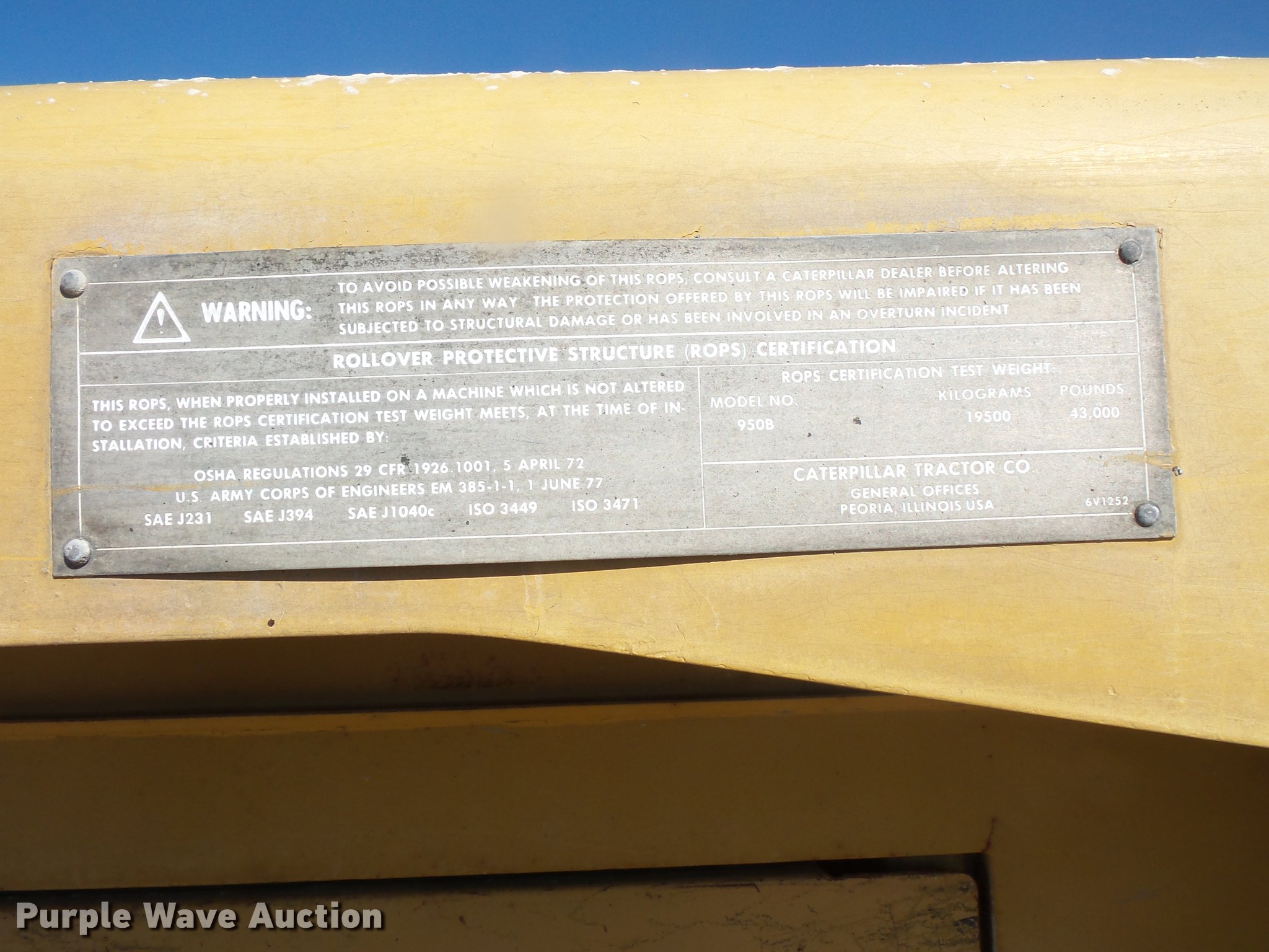 Purple Wave is selling a used Wheel Loader in Iowa. This item is a 1983 Caterpillar 950B wheel loader with the following: 1,980 hours on meter, Caterpillar four cylinder diesel engine, Powershift transmission, 4F-4R gears, Enclosed cab, Heat, Tilt steering wheel, Two-lever bucket controls, Wipers, Front and rear work lights, 106"W general purpose bucket, Bolt-on cutting edge, Counterweights, 23.5R25 tires, Serial 31R00957