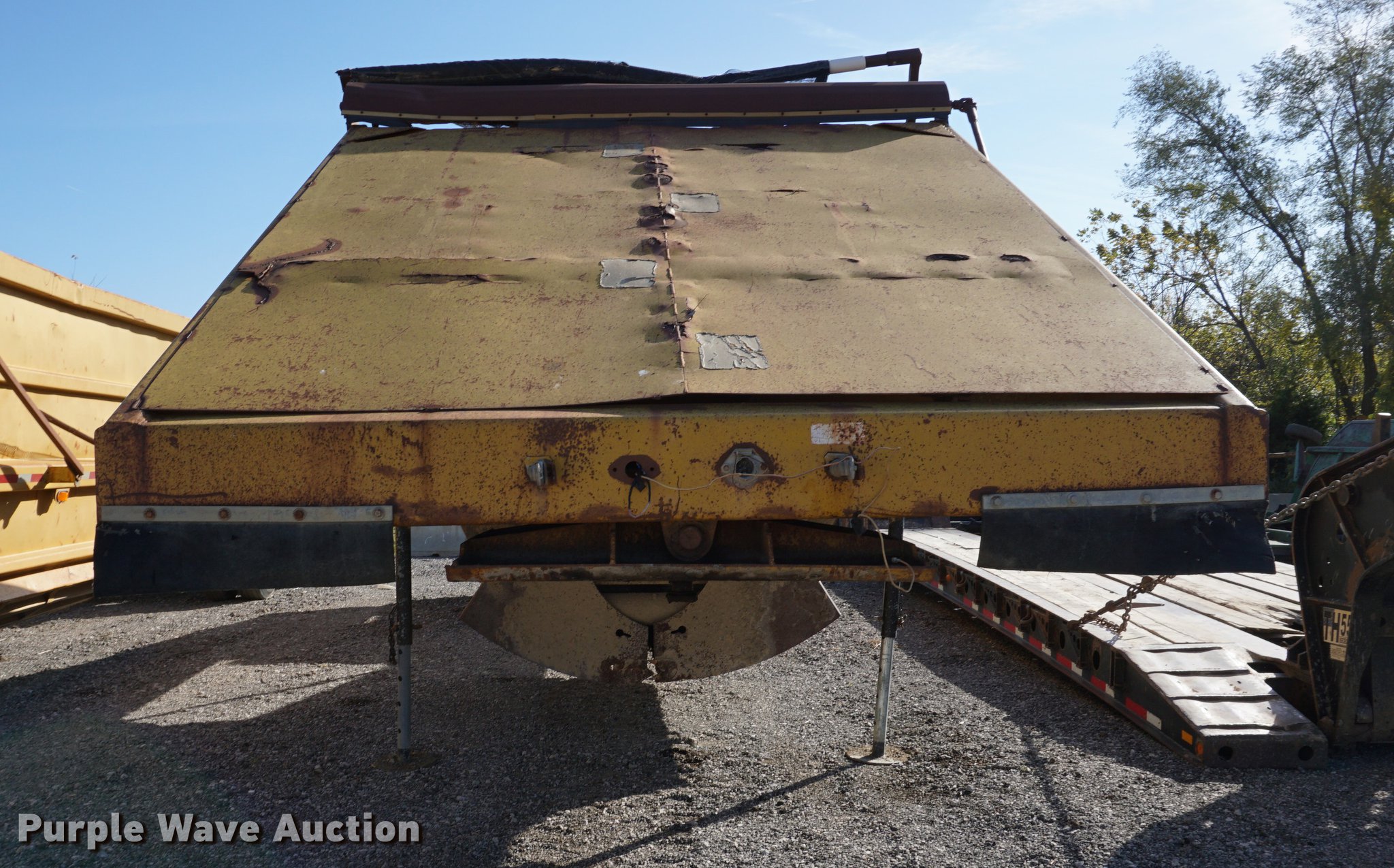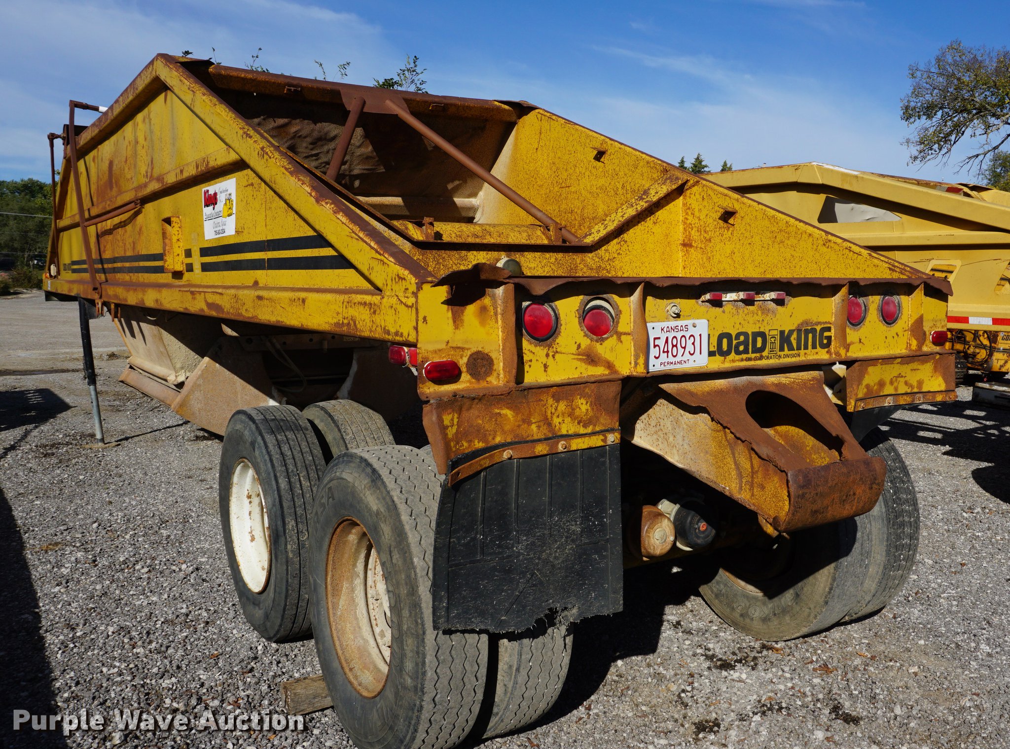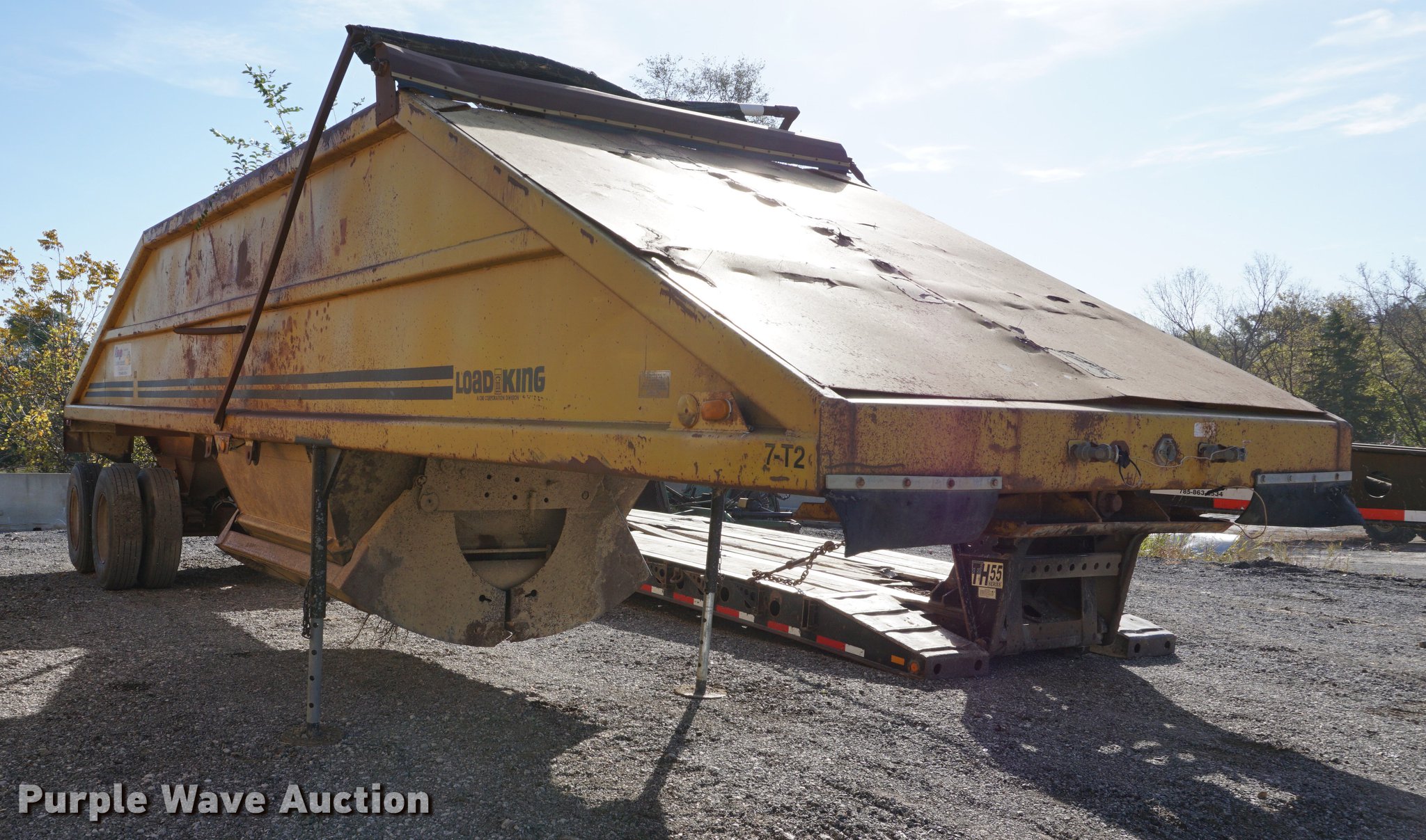Purple Wave is selling a used Bottom Dump Trailer in Kansas. This item is a 1985 Load King bottom dump trailer with the following: 35'L x 96"W, Steel construction, Air operated clamshell gate, Manual tarp, Dual leg landing gear, Fifth wheel plate, Tandem axle, Spring suspension, Air brakes, Steel wheels, 11R22.5 tires, Unit# 7-T2