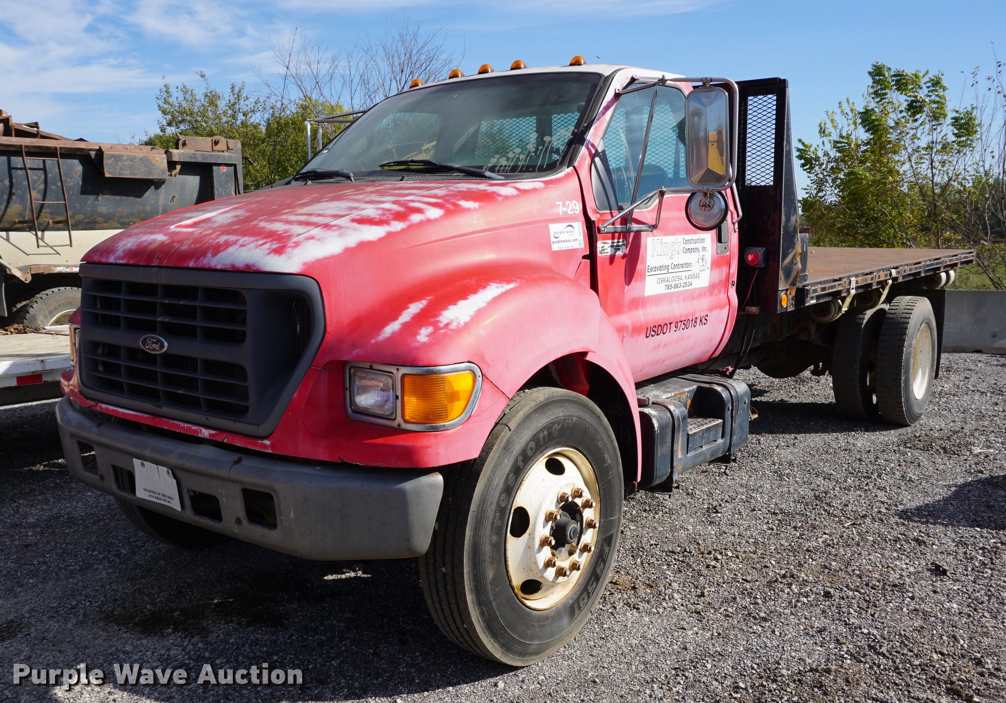 2000 Ford F650 flatbed truck. 226,782 miles on odometer, 7.3L V8 turbo diesel engine, Six speed manual transmission, Single axle, AC and heat, AM/FM, 16'L x 96"W flatbed Stake side pockets, Ratchet tie downs, Dual fuel tanks, Spring suspension, Hydraulic brakes, 10-22.5 tires, Battery dead. Kansas title. Title distribution may be delayed up to 14 days from verification of funds. 3FDNF6566YMA05227. King Construction. 205 Walnut St. Oskaloosa, KS 66066