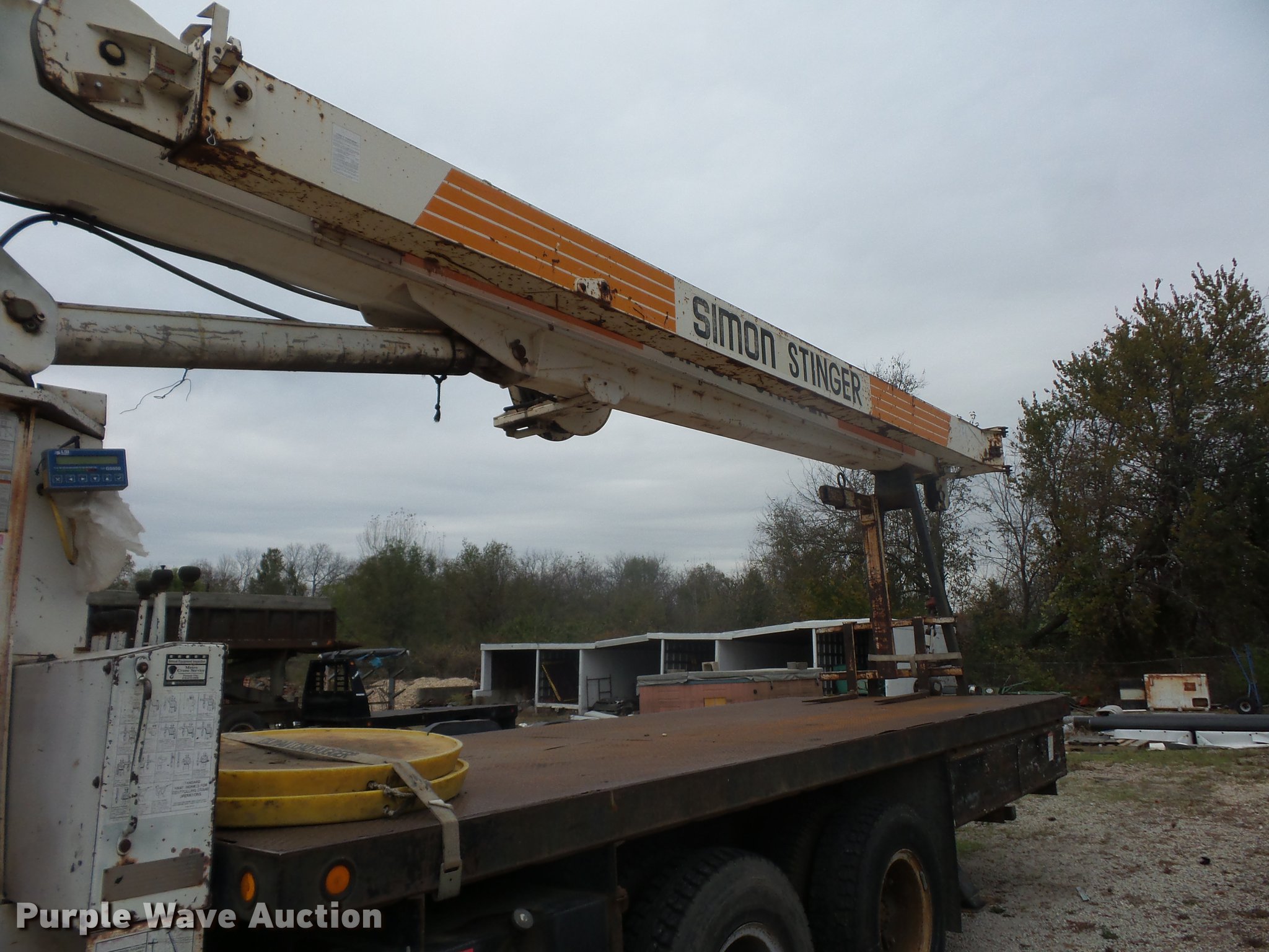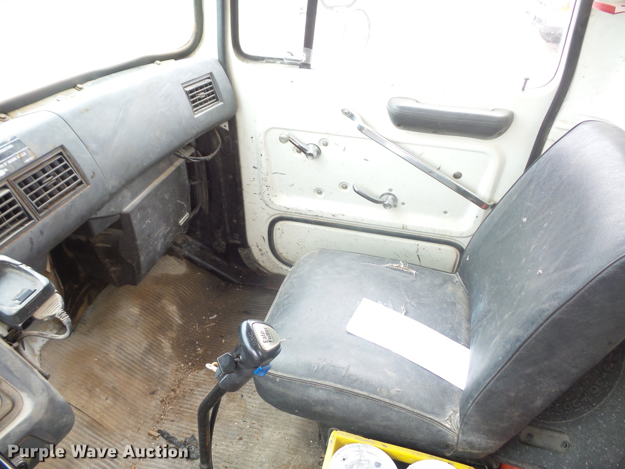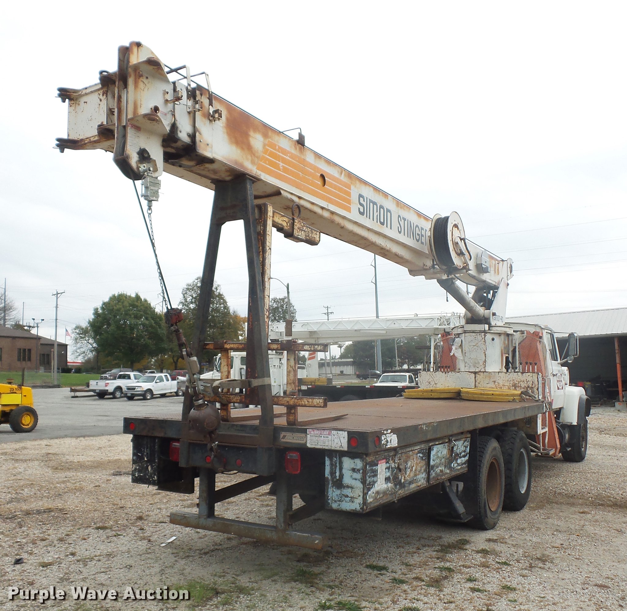 Purple Wave is selling a used Crane Truck in Missouri. This item is a 1989 Ford LT8000 crane truck with the following: 113,690 miles on odometer, 7.8L L6 turbo diesel engine, Eaton Fuller 13 speed manual transmission, Tandem axle, AC and heat, AM/FM, Air suspension seat, Simon Stinger TC3474 crane, 34,000 lbs maximum lift capacity, 118' maximum lift height, 24' extendable jib, Ground boom controls, Boom rotation, Crane ball & hook, Telescopic boom, (4) outriggers, Serial 4960793103, Pallet lifting attachment, Spring over walking beam suspension, Air brakes, 385/65R22.5 tires