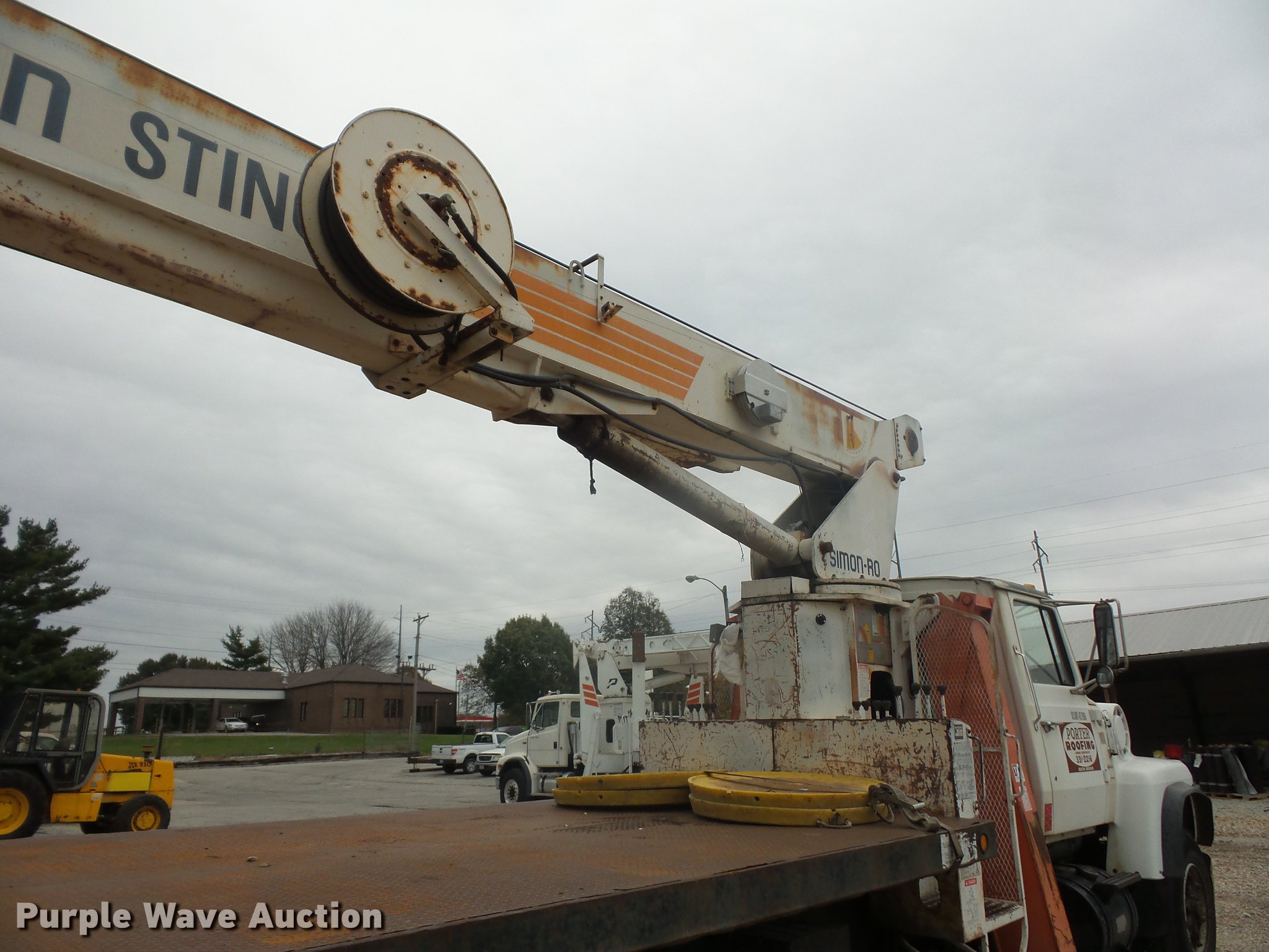 1989 Ford LT8000 crane truck. 113,690 miles on odometer, 7.8L L6 turbo diesel engine, Eaton Fuller 13 speed manual transmission, Tandem axle, AC and heat, AM/FM, Air suspension seat, Simon Stinger TC3474 crane 34,000 lbs maximum lift capacity, 118' maximum lift height, 24' extendable jib, Ground boom controls, Boom rotation, Crane ball & hook, Telescopic boom, (4) outriggers, Serial 4960793103, Pallet lifting attachment, Spring over walking beam suspension, Air brakes, 385/65R22.5 tires. Missouri title. 1FDYU82A9KVA38405. PJM Leasing Inc.. 144 Markey Rd. Belton, MO 64012