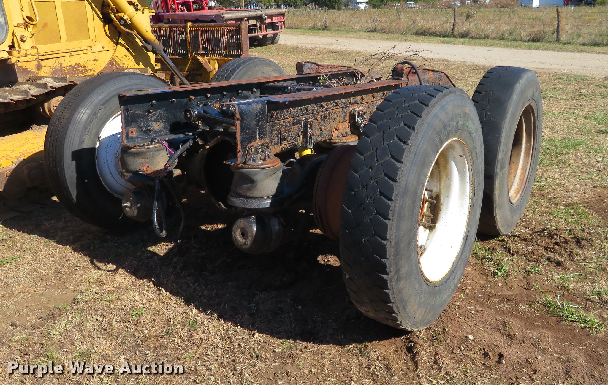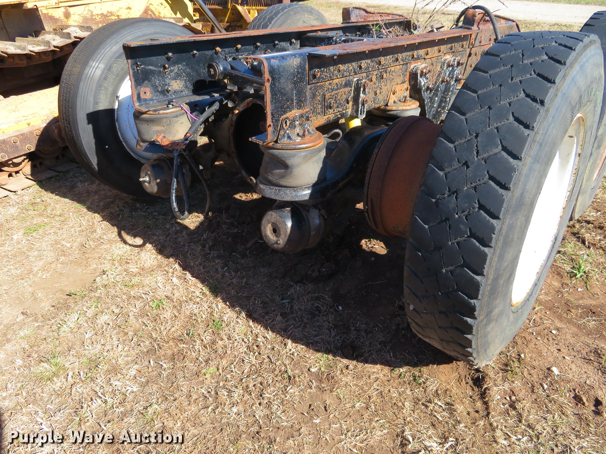 Purple Wave is selling a used Truck Part and Attach. in Kansas. This item is a Rear truck frame with the following: Eight bag air suspension, 11R24.5 tires, No axle shafts, No third members, Removed from semi truck