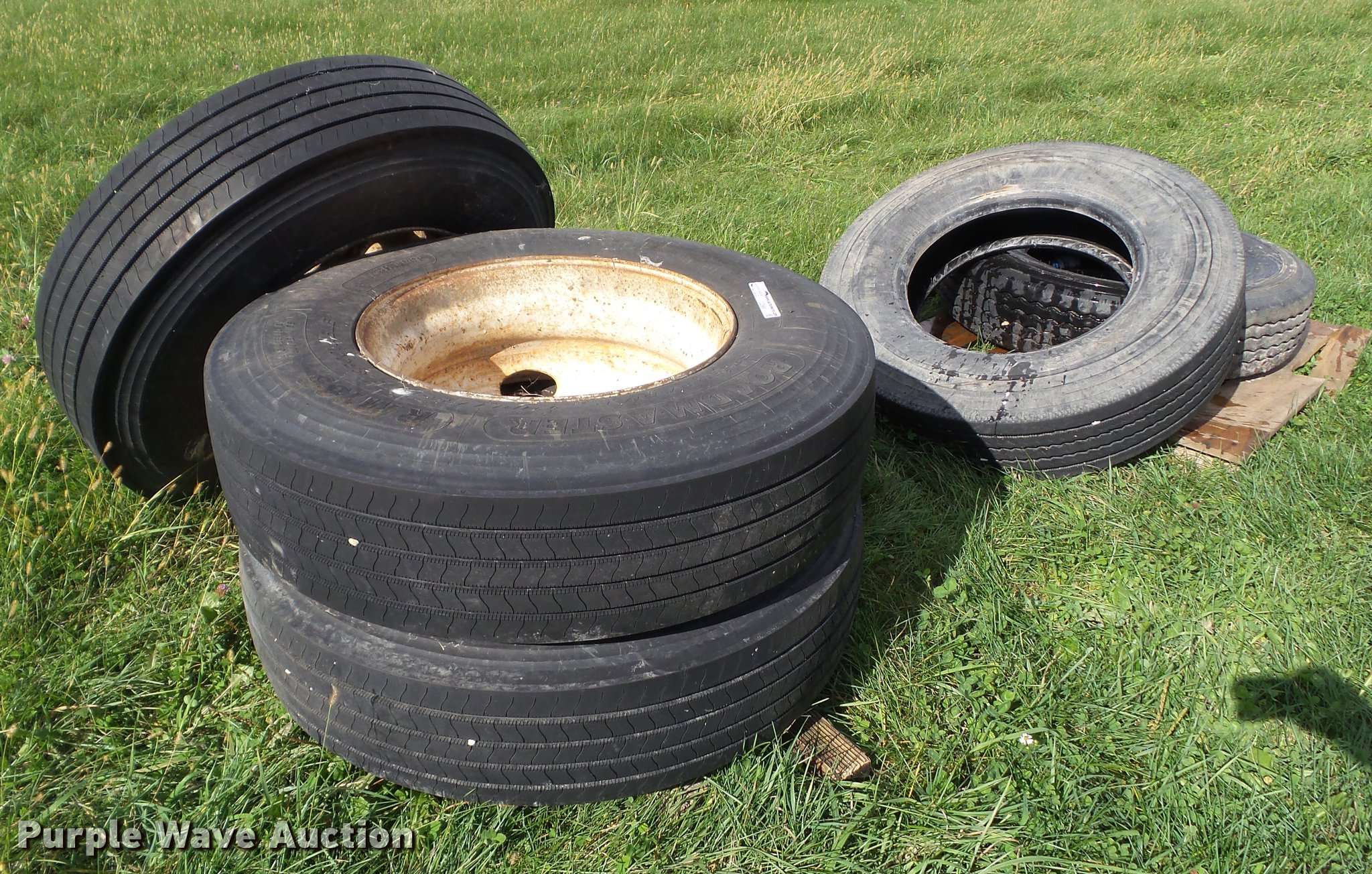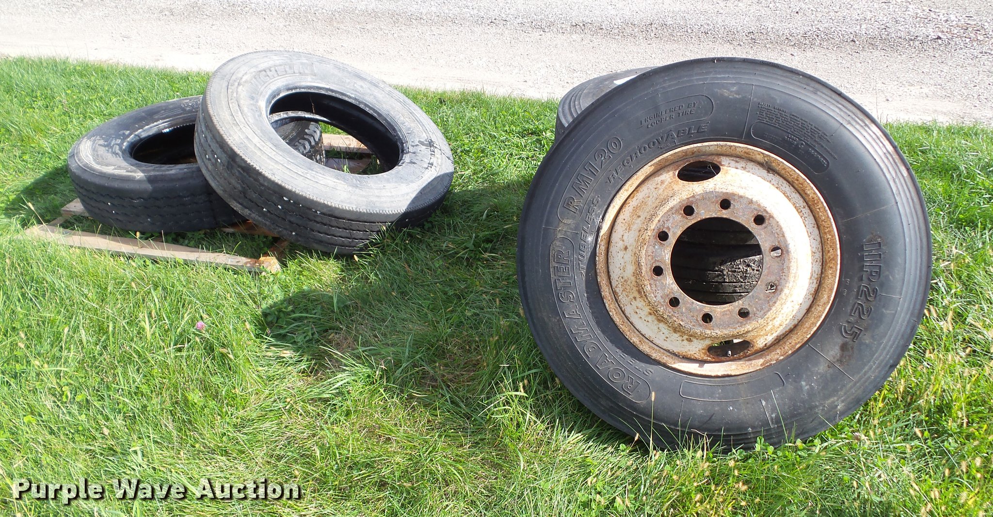 Purple Wave is selling a used Fleet Tires in Iowa. This item is a (5) tires with the following: (3) Roadmaster 11R22.5 tires with steel wheels, Michelin 11R22.5 tire, New Pride 11R22.5 tire