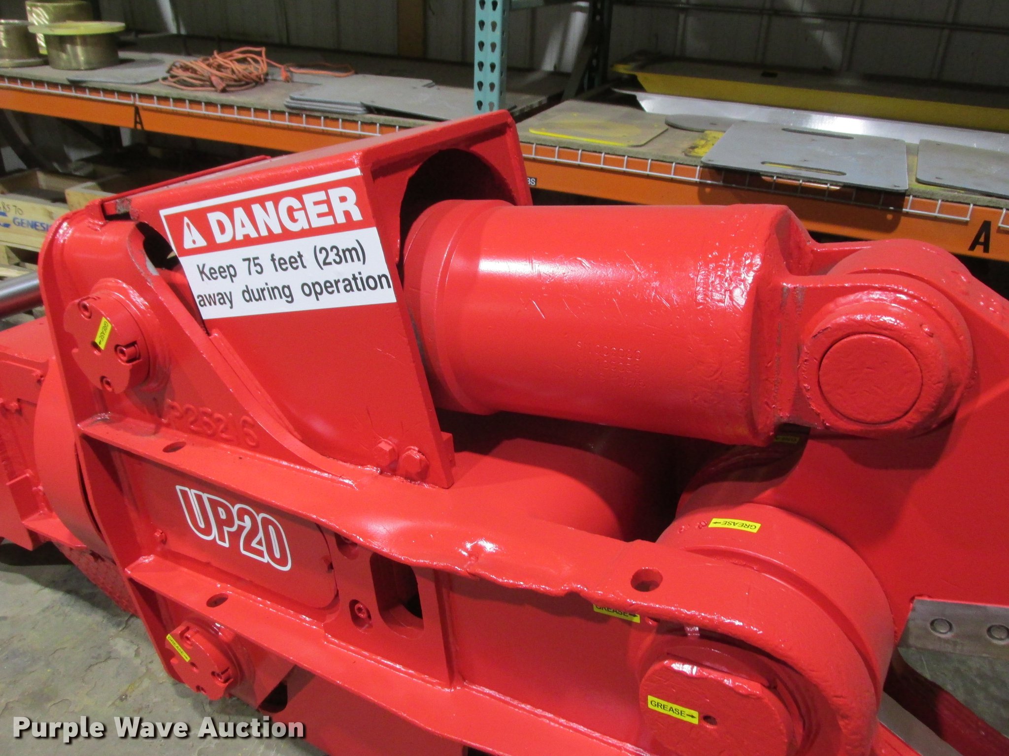 La Bounty UP20 universal processor. (2) jaw sets, 18" shear jaw opening, 29" concrete cracking jaw opening, 19.5" on center pin spacing, 3" pin diameter, Full rotation, 4,500 lbs. base operating weight. Genesis Attachments LLC.. 1000 Genesis Dr. Superior, WI 54880