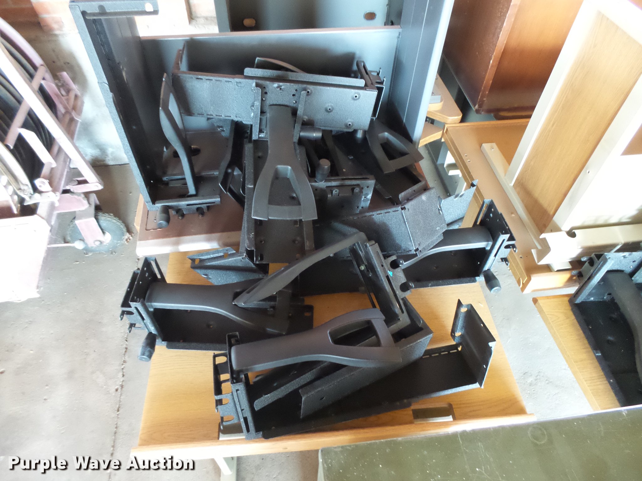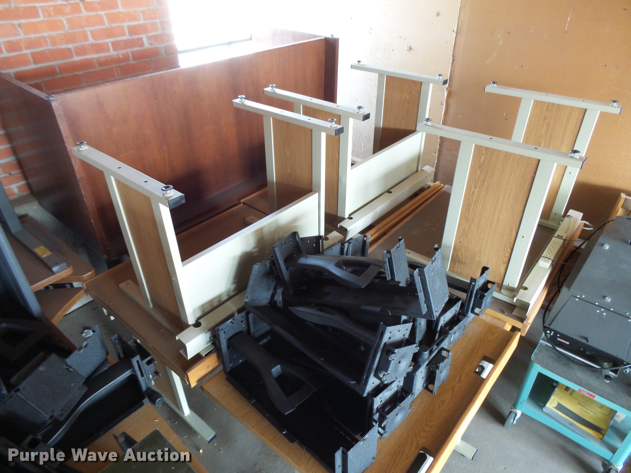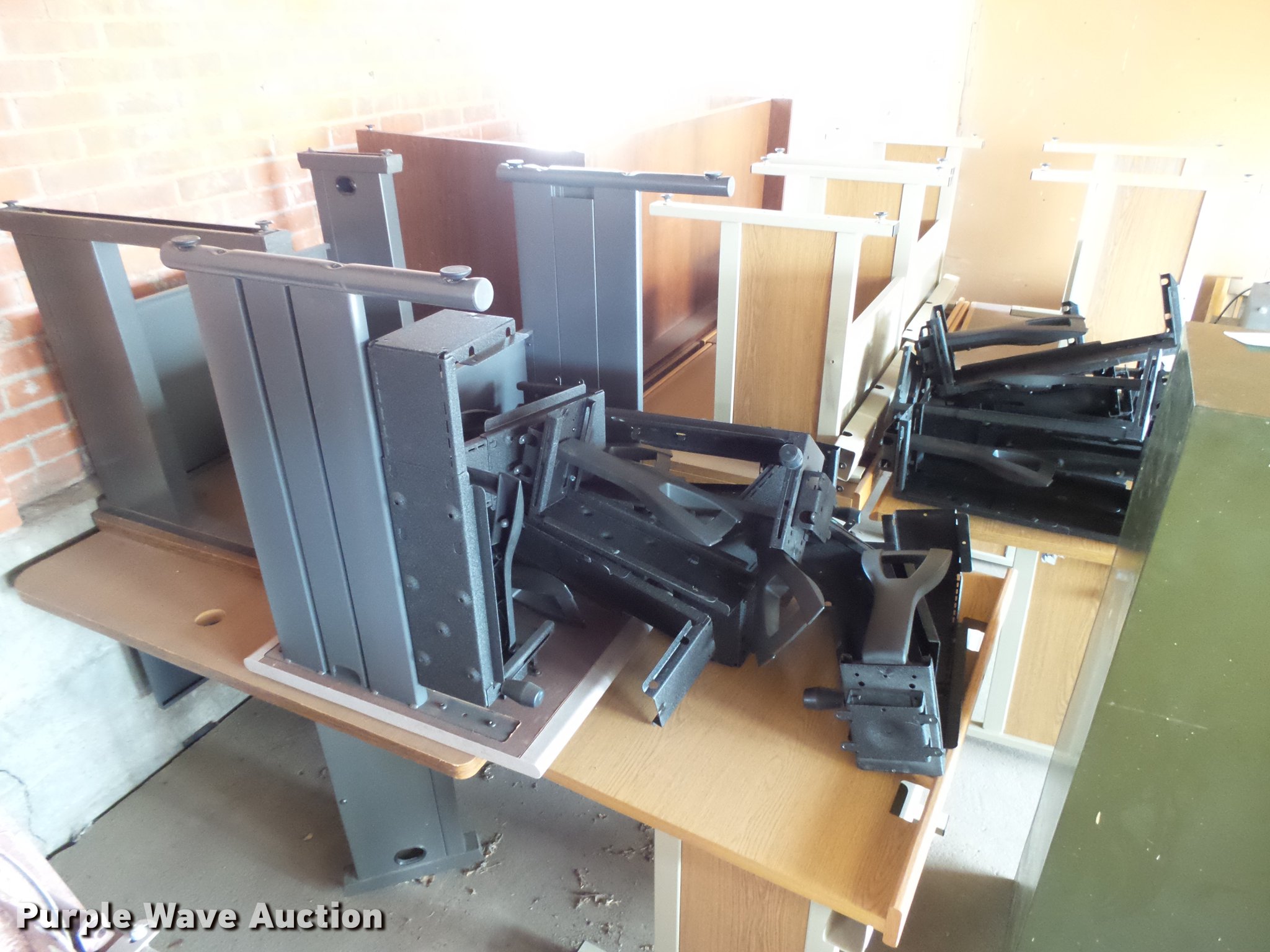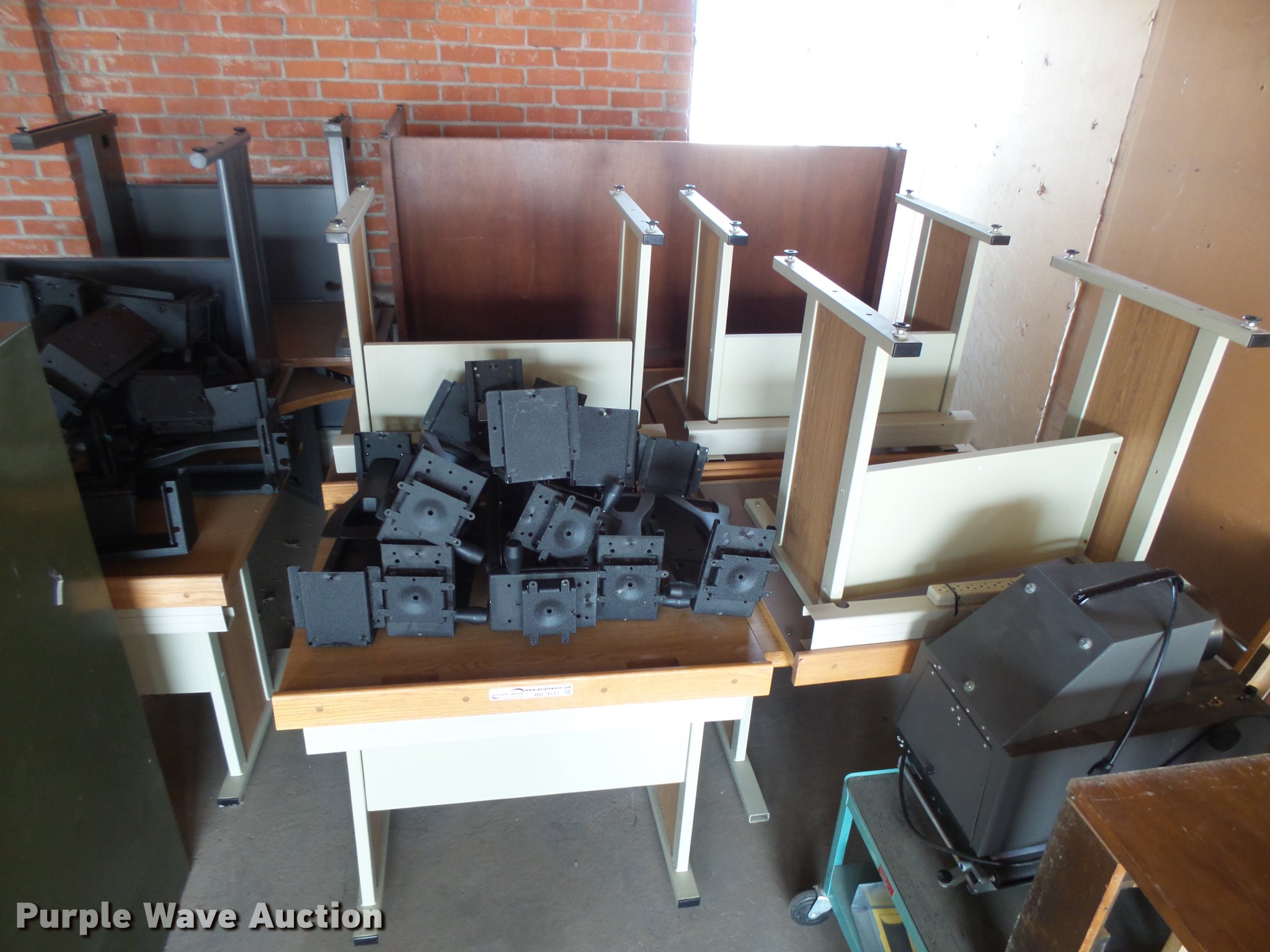 Purple Wave is selling a used Office Supplies and Equip. in Kansas. This item is a Office supplies with the following: Approximately 13 desks, Approximately 19 table mounted computer hangers, File cabinet, Projector, Unknown operating condition