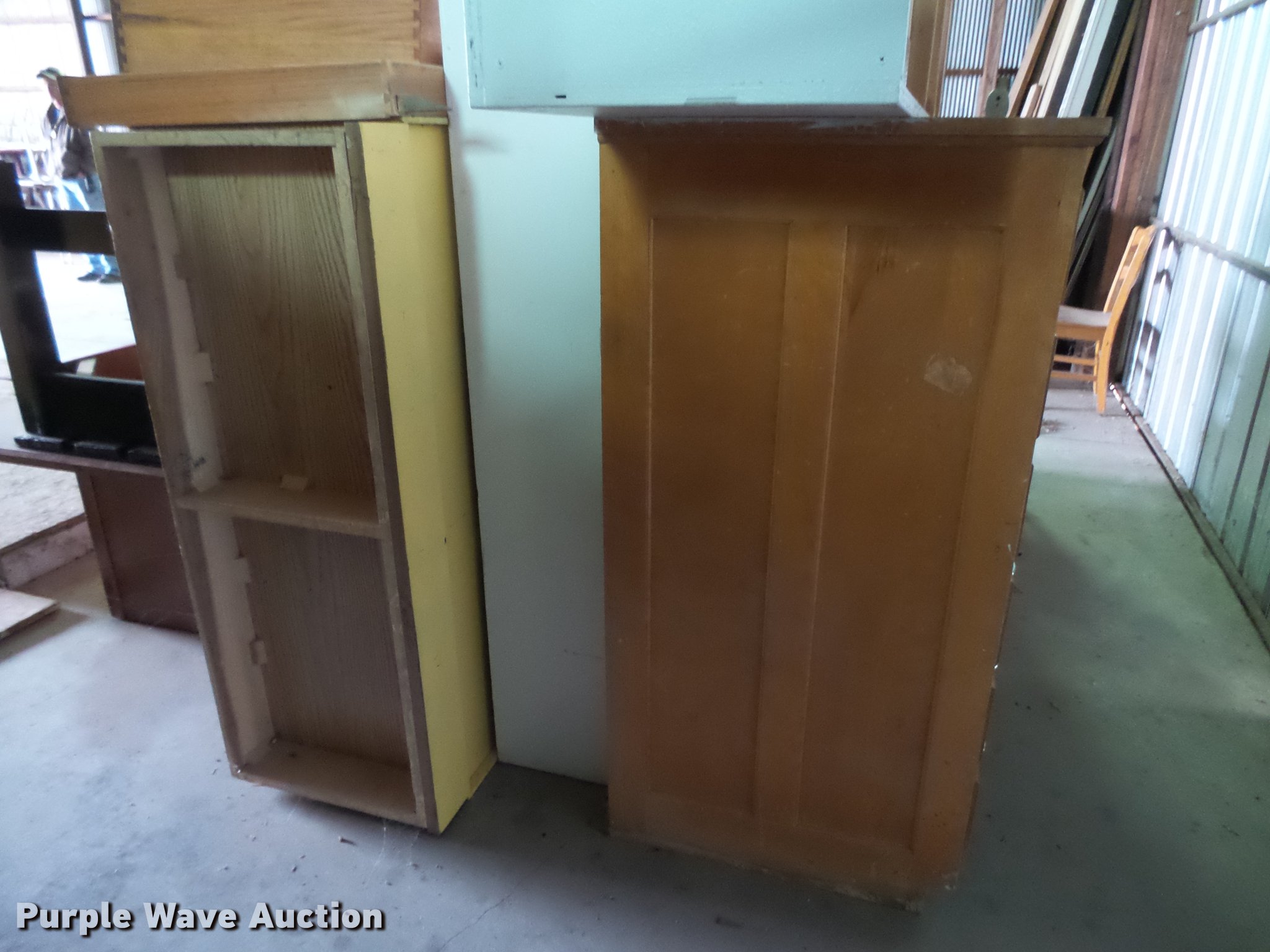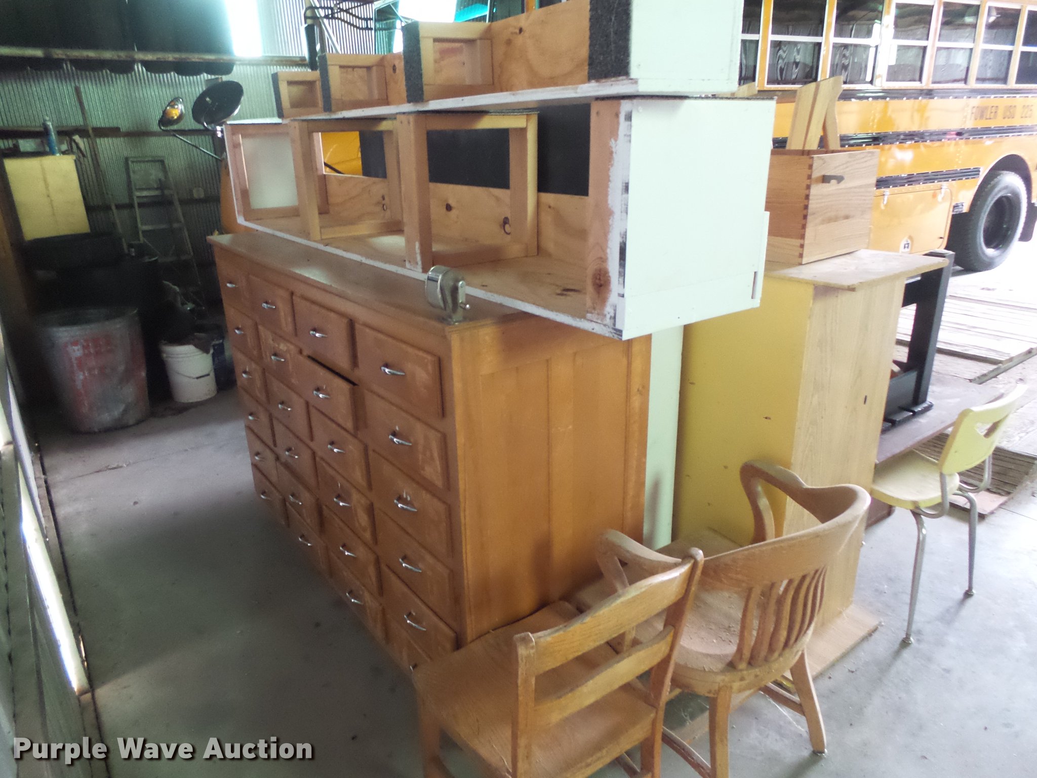 Purple Wave is selling a used Furniture in Kansas. This item is a Furniture with the following: Twenty four drawer cabinet, Desk, Table, Chairs, Shelving units