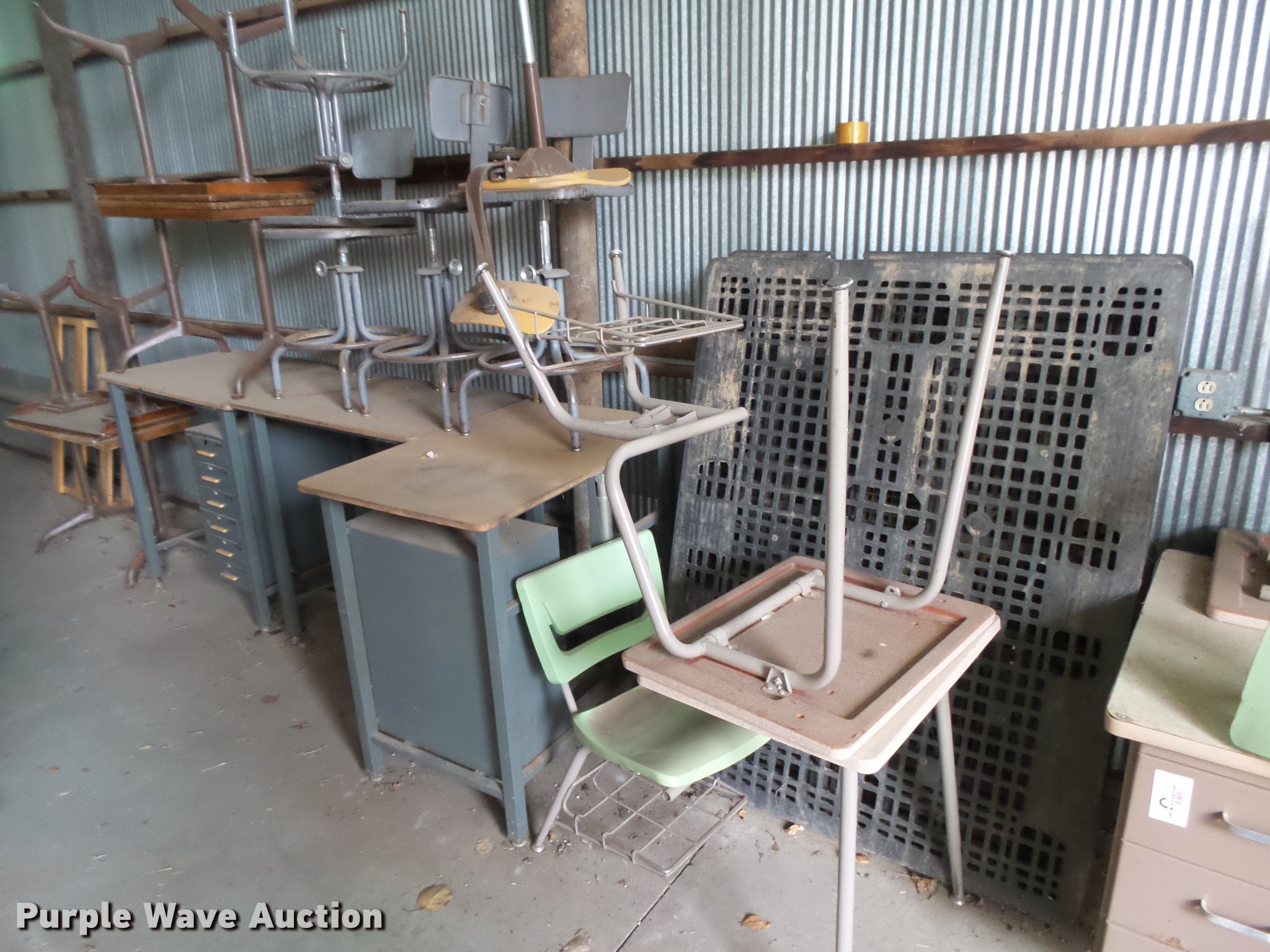 Purple Wave is selling a used Furniture in Kansas. This item is a Furniture with the following: Approximately 17 student desks, (4) wood desks, (3) work stations, (2) flats, (2) hydraulic cylinders