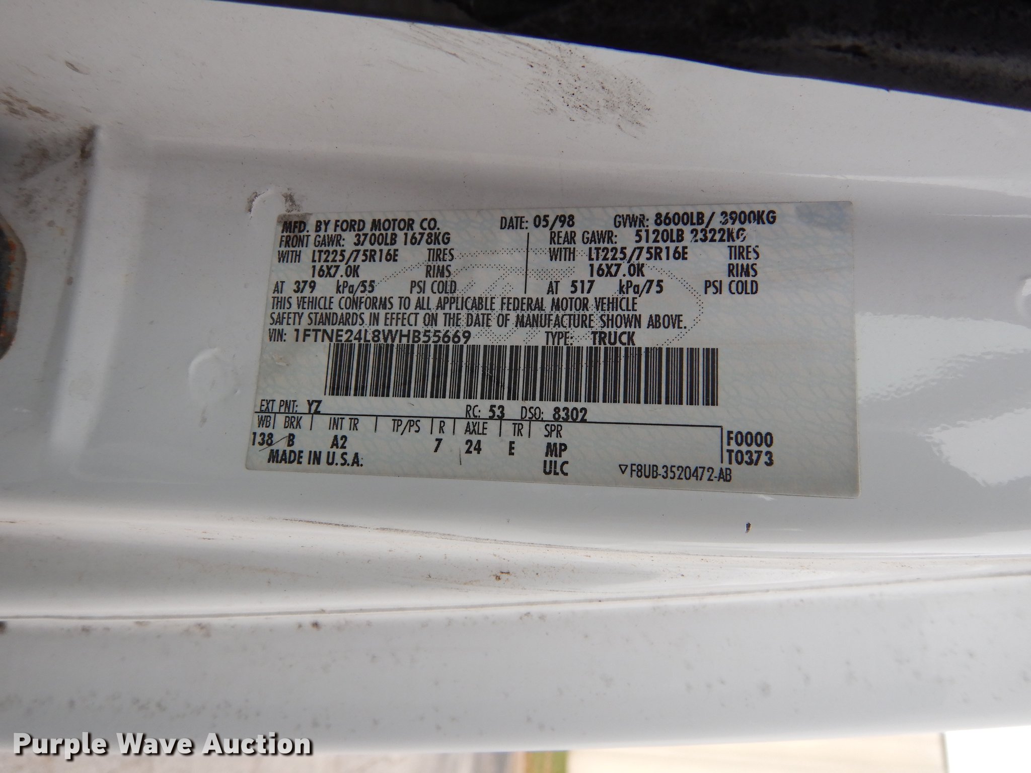 Purple Wave is selling a used 3/4 or 1 Ton Pickup or Van in Kansas. This item is a 1998 Ford Econoline E250 van with the following: 158,191 miles on odometer, 5.4L V8 SOHC 16V gas engine, Automatic transmission, Heat, AM/FM, Manual windows and locks, Vinyl interior, Cage divider, Interior shelving, Ladder rack, 225/75R16 tires, Shifter dial inoperable