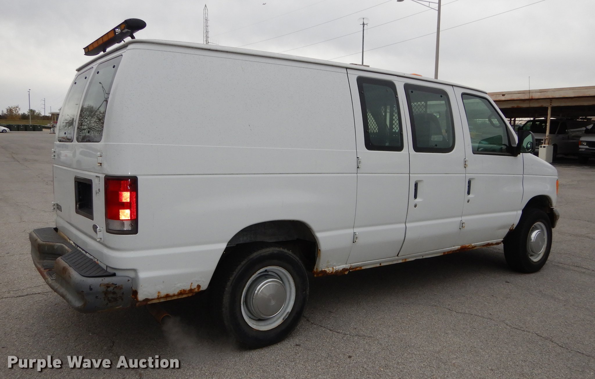 Purple Wave is selling a used 3/4 or 1 Ton Pickup or Van in Kansas. This item is a 2001 Ford Econoline E250 van with the following: 190,971 miles on odometer, 5.4L V8 SOHC 16V gas engine, Automatic transmission, AC and heat, AM/FM, Manual windows and locks, Vinyl interior, Cage dividor, Interior shelving, Beacon light, 225/75R16 tires