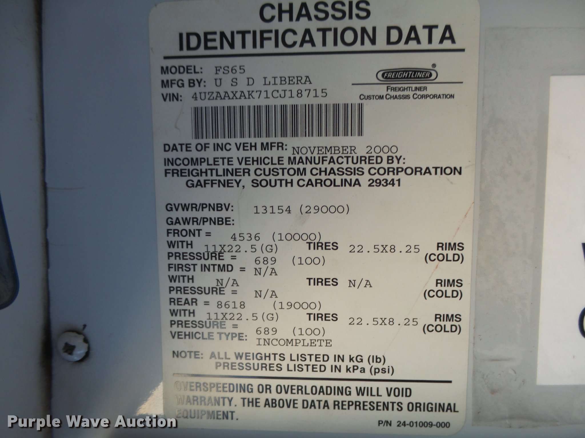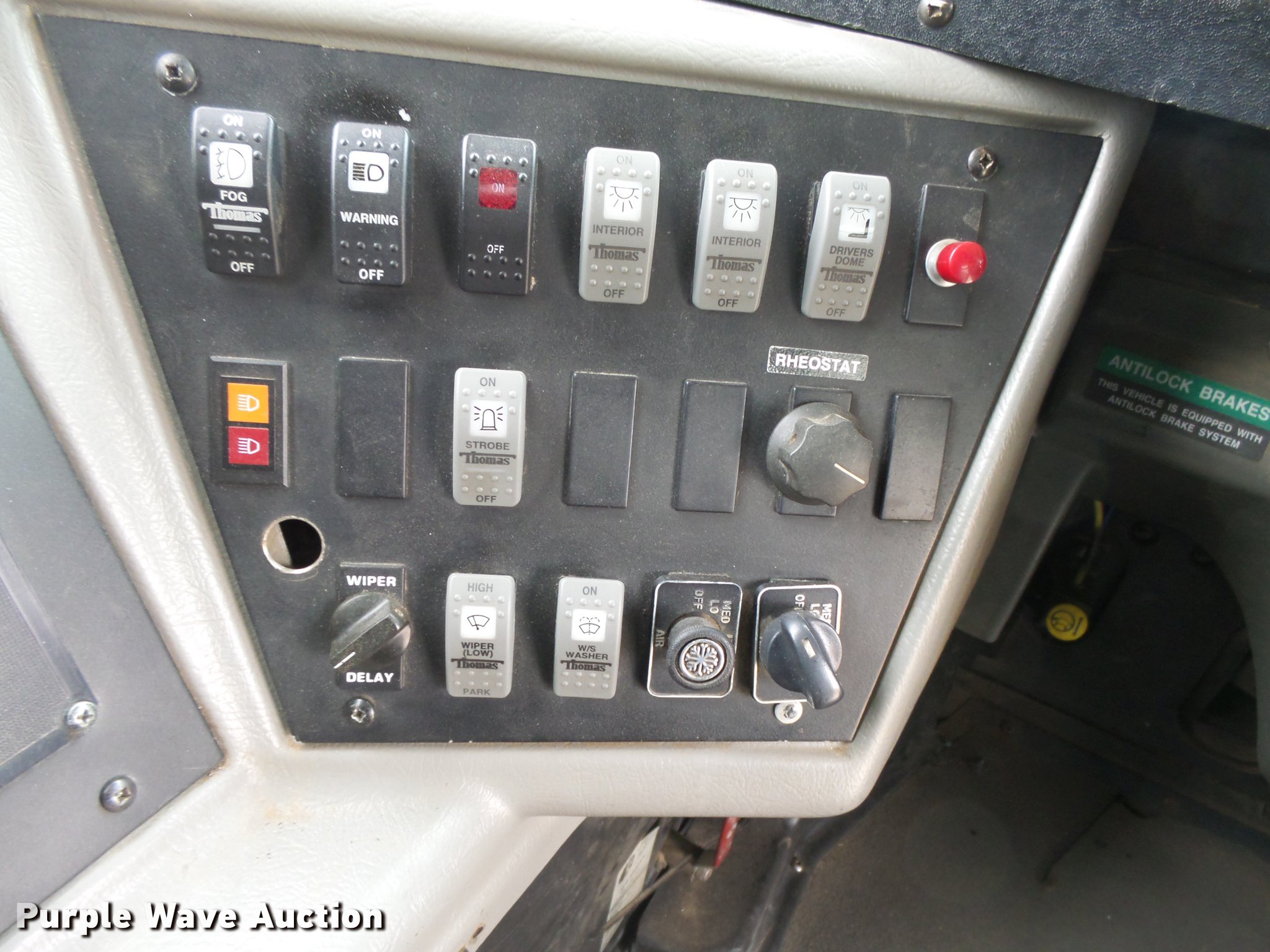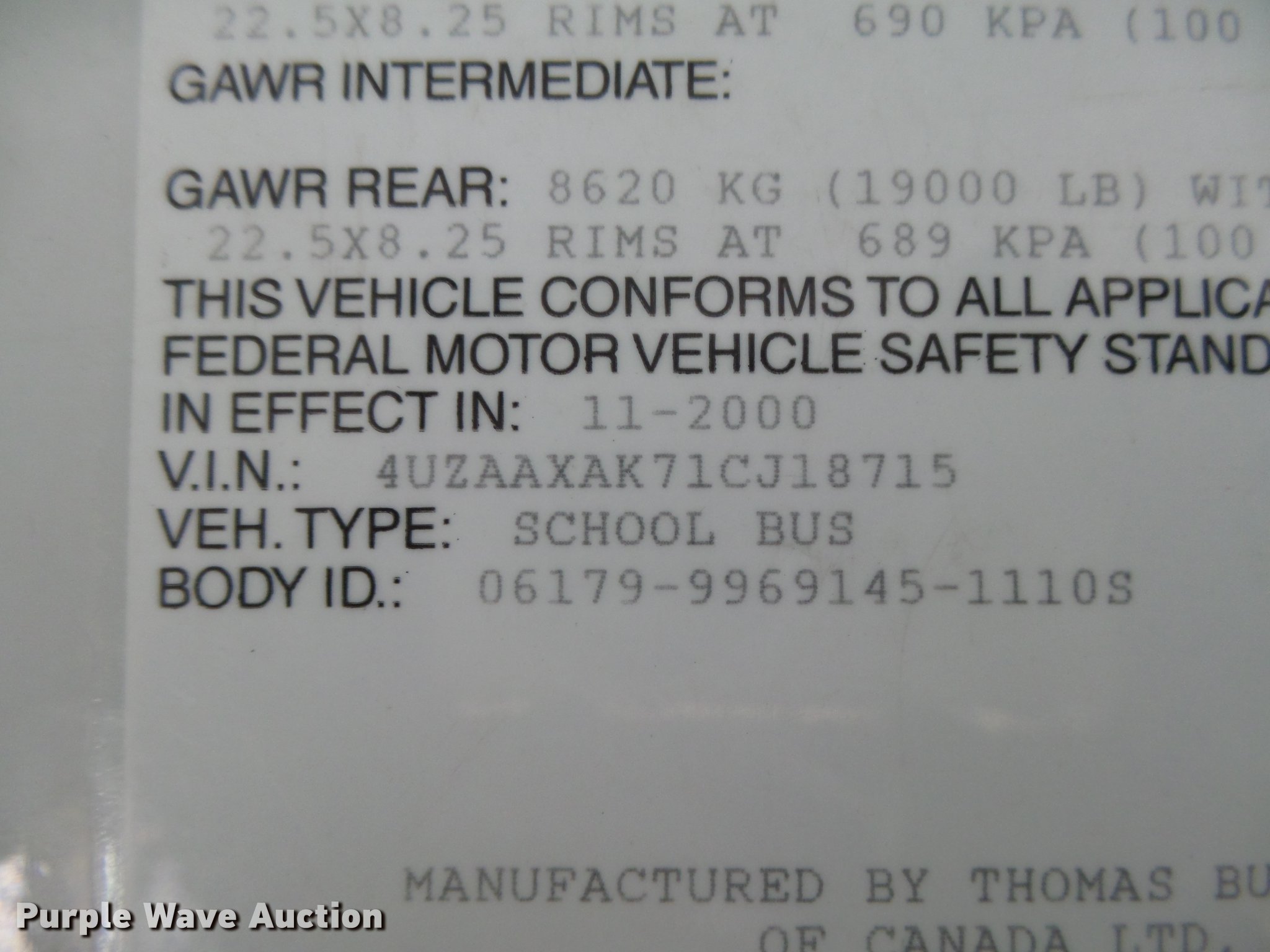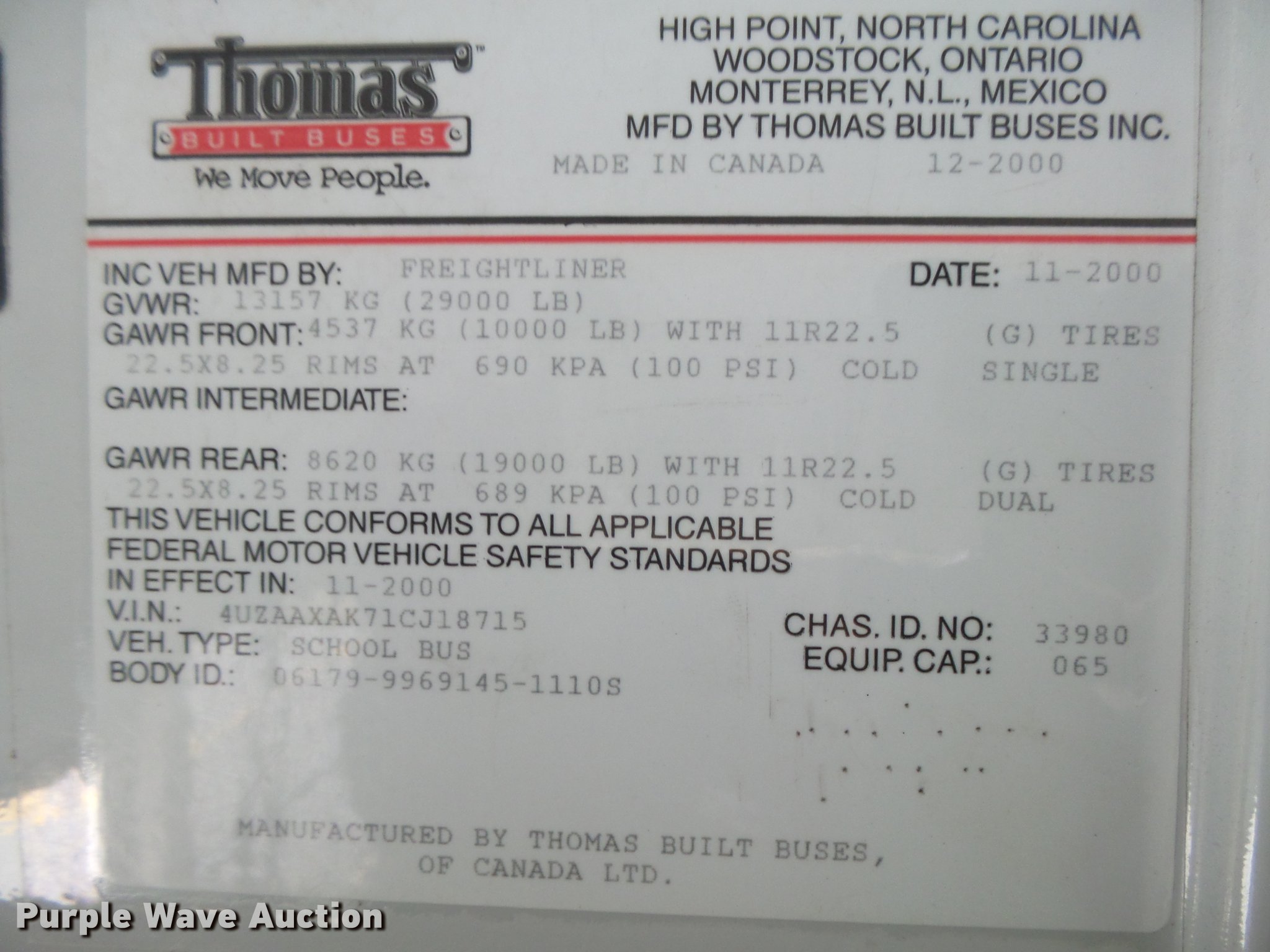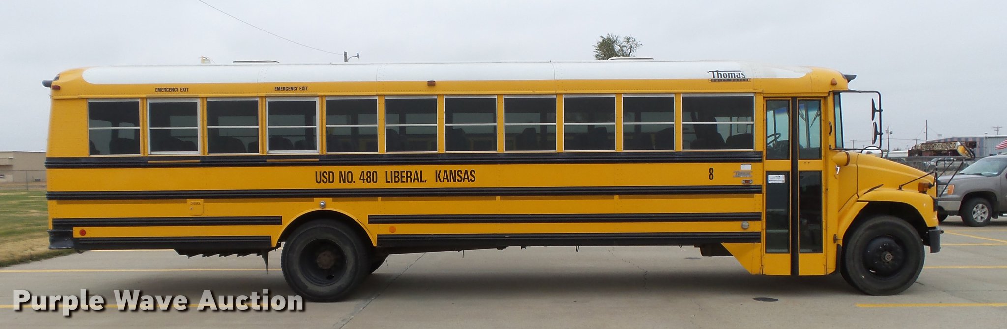 Purple Wave is selling a used Bus in Kansas. This item is a 2001 Freightliner FS65 Thomas Built school bus with the following: 190,549 miles on odometer, 22,016 hours on meter, Caterpillar 3126 7.2L L6 turbo diesel engine, Serial 8YL92029, Automatic transmission, Single axle, Heat, AM/FM/cassette, Air suspension seat, 65 passenger capacity, (8) child safety seats, Ceiling, rear, and side emergency exits, Beacon light, Stop sign, Trans Air roof AC unit, Block heater, Front and rear tow hooks, Air suspension, Air brakes, 11R22.5 tires, GVWR 29,000 lbs, Unit# 8