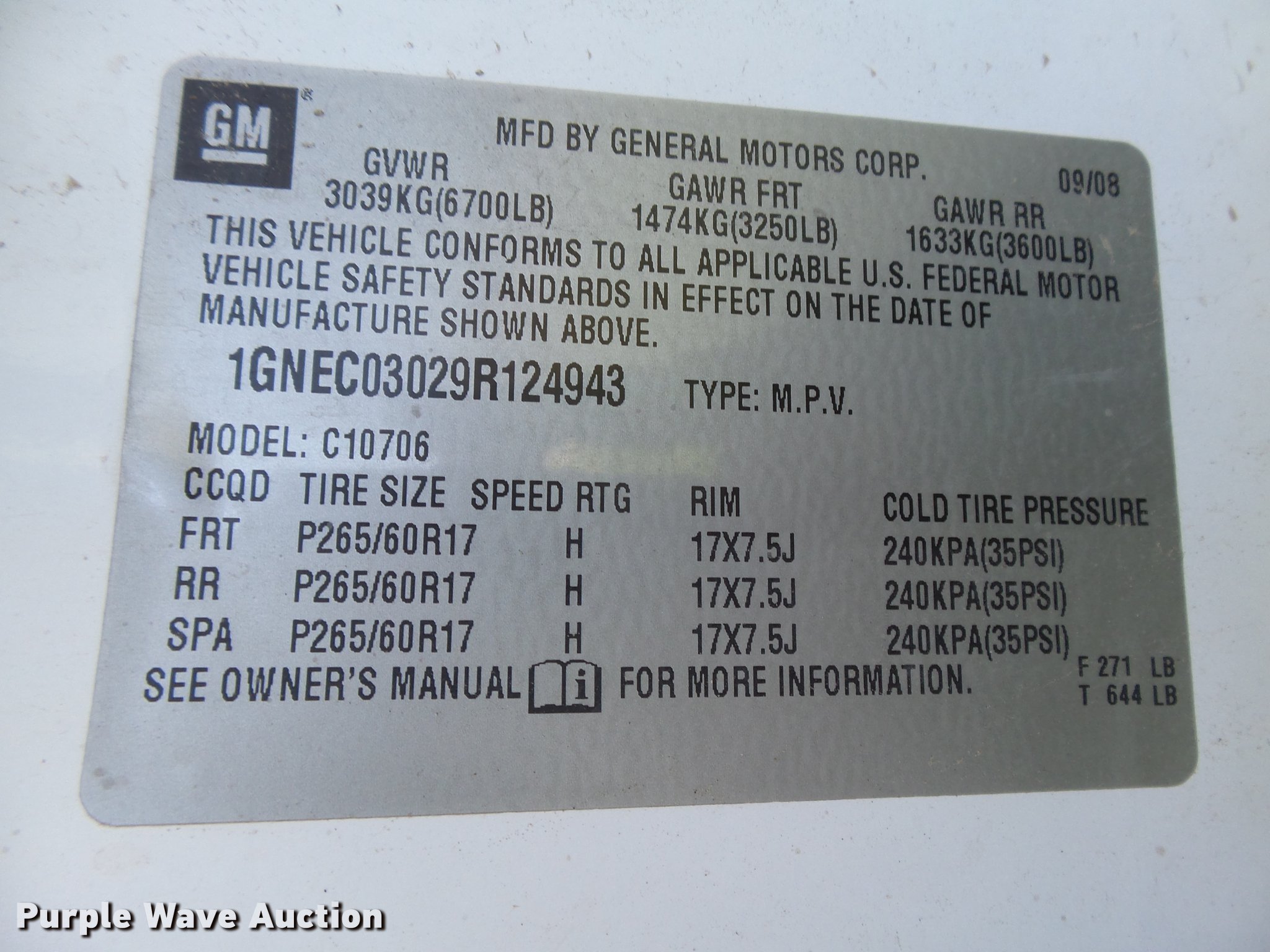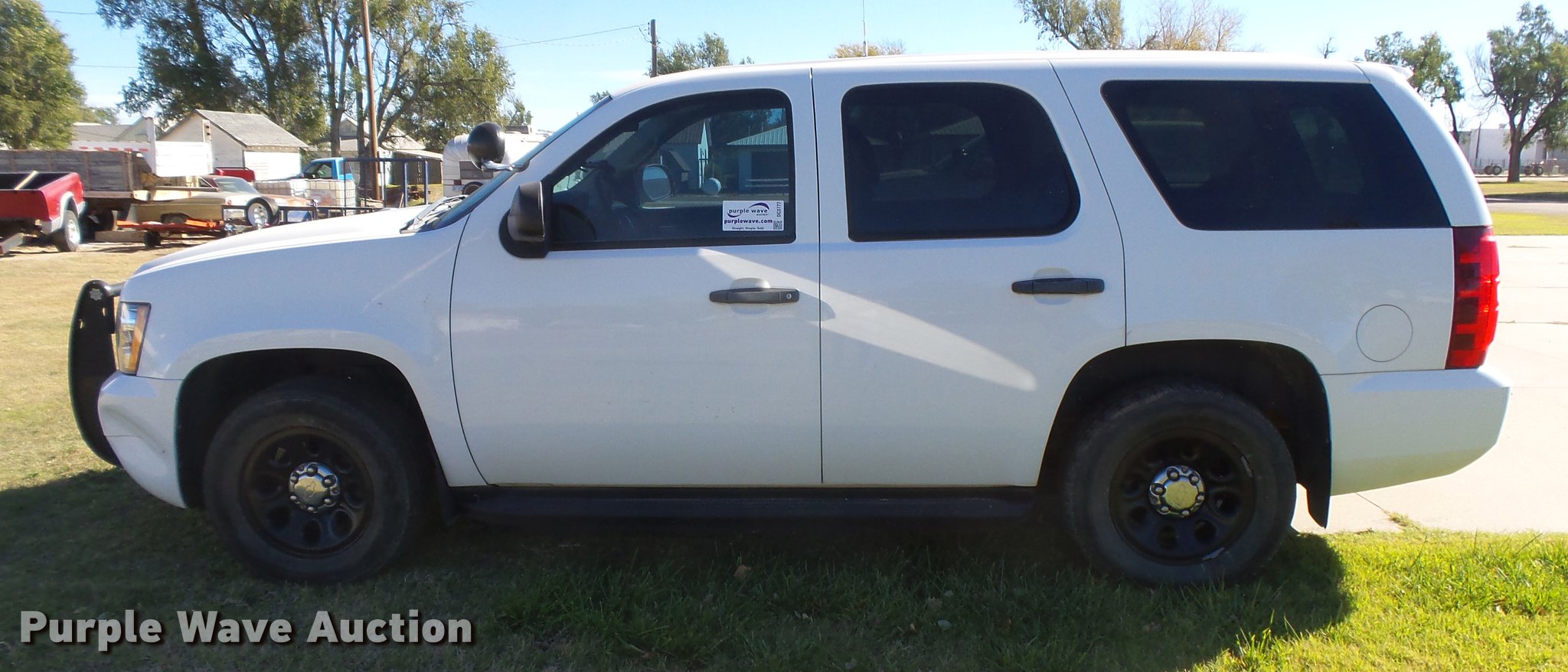 Purple Wave is selling a used Passenger Vehicle in Kansas. This item is a 2009 Chevrolet Tahoe Police SUV with the following: 120,027 miles on odometer, 5.3L V8 OHV 16V FFV gas engine, Automatic transmission, AC and heat, Tilt, Cruise, AM/FM/CD, Power windows, locks, mirrors, and seats, Cloth interior, K&N air cleaner, 275/60R17 tires
