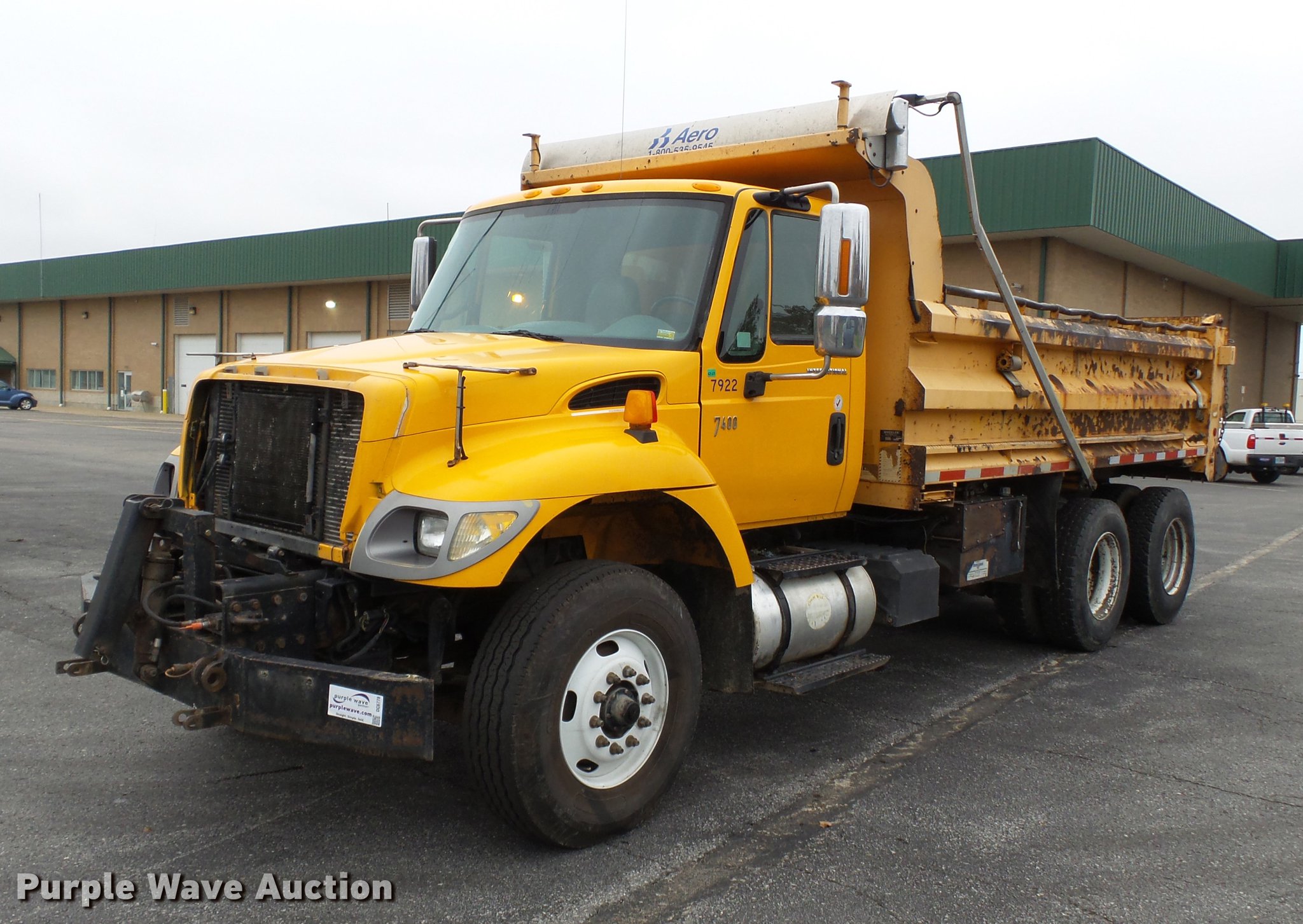 Purple Wave is selling a used Construction Dump Truck in Missouri. This item is a 2007 International 7400 dump truck with the following: 204,091 miles on odometer, 10,530 hours on meter, International DT570 9.3L L6 turbo diesel engine, Allison automatic transmission, Tandem axle, AC and heat, Tilt, Cruise, AM/FM, Power and heated mirrors, Air suspension seat, Block heater, Front mounted PTO, Wheeler HT1636 steel dump bed, 16'L x 96"W, 36" side height, Roll tarp, Bed vibrator, Air operated end gate, Single ram hoist, Single fuel tank, Pintle hitch, Trailer wiring, Walking beam suspension, Air brakes, 213" wheelbase, 315/80R22.5 front tires, 11R22.5 rear tires, GVWR 58,000 lbs, FAWR 18,000 lbs, IAWR 20,000 lbs, RAWR 20,000 lbs, Grill missing, MODOT ID 7922