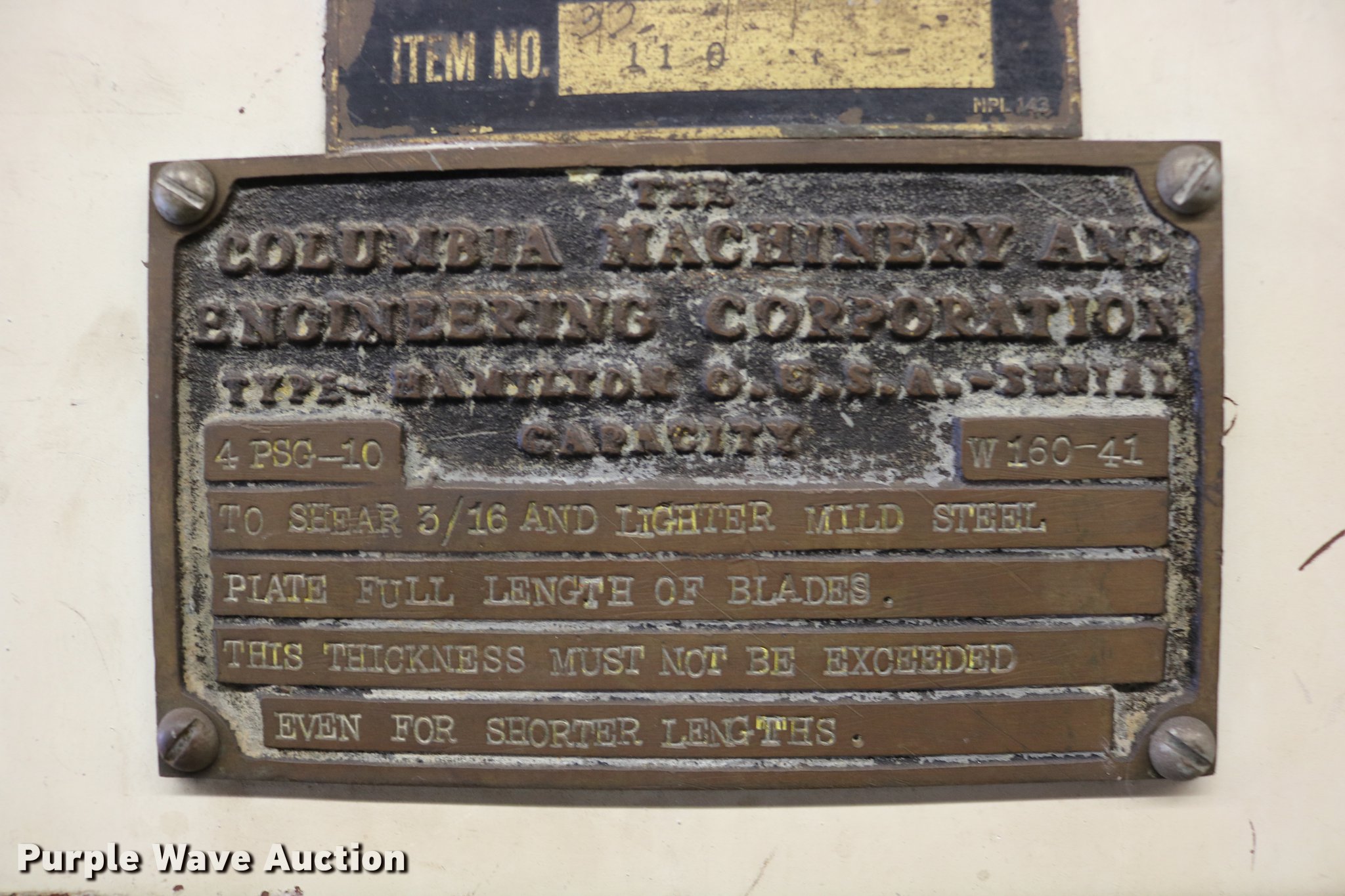 Purple Wave is selling a used Forming Equip. in Kansas. This item is a Columbia shear with the following: 10' bed width, B-Line electric motor, 5 HP, Three phase, 220/440V, Serial 2300730, 3/16" and lighter mild steel capacity, Type: 4PSG-10, Serial W160-41