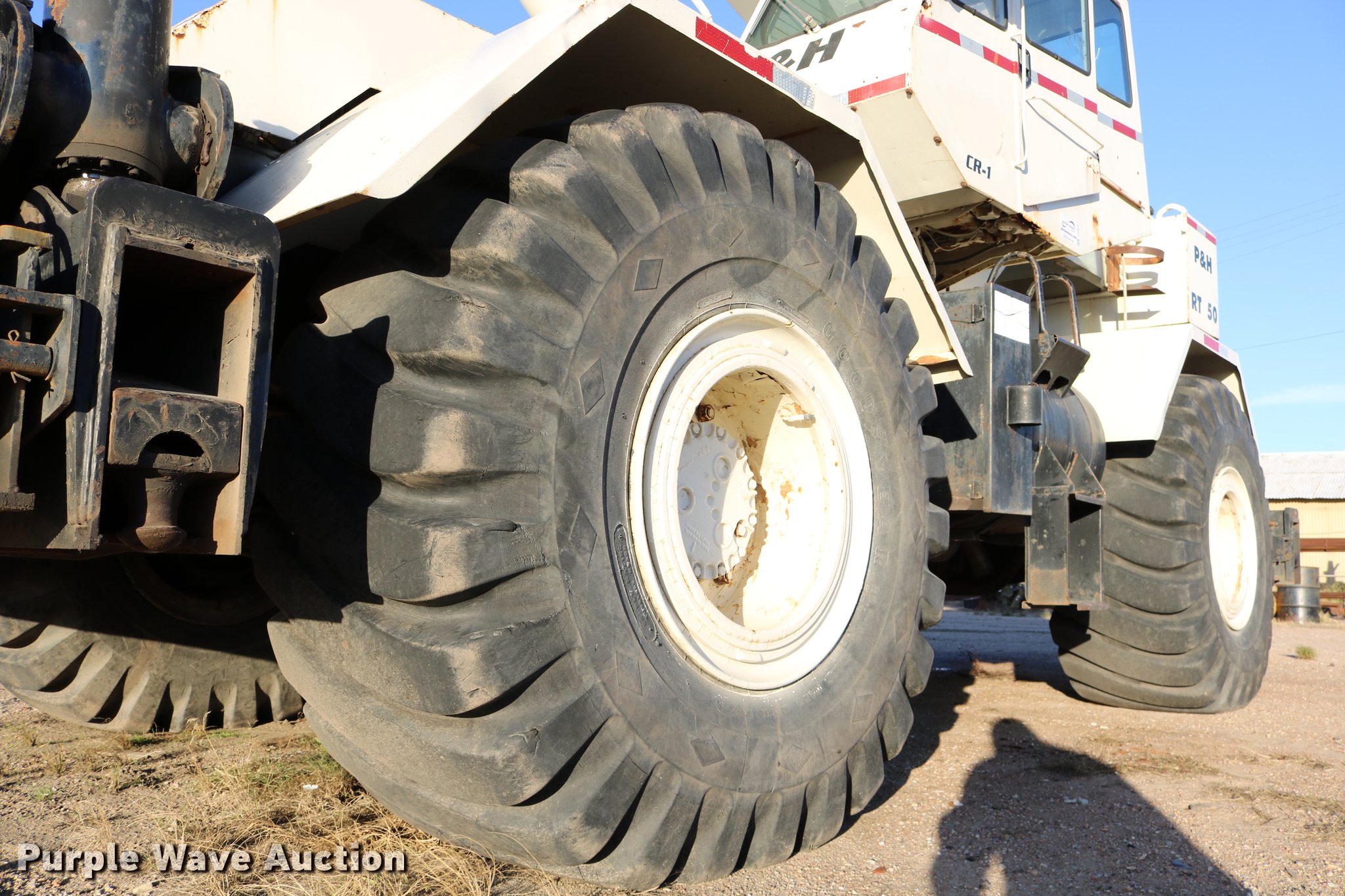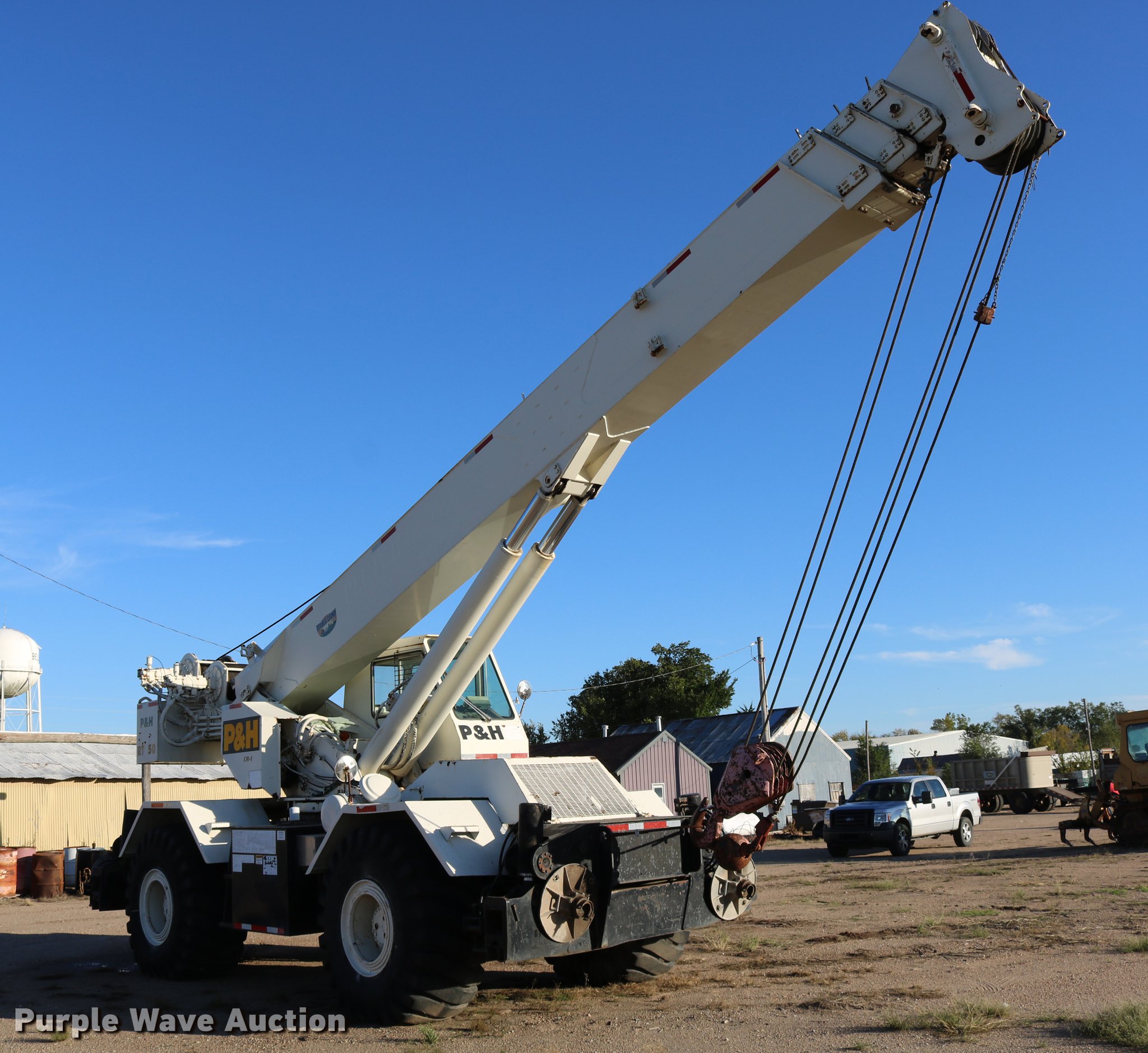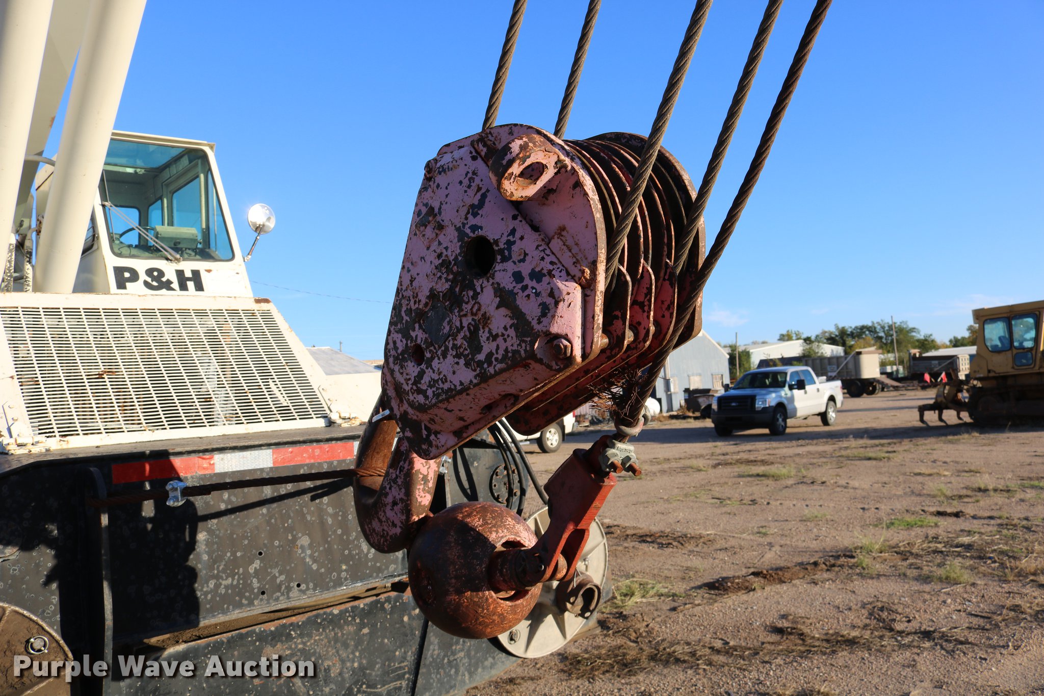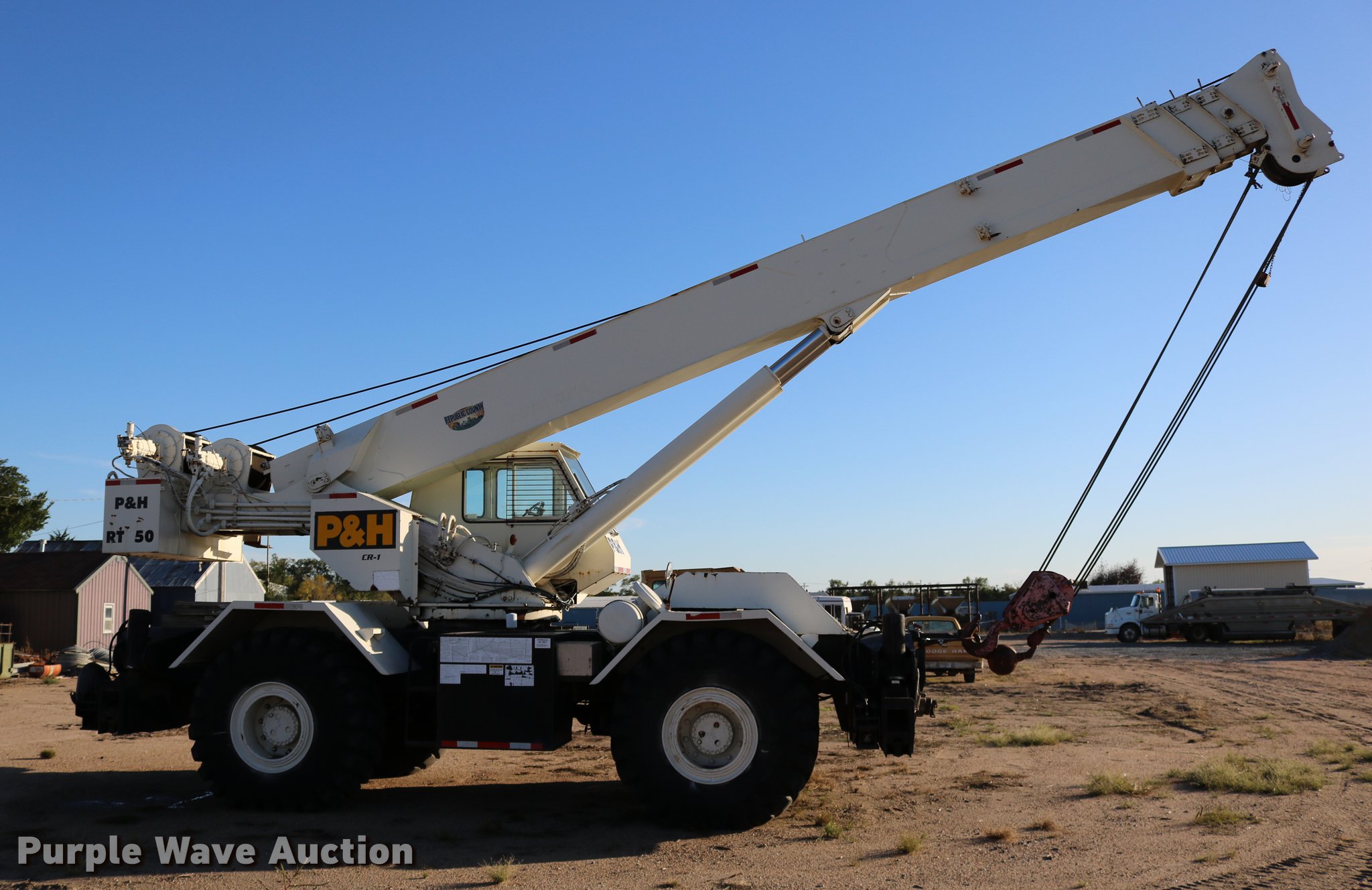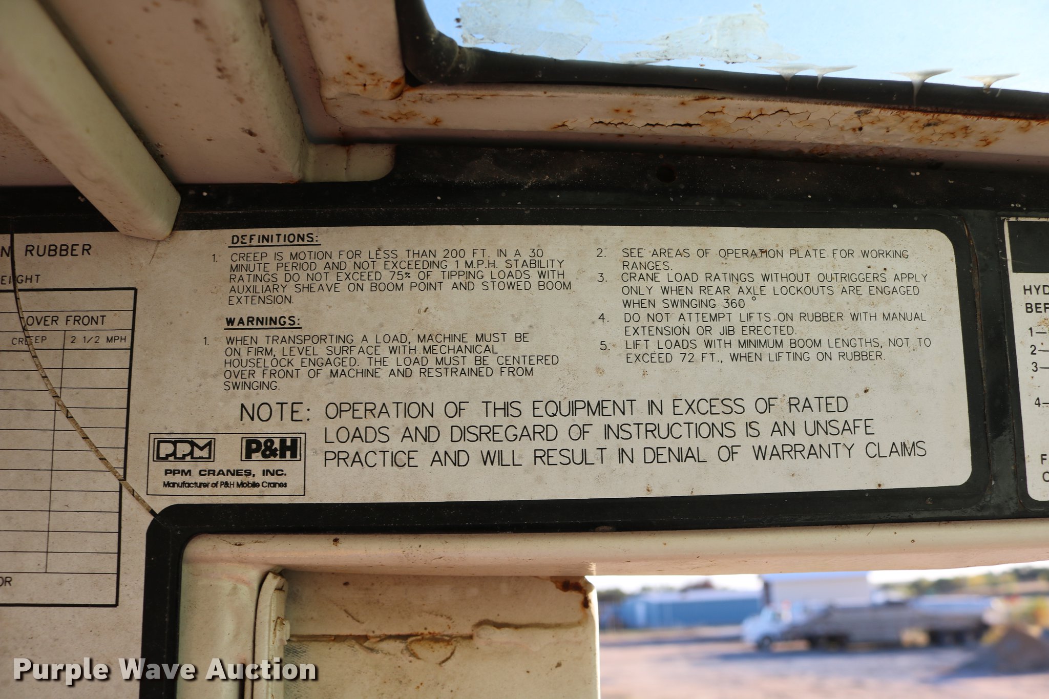 Purple Wave is selling a used Rough or All Terrain Crane in Kansas. This item is a 1985 P & H RT50 crane with the following: 3,031 hours on meter, Detroit Diesel 6V59N six cylinder diesel engine, Powershift transmission, 4F-4R gears, Tandem axle, (4) drive wheels, (4) steer wheels, All wheel steer, All wheel drive, Heat, Backup alarm, Stick crane controls, Hydraulic telescopic boom, 140' maximum boom length, 32.5' minimum boom length, 34' jib length, Three boom sections, 50 ton maximum lift capacity, In-cab boom controls, Johnson hook block, (4) stabilizers, 149" wheelbase, Air over hydraulic brakes, 26.5-25 tires, Outrigger leaks hydraulic fluid, Serial 53738