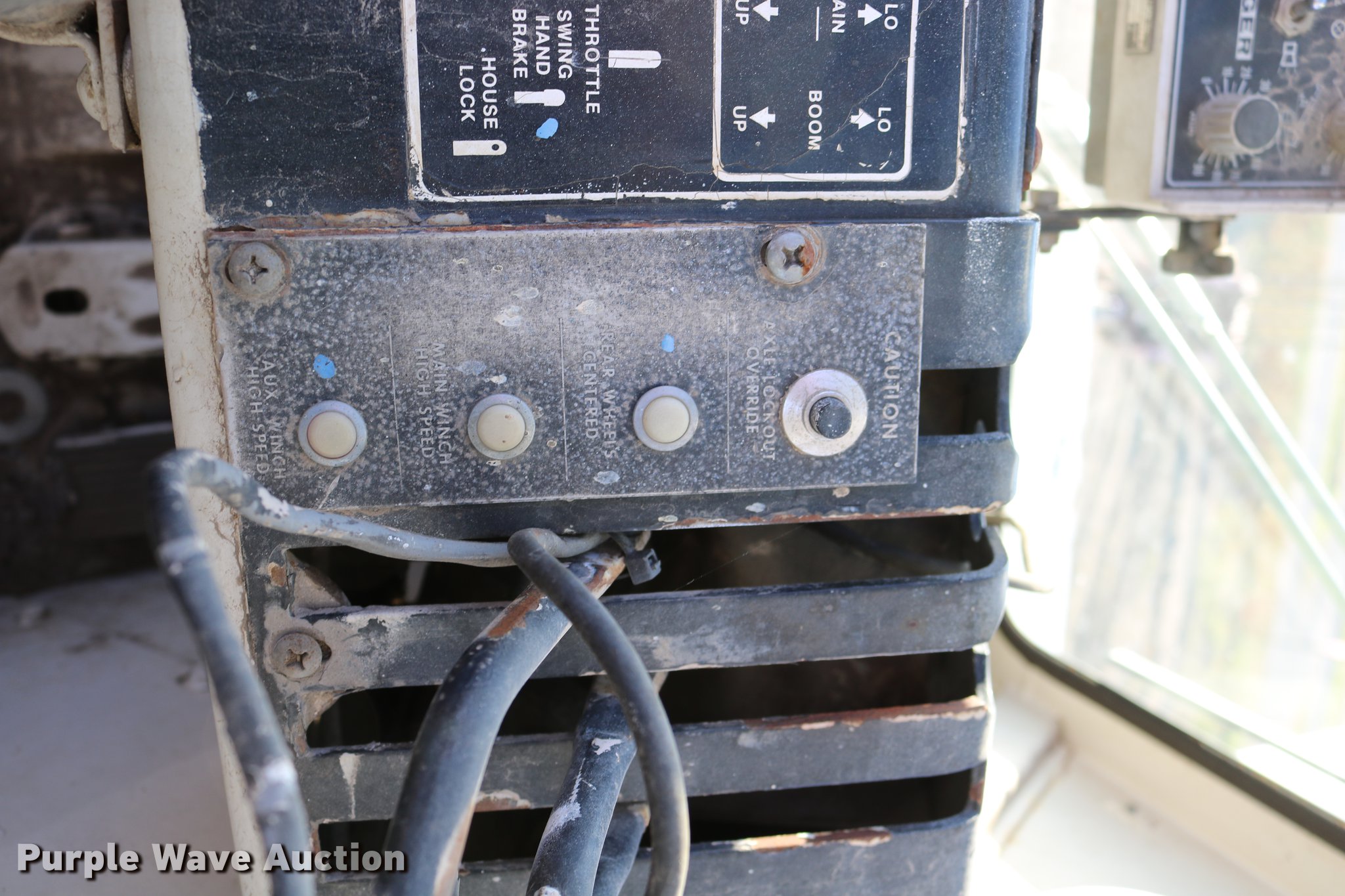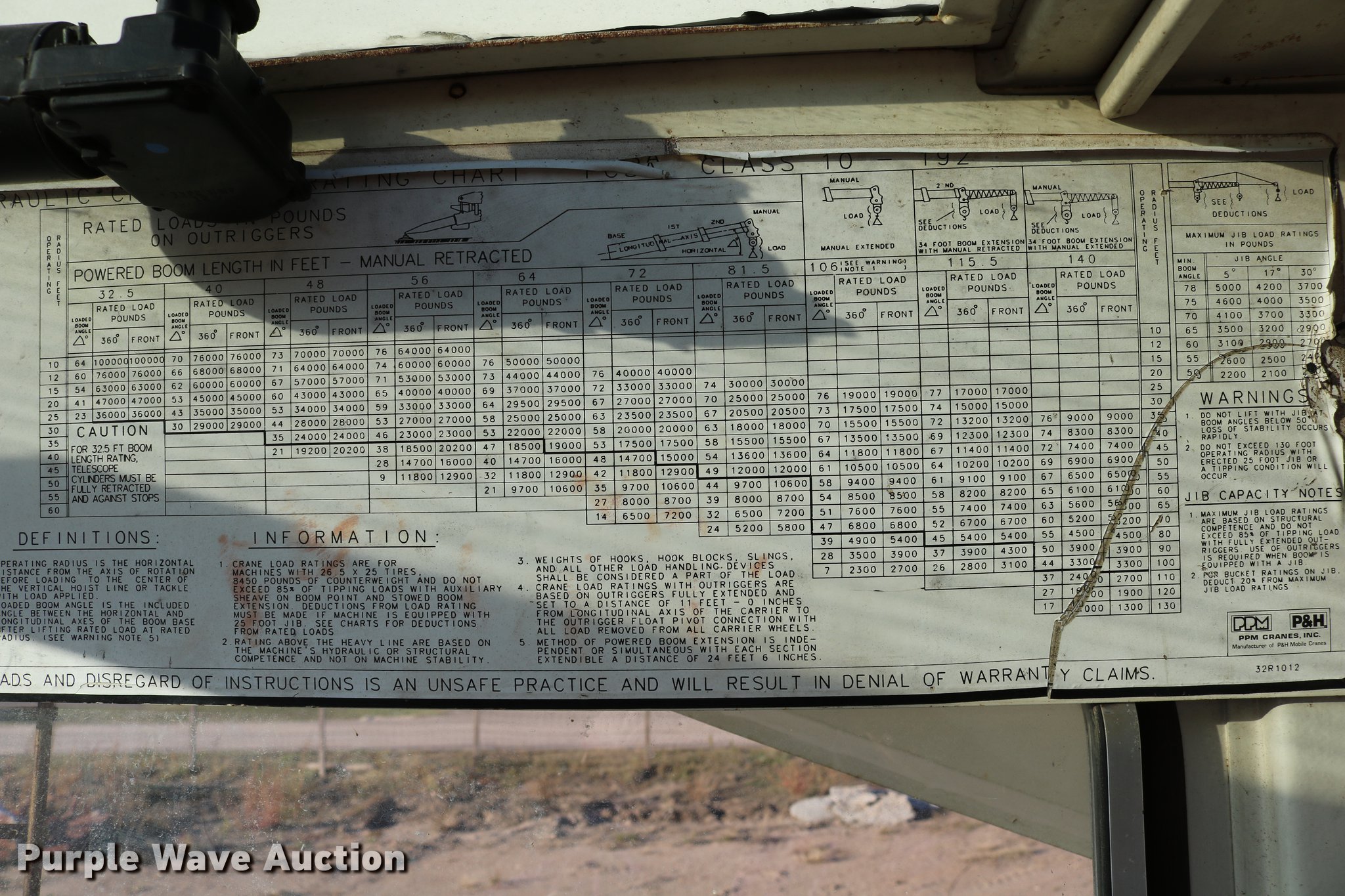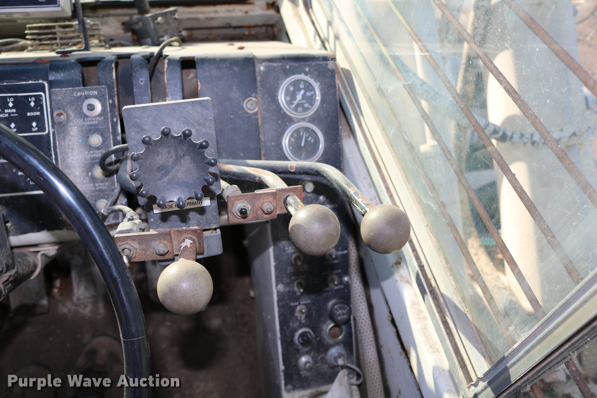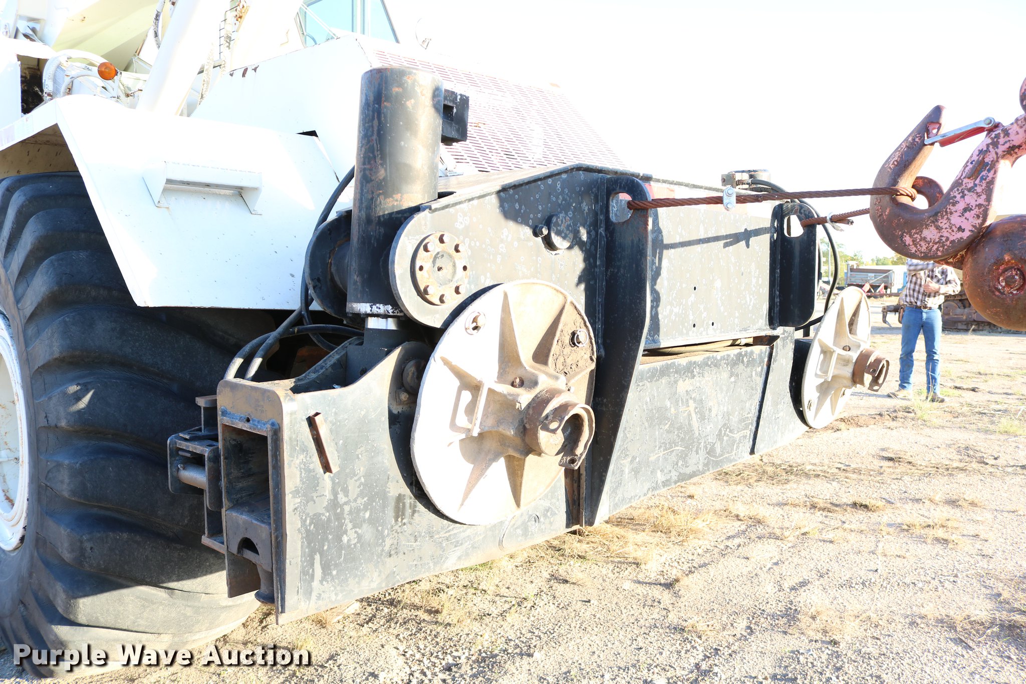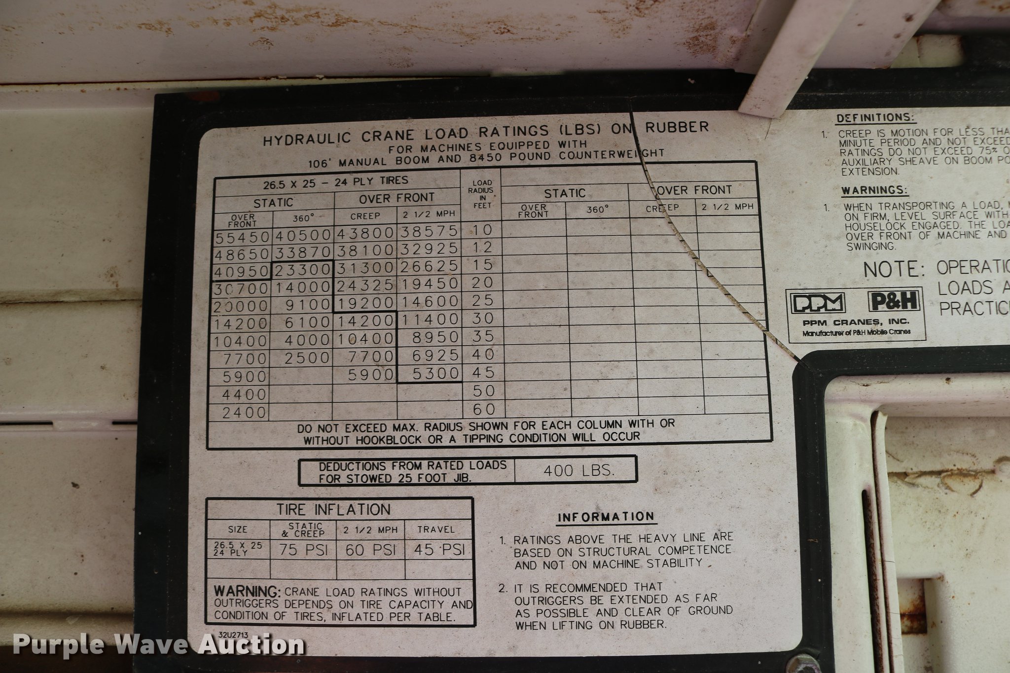 Purple Wave is selling a used Rough or All Terrain Crane in Kansas. This item is a 1985 P & H RT50 crane with the following: 3,031 hours on meter, Detroit Diesel 6V59N six cylinder diesel engine, Powershift transmission, 4F-4R gears, Tandem axle, (4) drive wheels, (4) steer wheels, All wheel steer, All wheel drive, Heat, Backup alarm, Stick crane controls, Hydraulic telescopic boom, 140' maximum boom length, 32.5' minimum boom length, 34' jib length, Three boom sections, 50 ton maximum lift capacity, In-cab boom controls, Johnson hook block, (4) stabilizers, 149" wheelbase, Air over hydraulic brakes, 26.5-25 tires, Outrigger leaks hydraulic fluid, Serial 53738