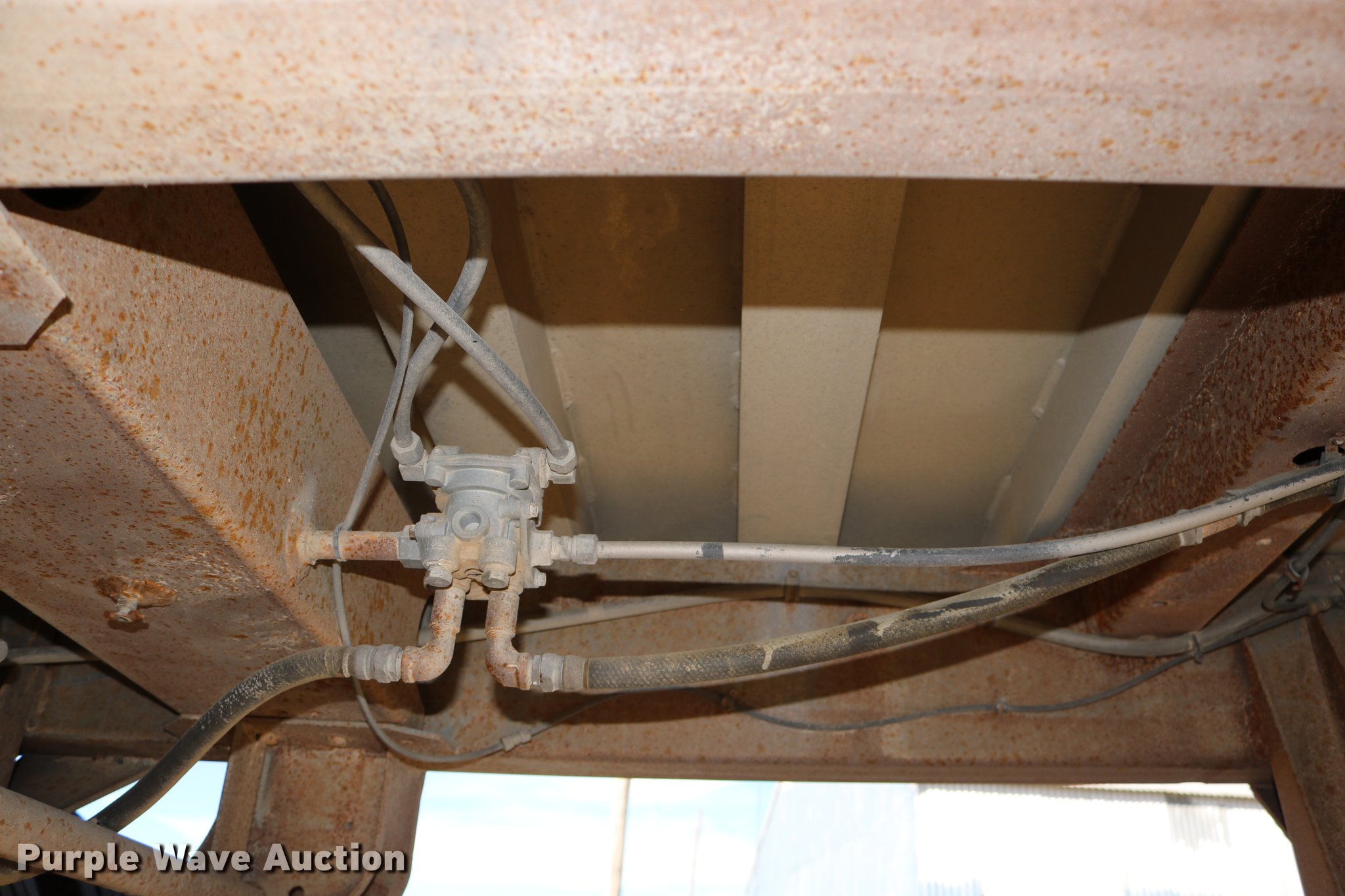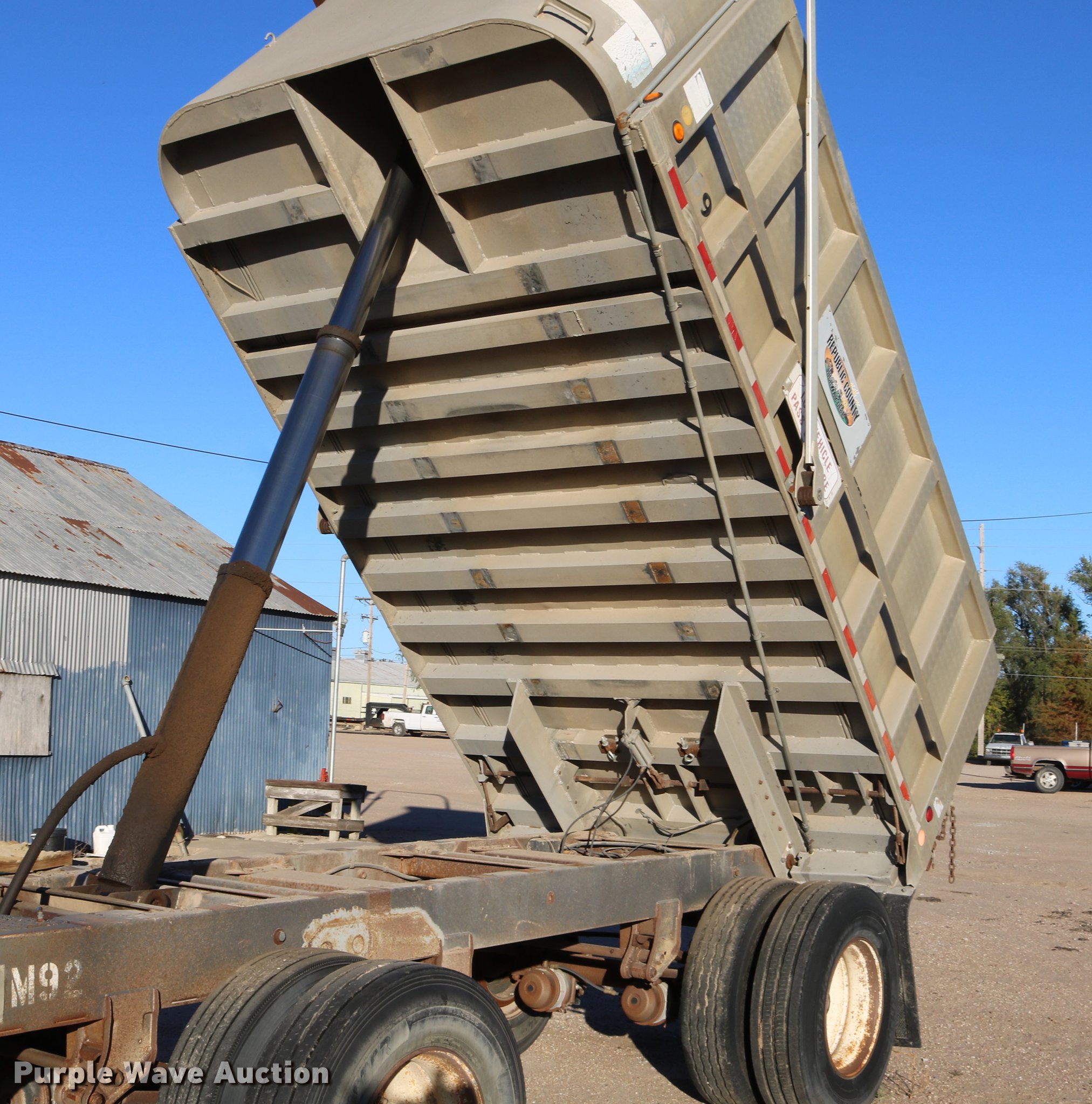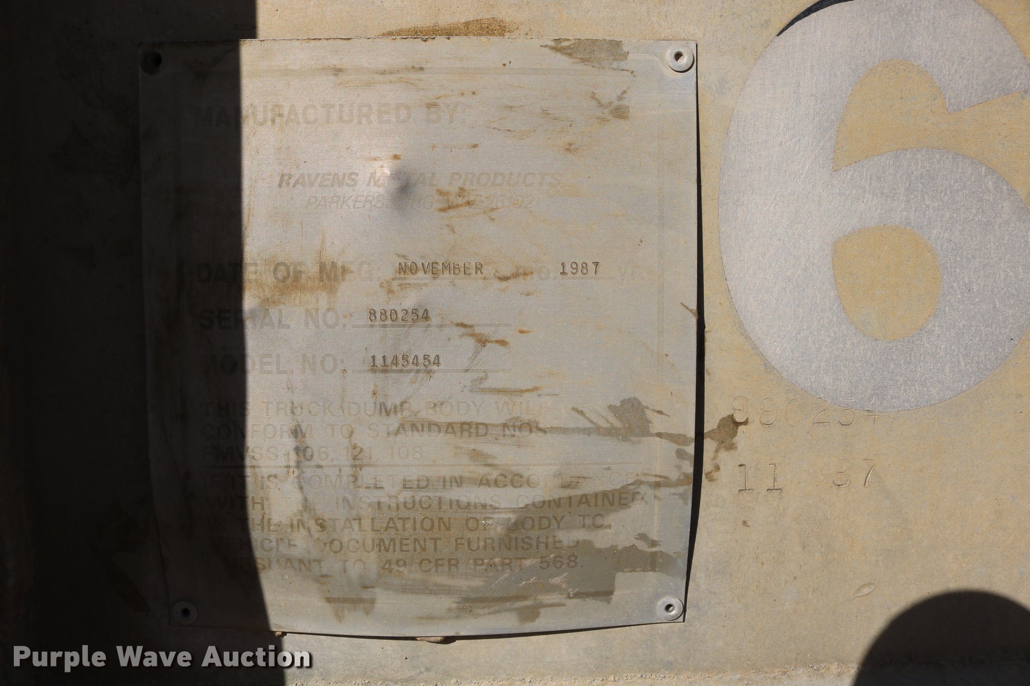 Purple Wave is selling a used End Dump Rock Trailer in Kansas. This item is a 1988 Corn Husker end dump trailer with the following: 35.5' overall length, Raven 1145454 aluminum dump bed, Serial 880254, 14'L x 96"W, 57 3/4" side height, Approximately 50" floor height, Aluminum construction, Single hydraulic cylinder, Air operated end gate, Electric tarp, Single leg landing gear, Floating tongue, Pintle hitch, Spring suspension, Air brakes, Steel wheels, 11R22.5 tires, GVWR 57,000 lbs, GAWR 19,000 lbs