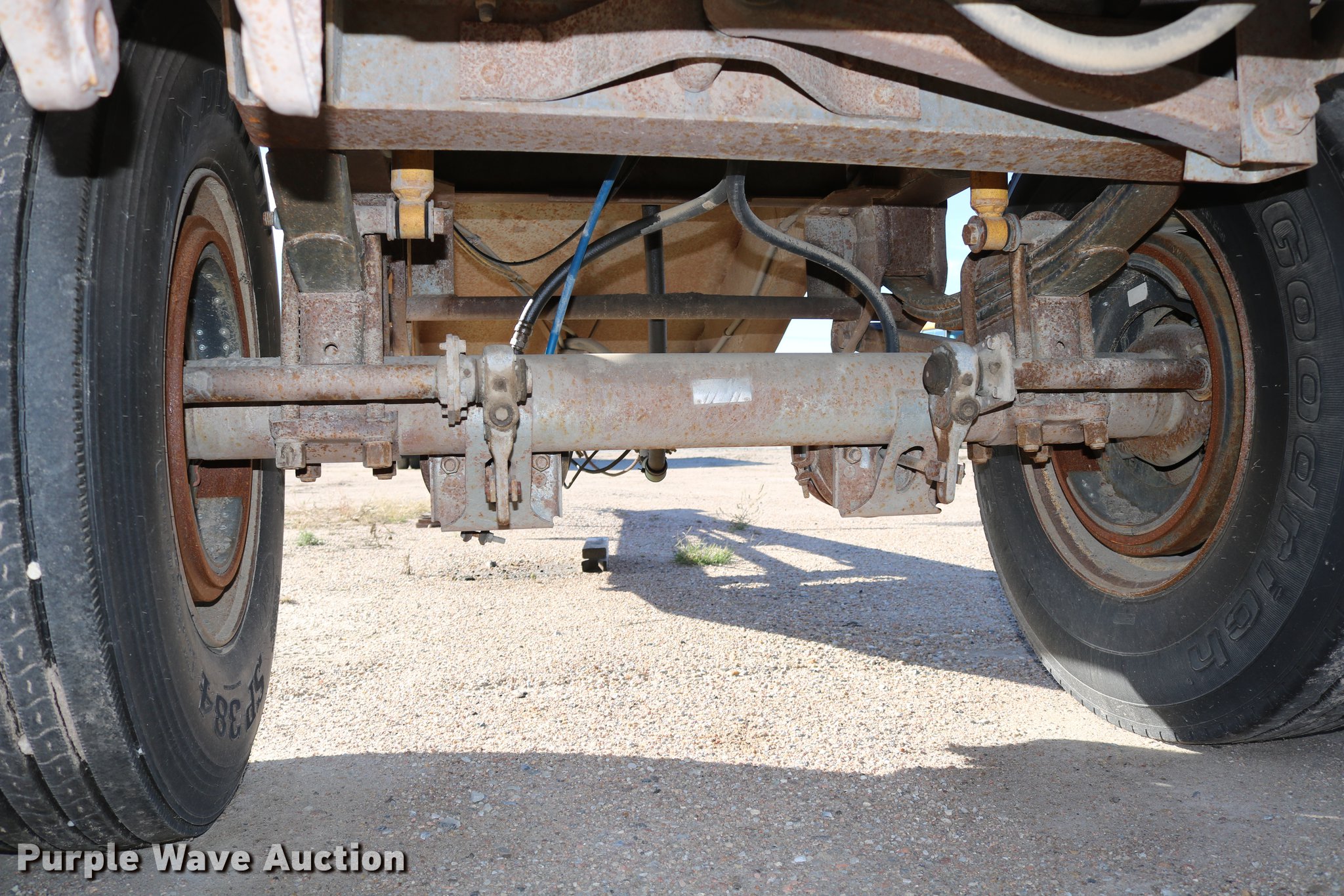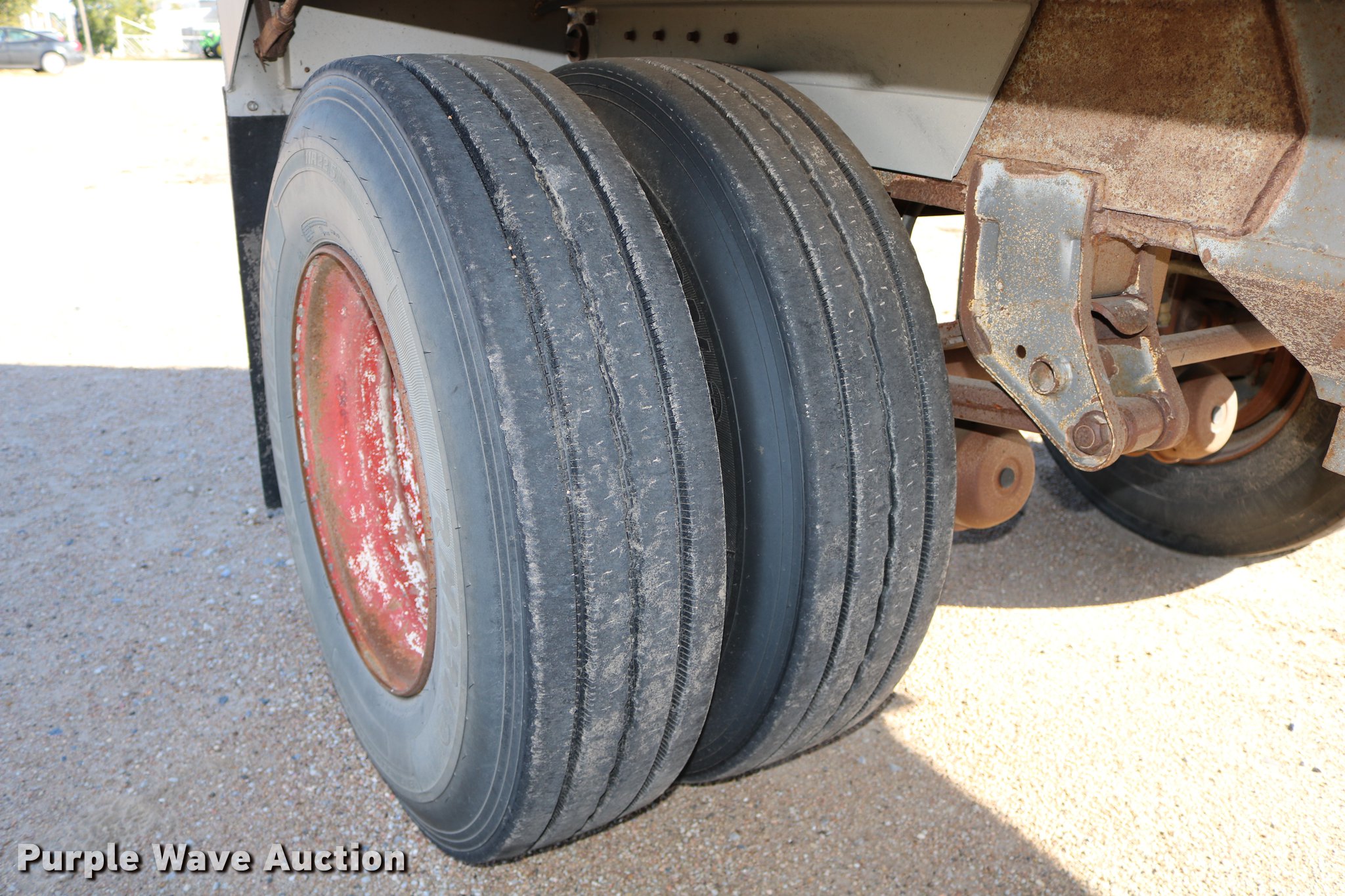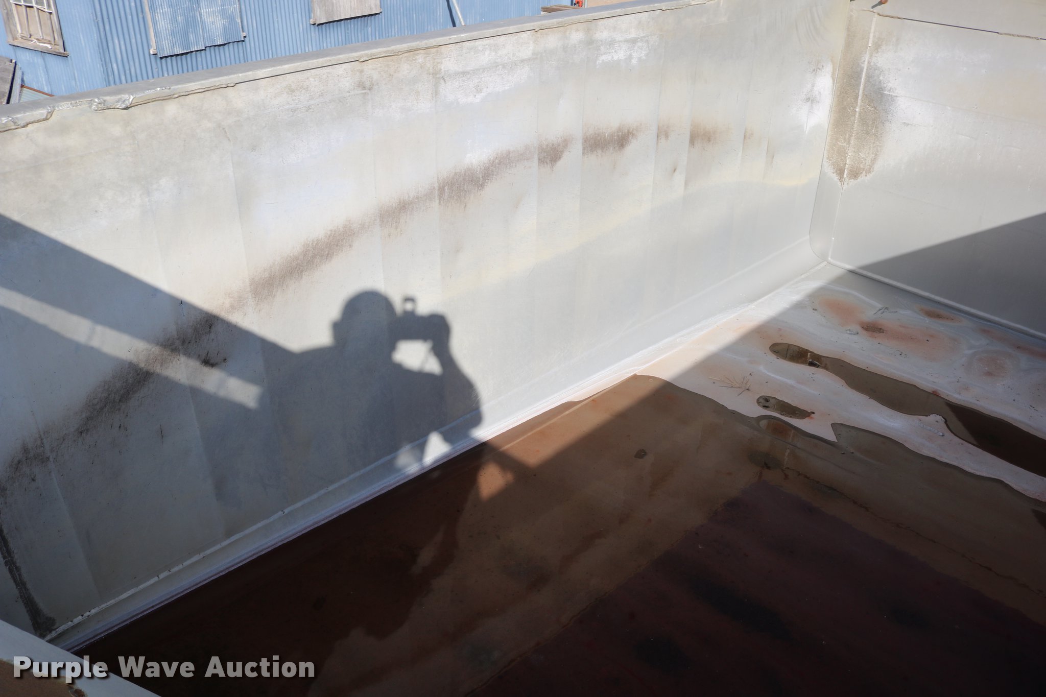 1988 Corn Husker end dump trailer. 35.5' overall length, Raven 1145454 aluminum dump bed Serial 880254, 14'L x 96"W, 57 3/4" side height, Approximately 50" floor height, Aluminum construction, Single hydraulic cylinder, Air operated end gate, Electric tarp, Single leg landing gear, Floating tongue, Pintle hitch, Spring suspension, Air brakes, Steel wheels, 11R22.5 tires, GVWR 57,000 lbs, GAWR 19,000 lbs. Kansas title. 1T91C1933J0007079. Republic County. 702 K St. Belleville, KS 66935