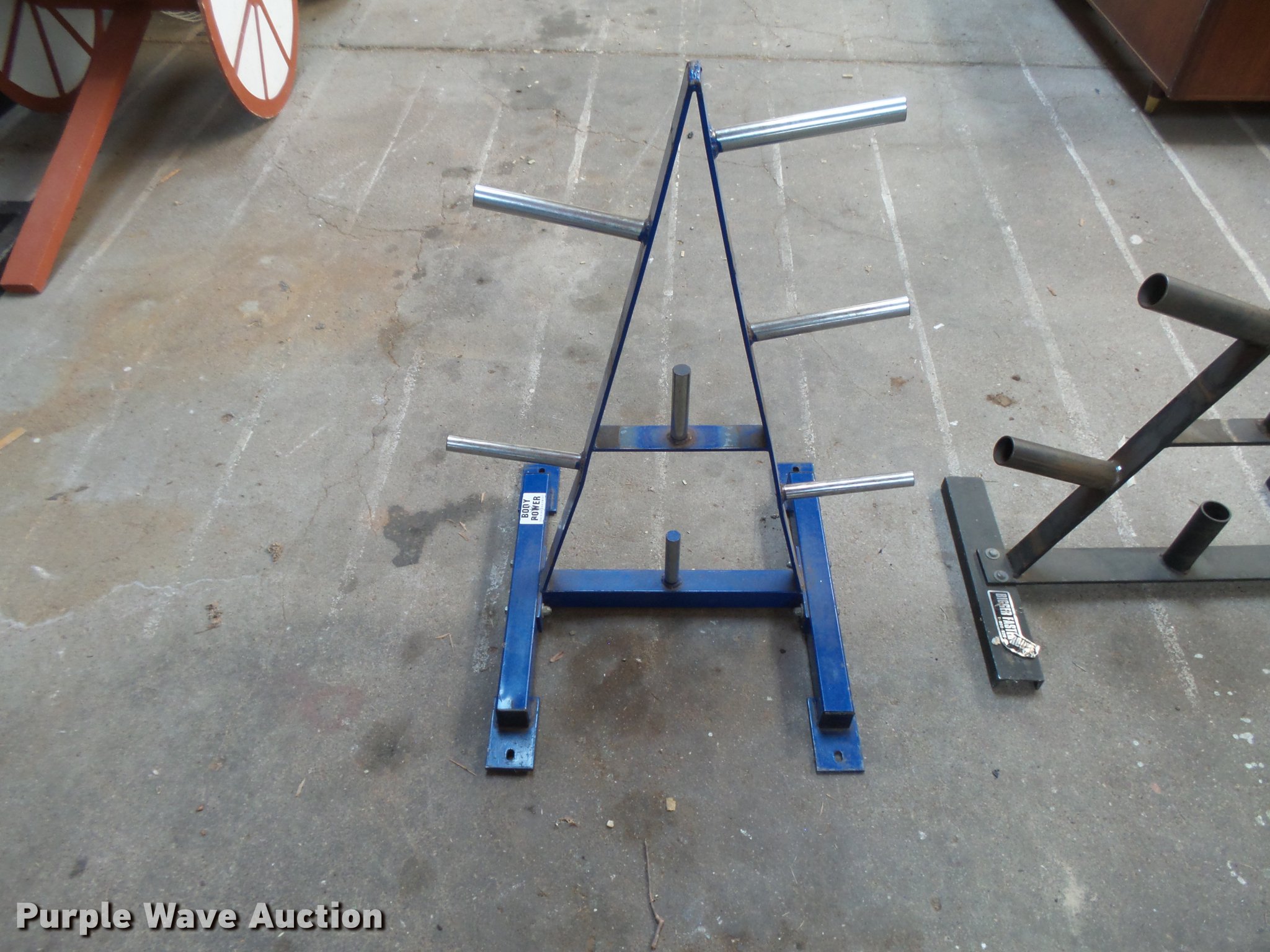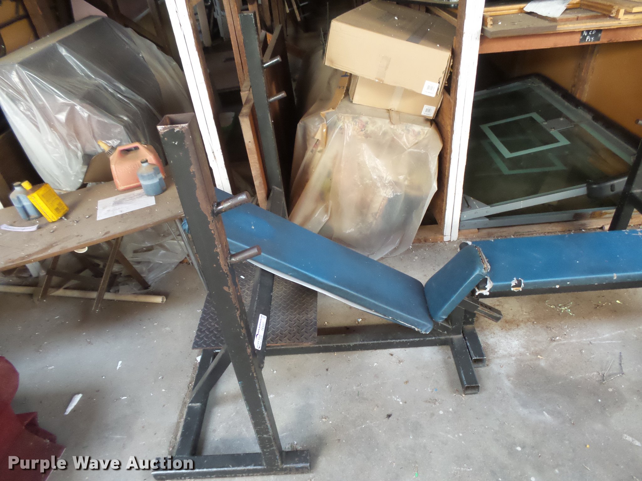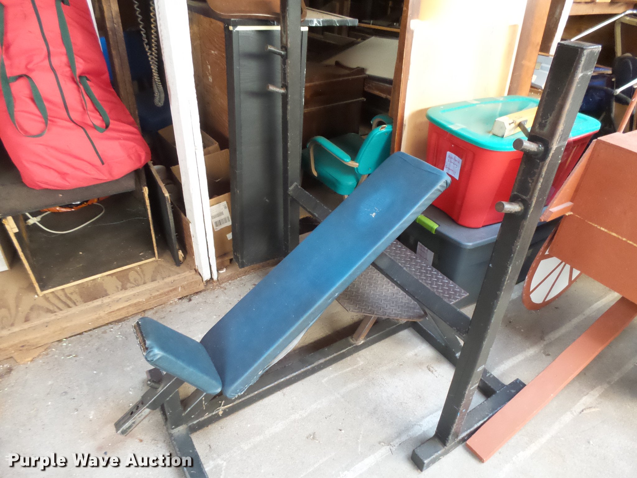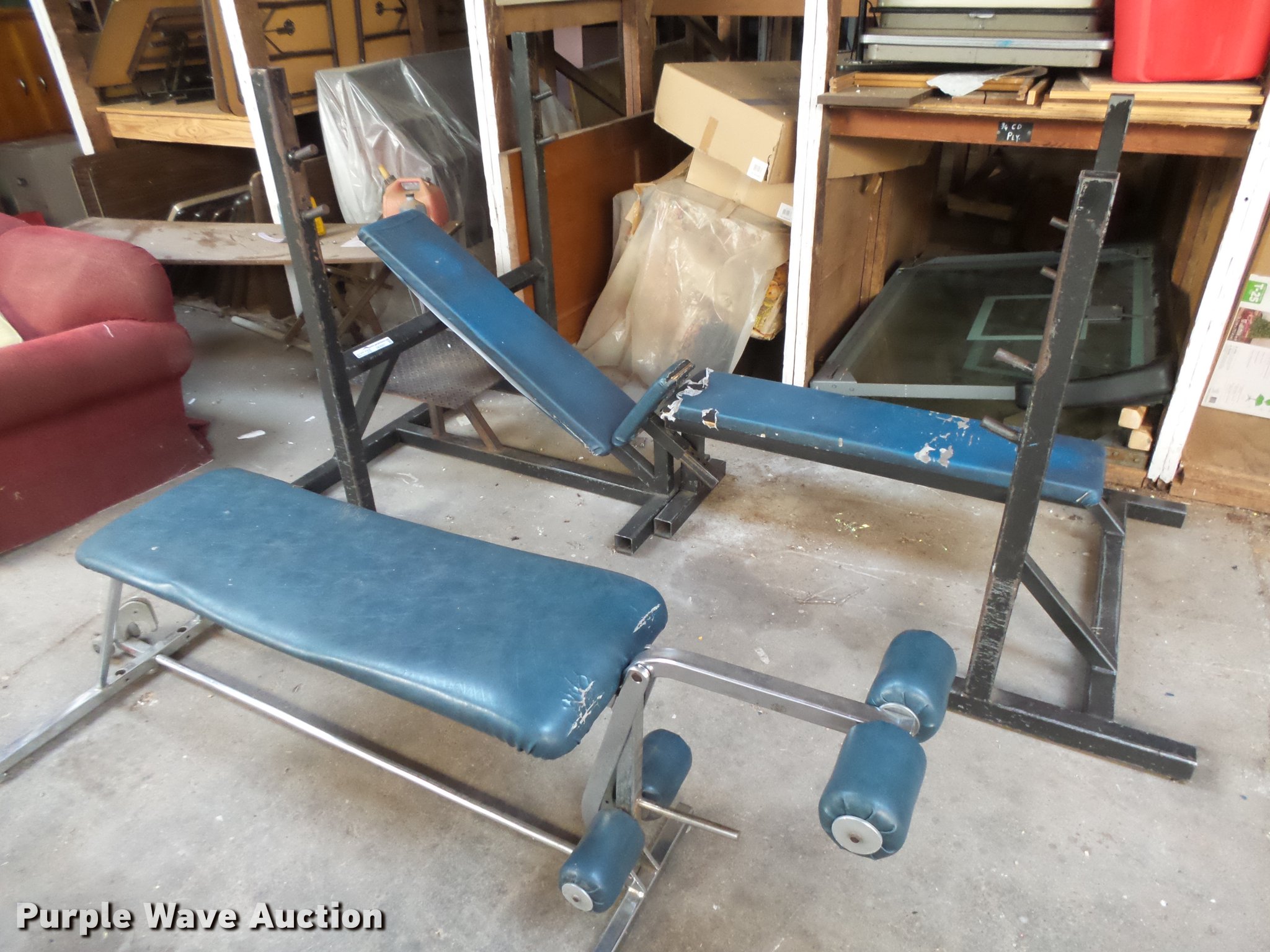Purple Wave is selling a used Sporting Goods in Kansas. This item is a Weight room equipment with the following: (4) weight benches, (2) weight trees, (2) leg presses, Weight bag
