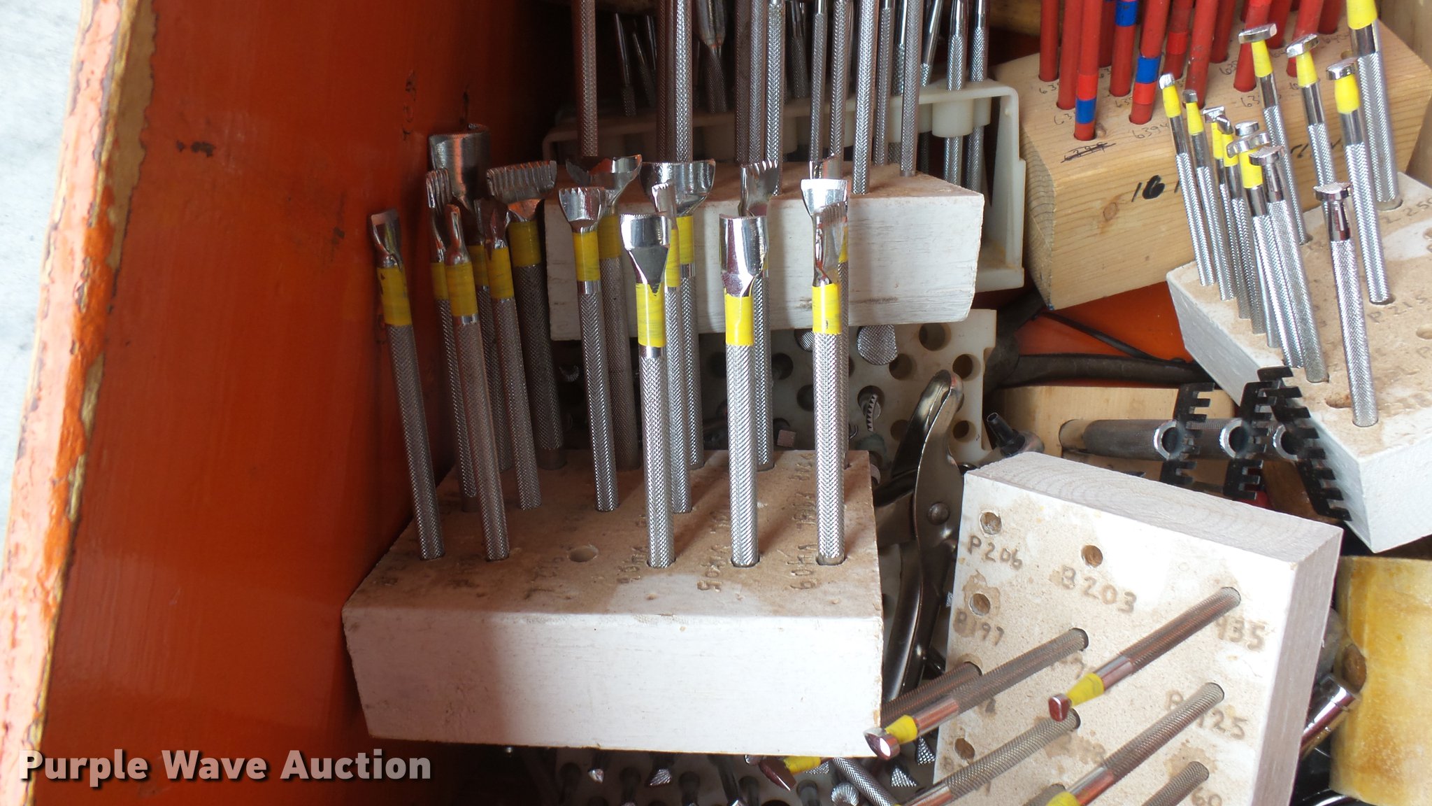 Purple Wave is selling a used Tools in Kansas. This item is a Leather tools with the following: (2) containers, Assorted punches, Hammers/mallets and more