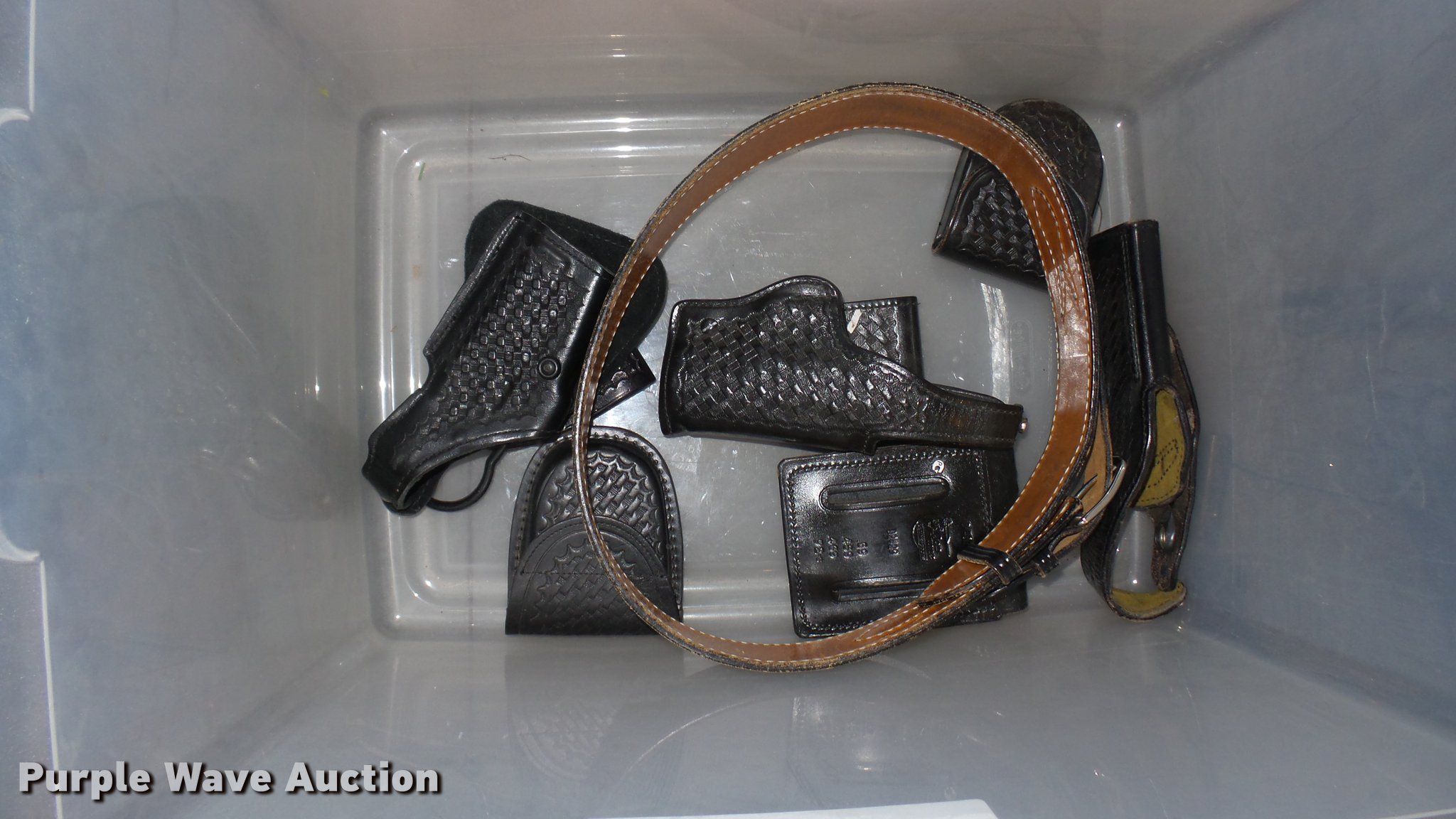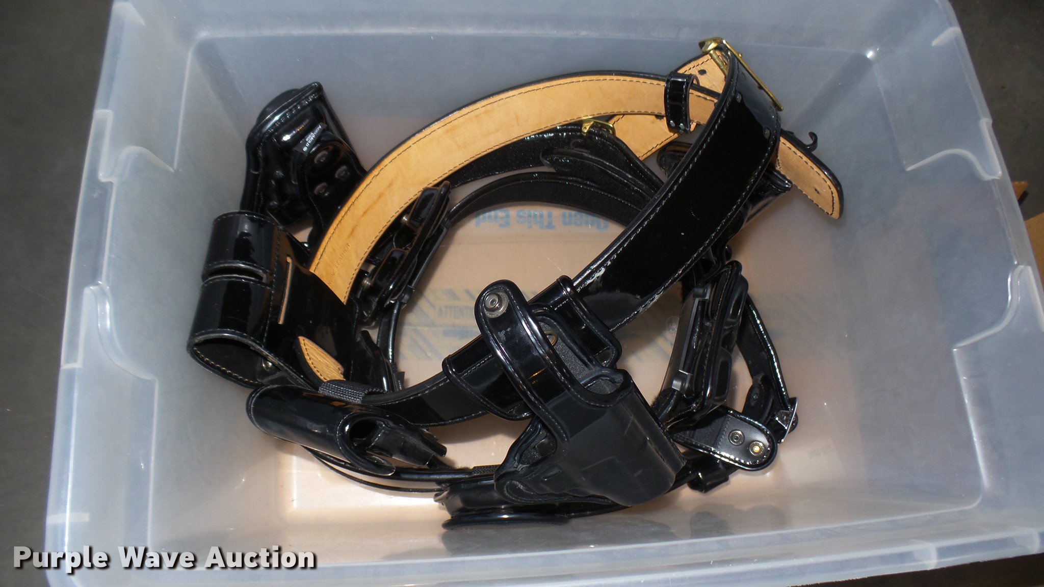 - (3) duty belts, size 38 with holsters, mag pouch, and handcuff case