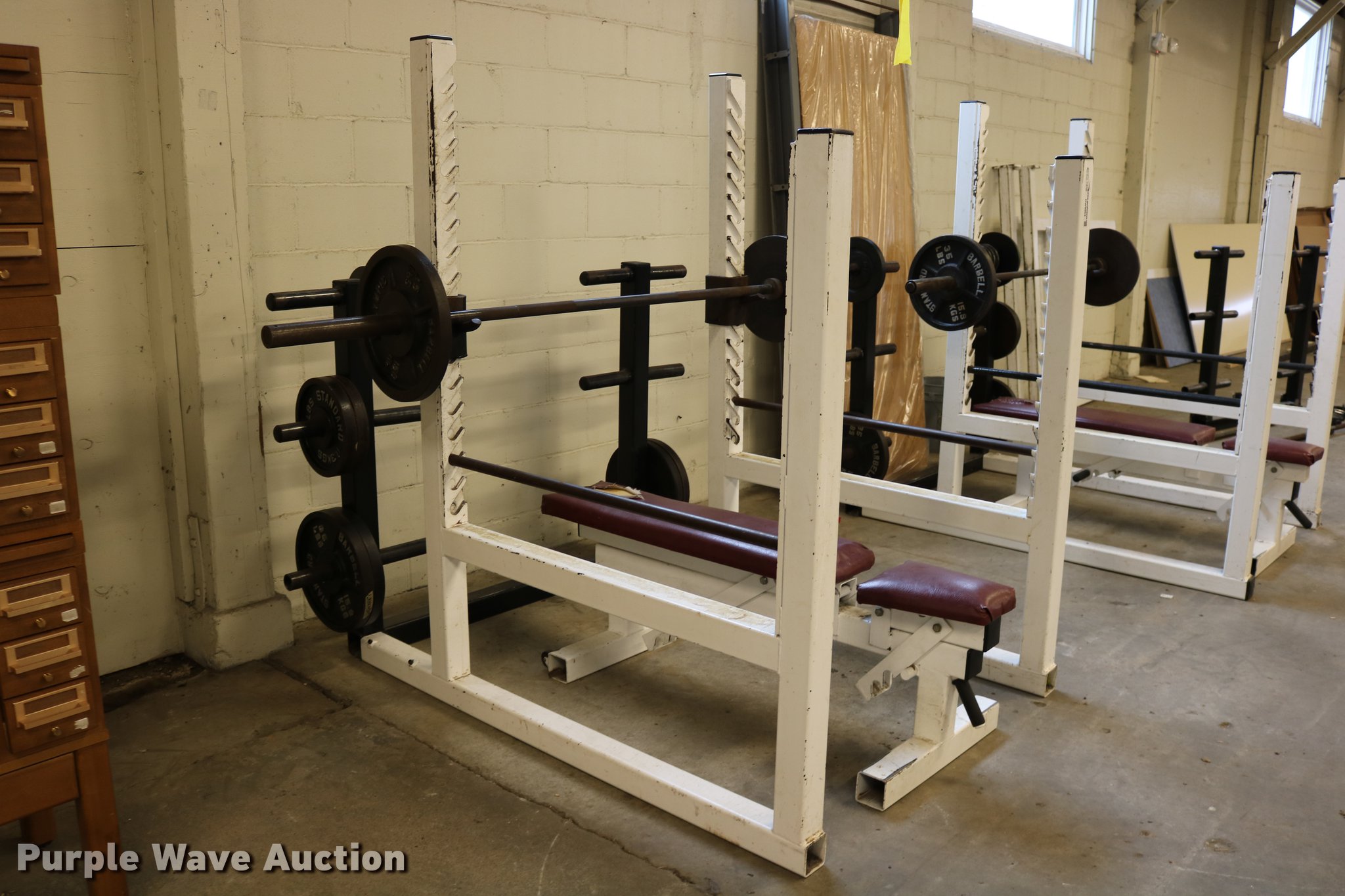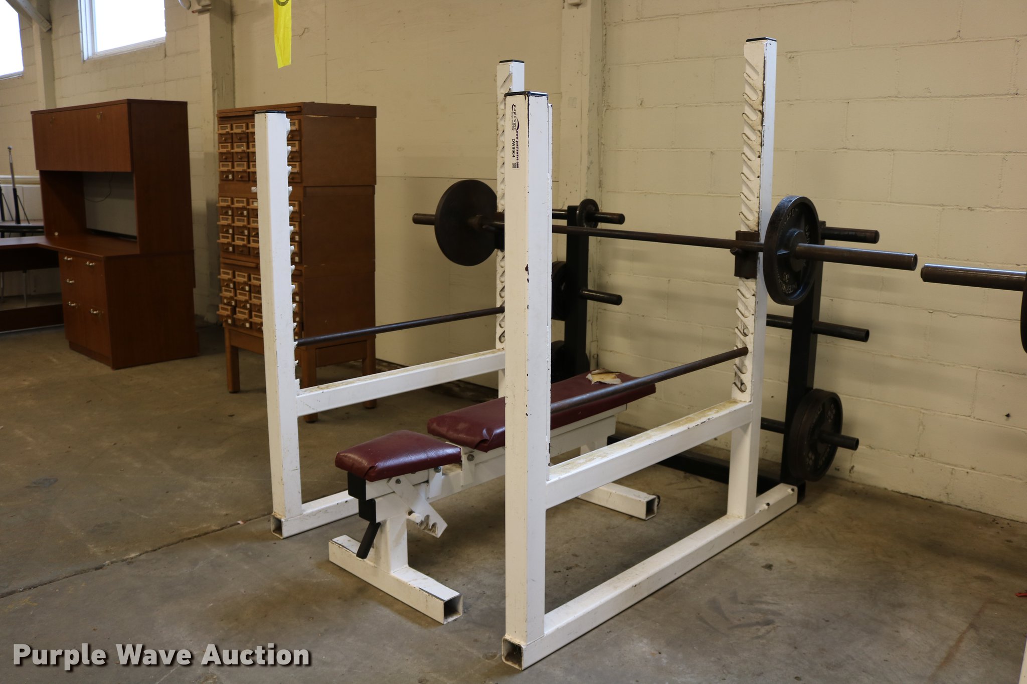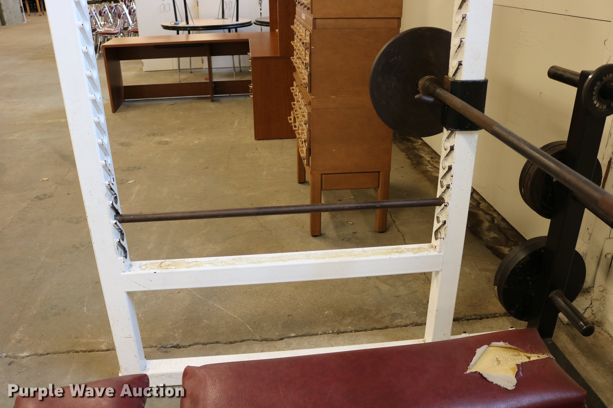 Purple Wave is selling a used Sporting Goods in Kansas. This item is a Weight room equipment with the following: Bench press, Squat rack, (6) 35 lbs weights, (2) 25 lbs weights, (2) 2.5 lbs weights, Weight bars, Adjustable bench