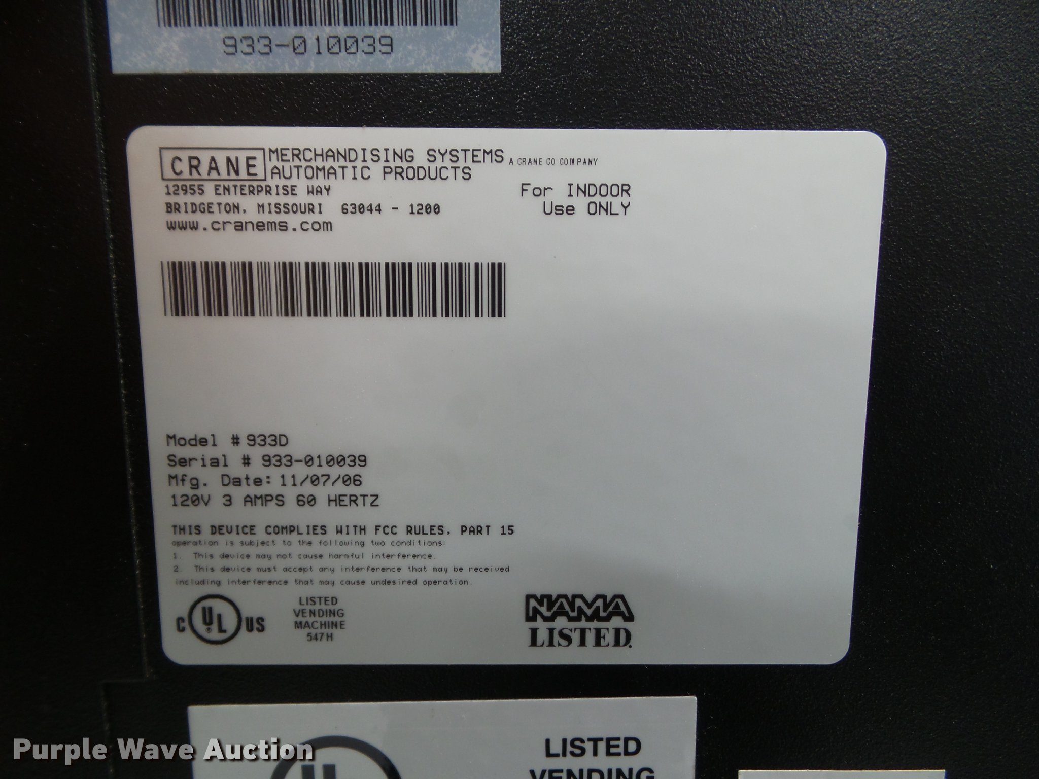 Purple Wave is selling a used Retail Displays in Iowa. This item is a Crane Merchandising Systems vending machine with the following: Model 933D, 39" x 35" x 72", 120V, Single phase, Serial 933-010039