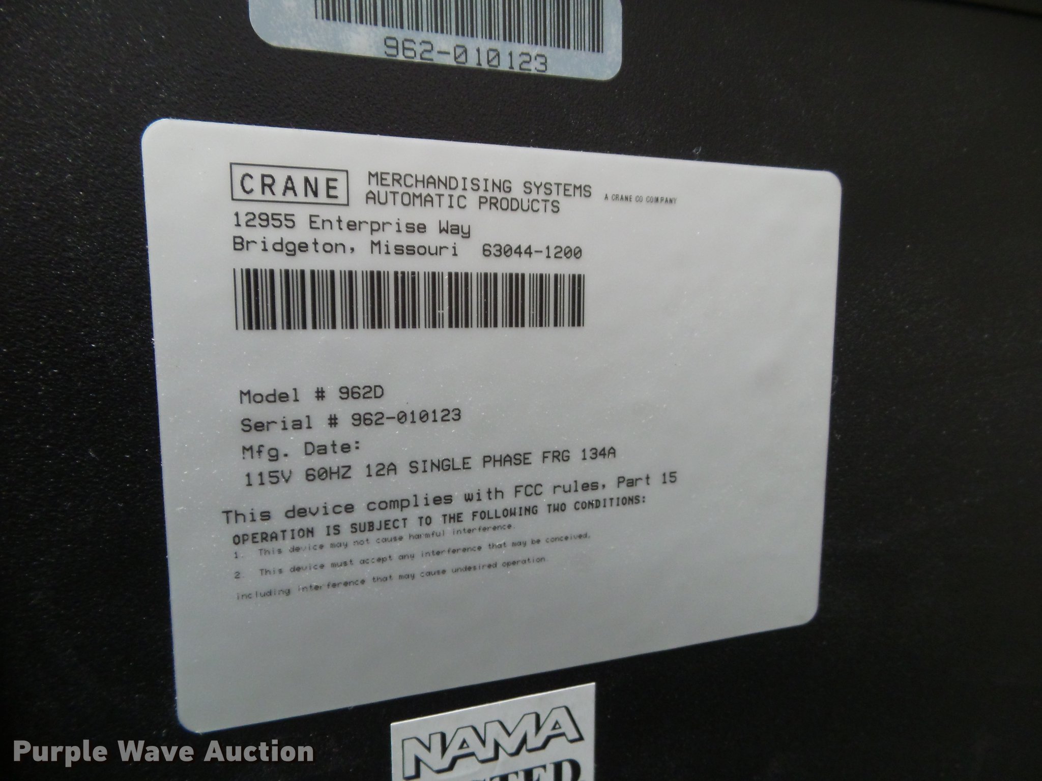 Purple Wave is selling a used Retail Displays in Iowa. This item is a Crane Merchandising Systems vending machine with the following: Model 962D, 38.25" x 30" x 72", 115V, Single phase, Serial 962-010123