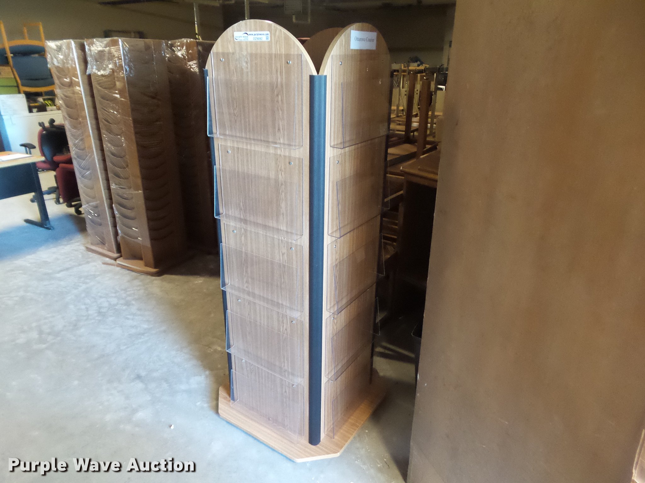 Purple Wave is selling a used Furniture in Iowa. This item is a Rotating newspaper rack with the following: 68"H, 28.5" x 28.5" base