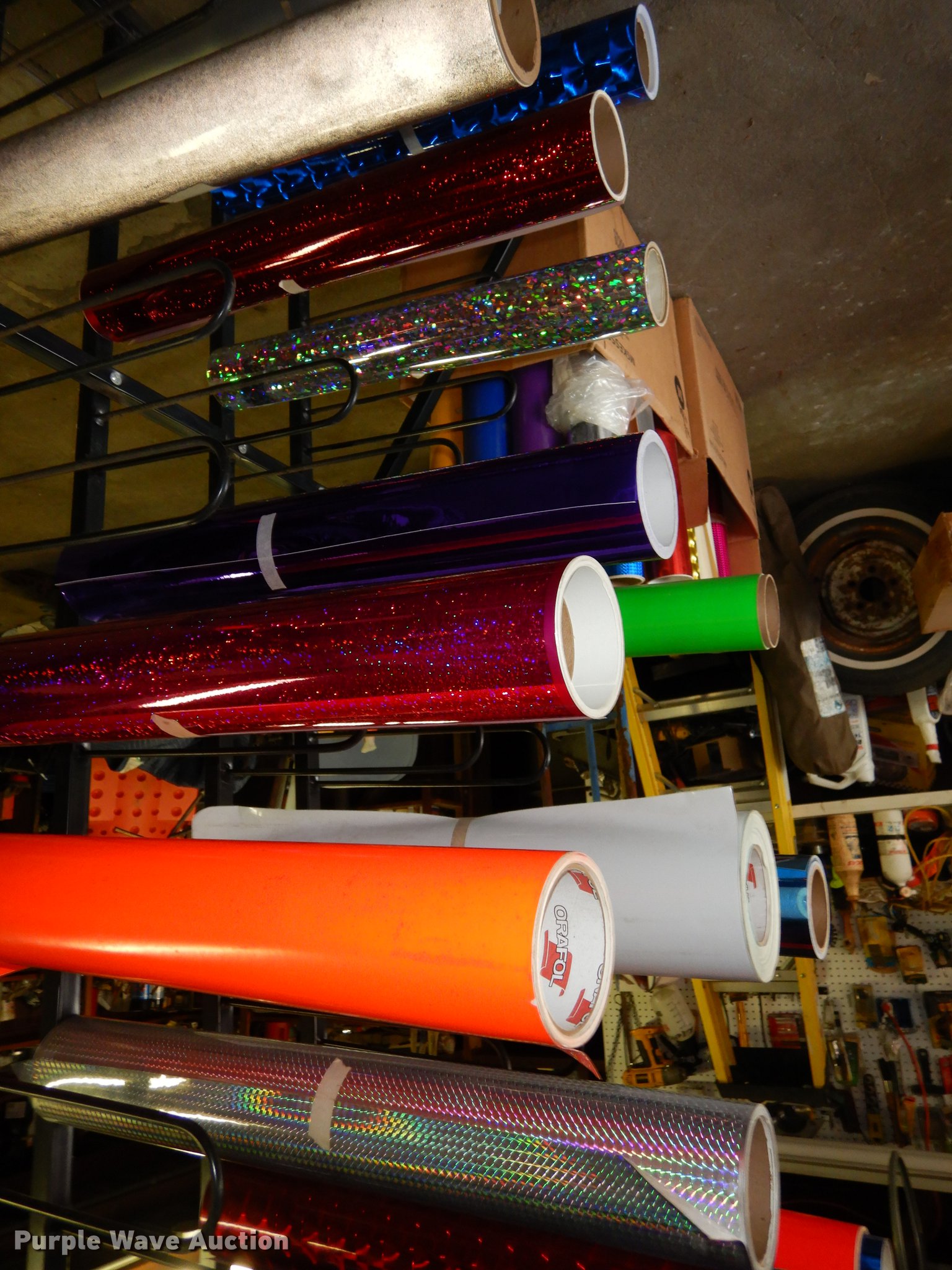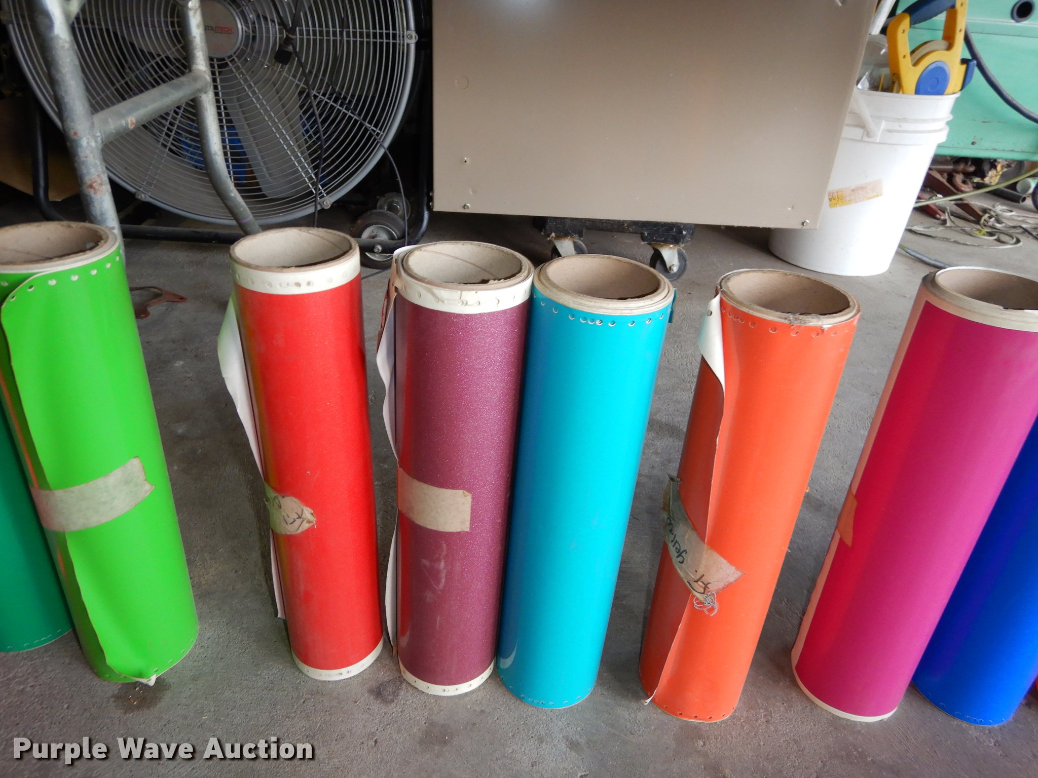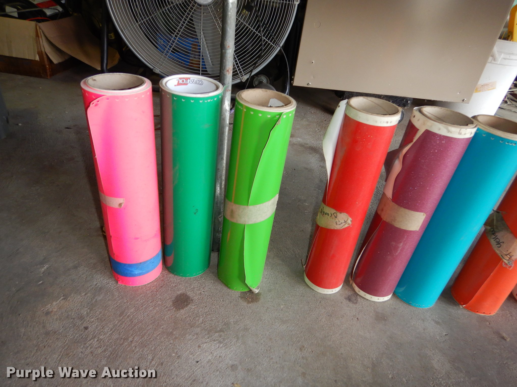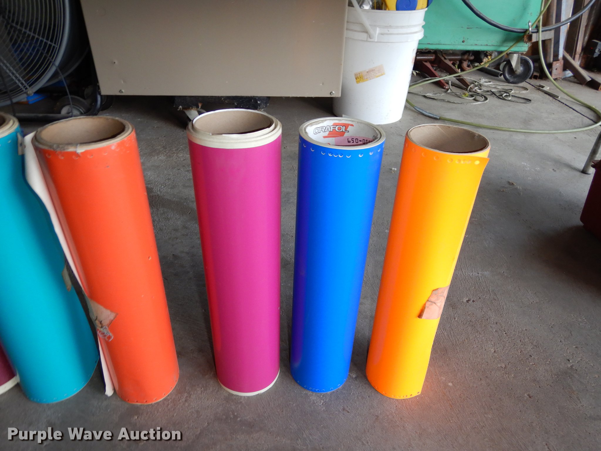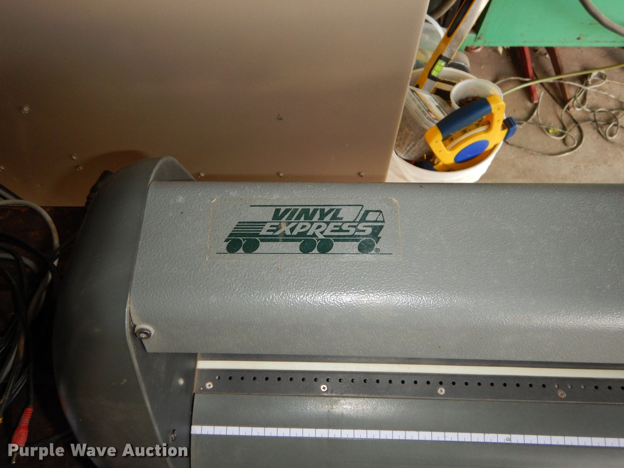 Purple Wave is selling a used Tools in Kansas. This item is a Vinyl express unit with the following: Applicator fluid, Sign warehouse tape, Rollers/scrapers, (13) assorted design CDs, LG CPU, Mac Innovision monitor, Keyboard, Mouse, Speakers, 24" vinyl cutter, Stand, Instruction/operators manual, Approx. 55 partial rolls of vinyl, Various widths, 18" and 24", Rack, Sample artwork not included, Table not included