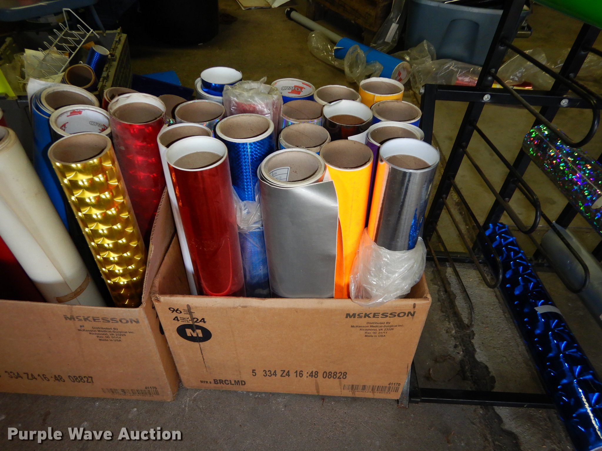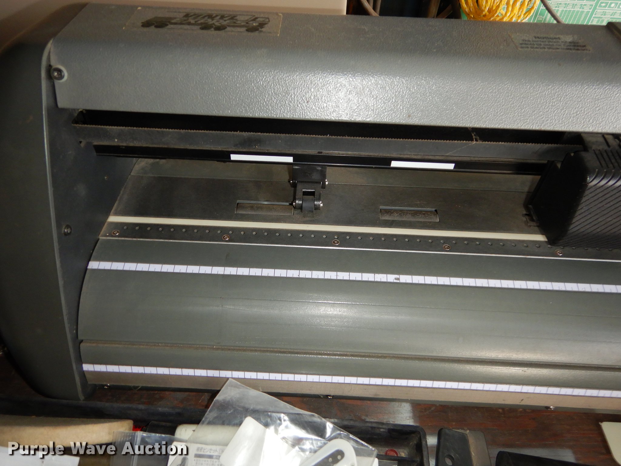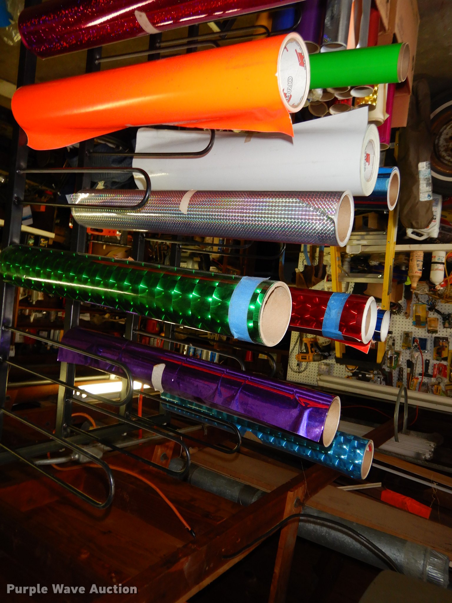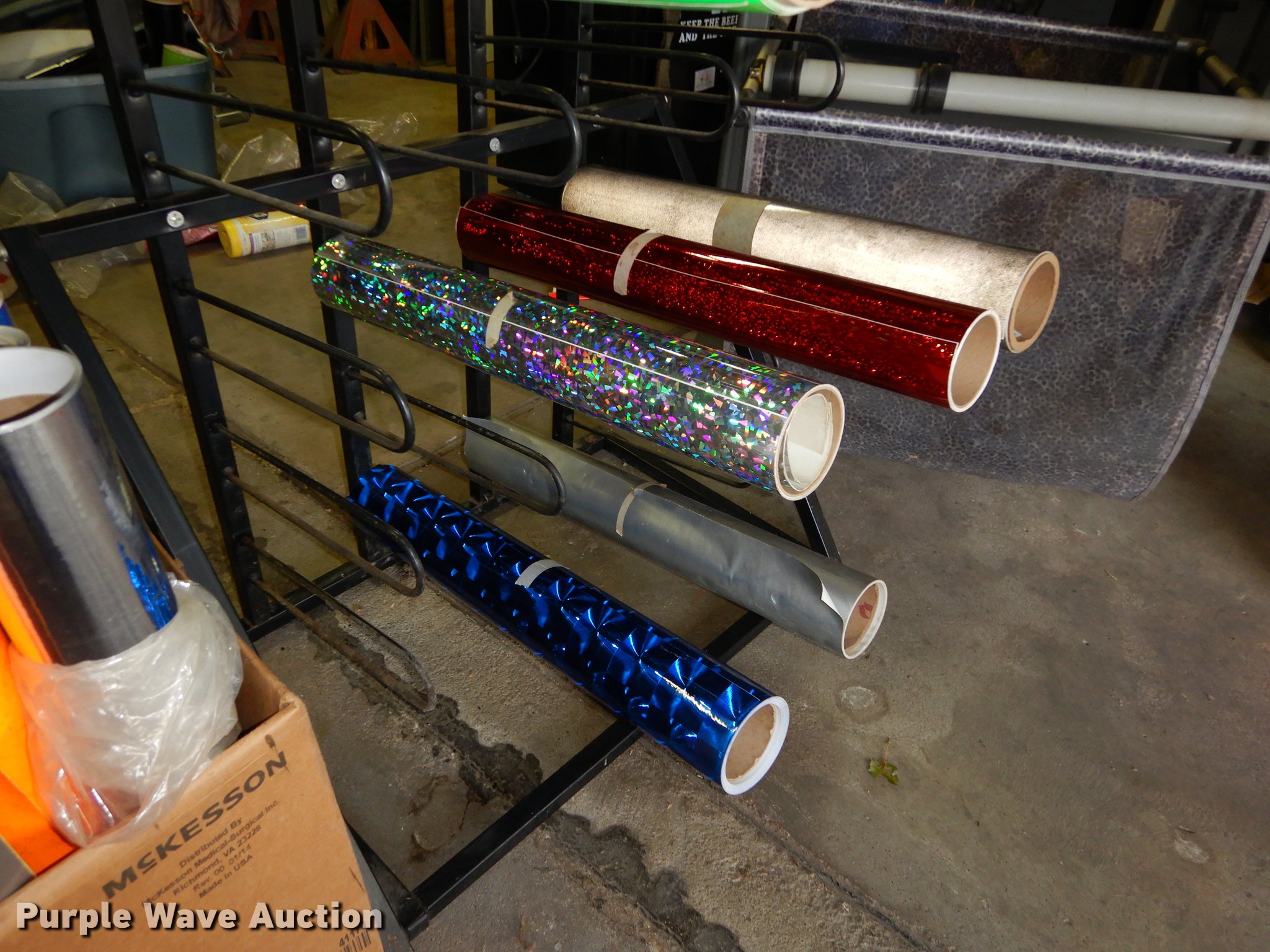 Purple Wave is selling a used Tools in Kansas. This item is a Vinyl express unit with the following: Applicator fluid, Sign warehouse tape, Rollers/scrapers, (13) assorted design CDs, LG CPU, Mac Innovision monitor, Keyboard, Mouse, Speakers, 24" vinyl cutter, Stand, Instruction/operators manual, Approx. 55 partial rolls of vinyl, Various widths, 18" and 24", Rack, Sample artwork not included, Table not included
