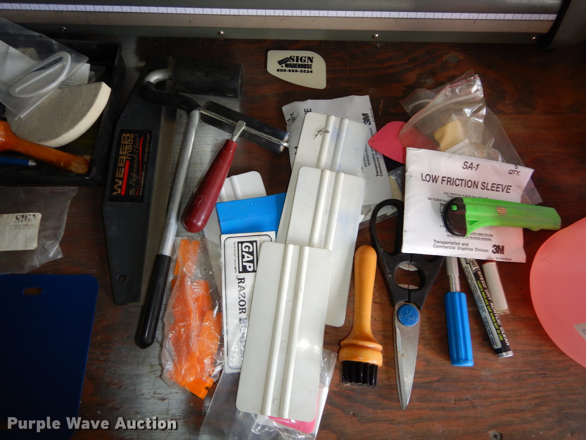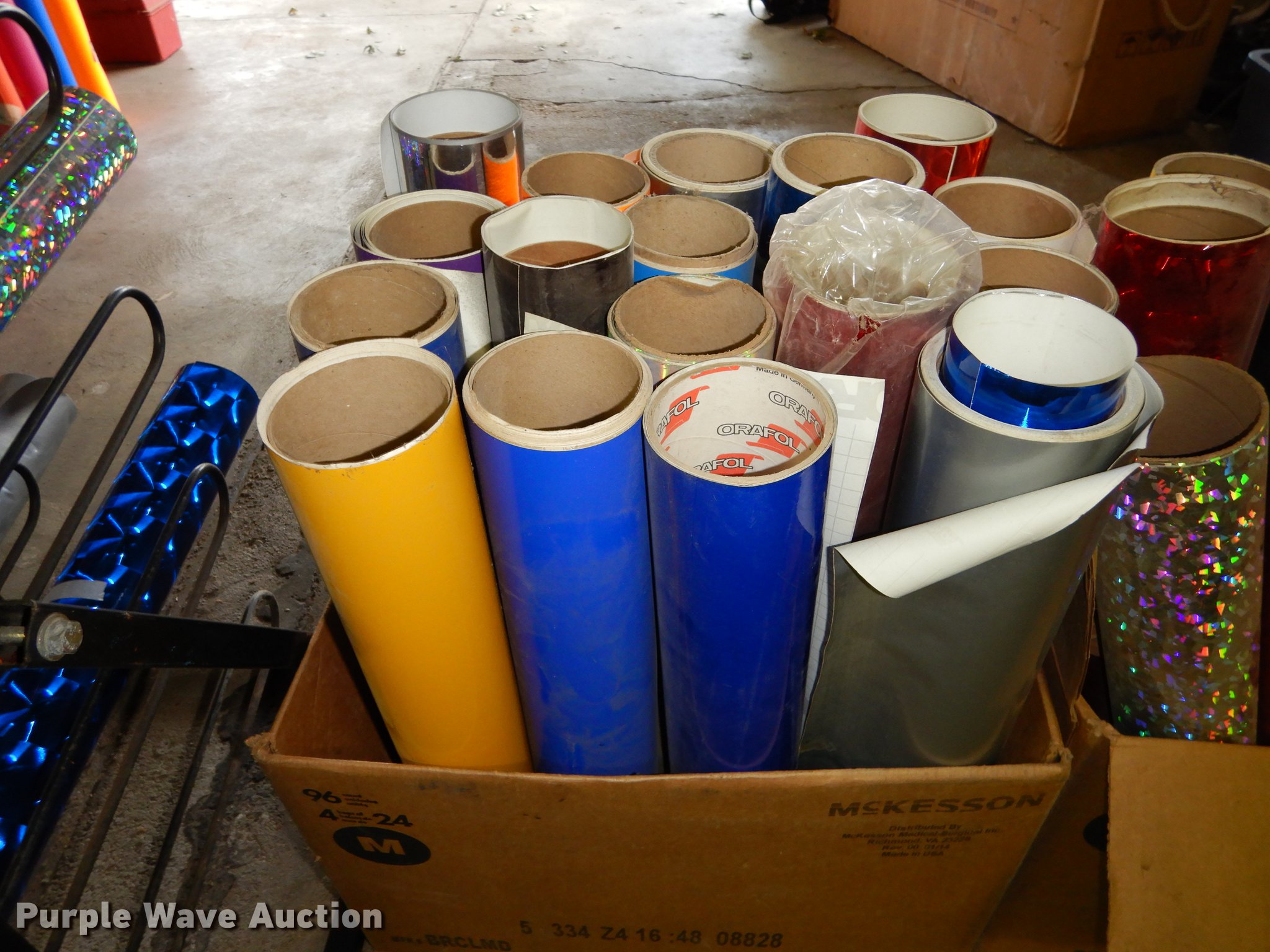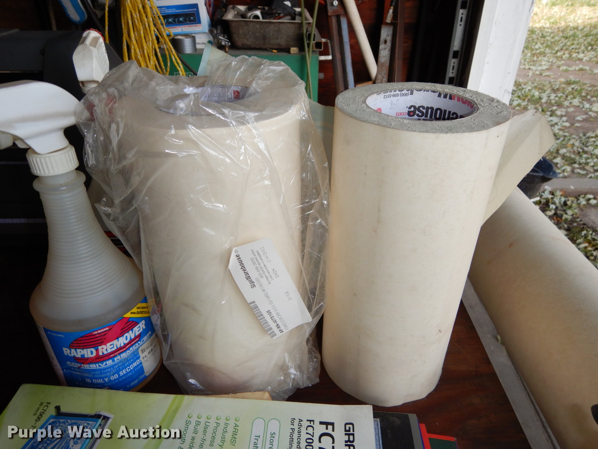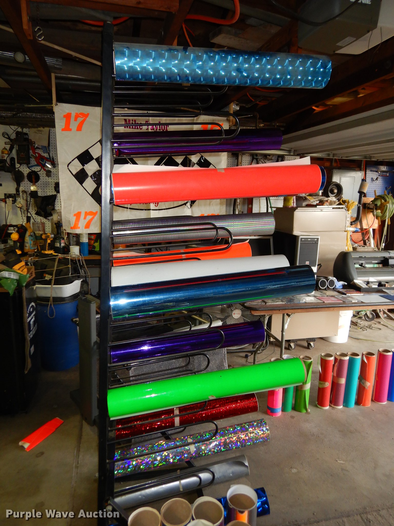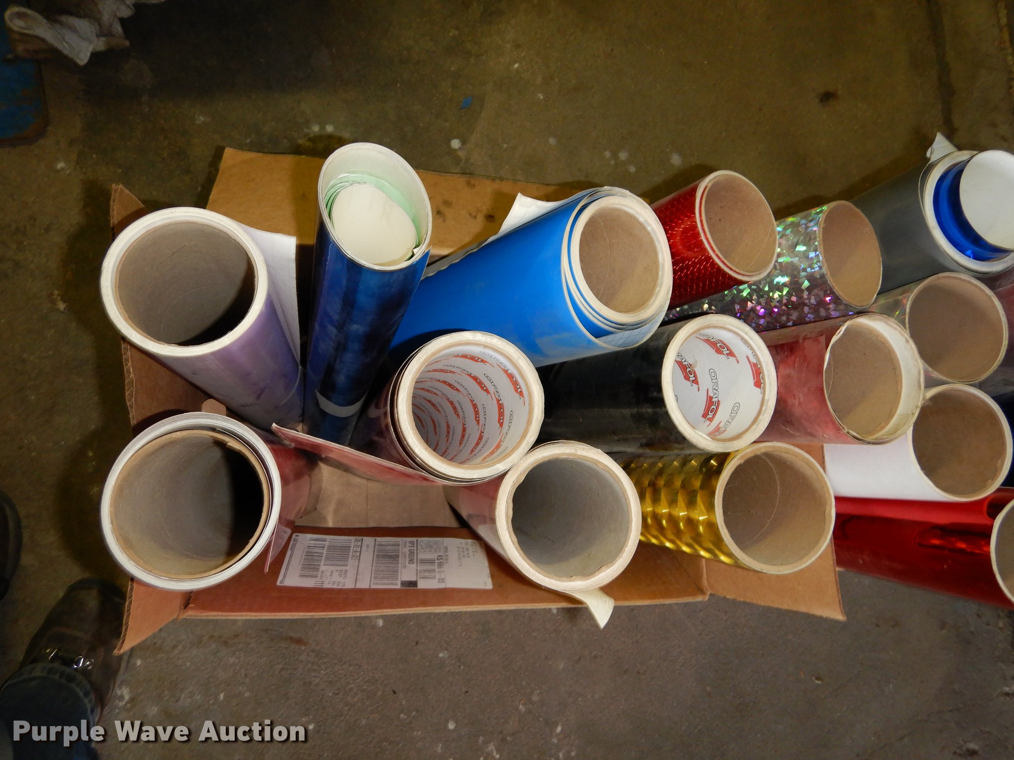 Purple Wave is selling a used Tools in Kansas. This item is a Vinyl express unit with the following: Applicator fluid, Sign warehouse tape, Rollers/scrapers, (13) assorted design CDs, LG CPU, Mac Innovision monitor, Keyboard, Mouse, Speakers, 24" vinyl cutter, Stand, Instruction/operators manual, Approx. 55 partial rolls of vinyl, Various widths, 18" and 24", Rack, Sample artwork not included, Table not included
