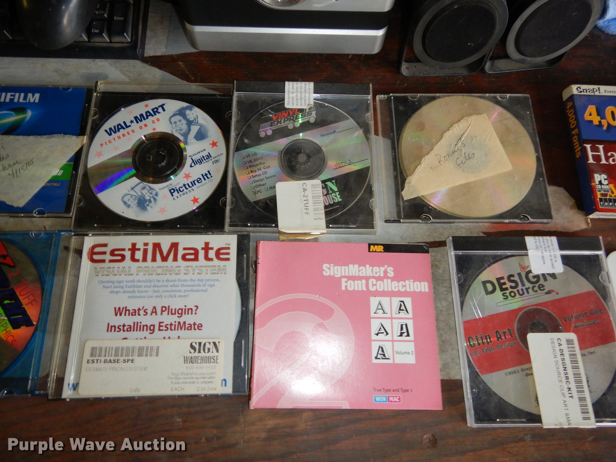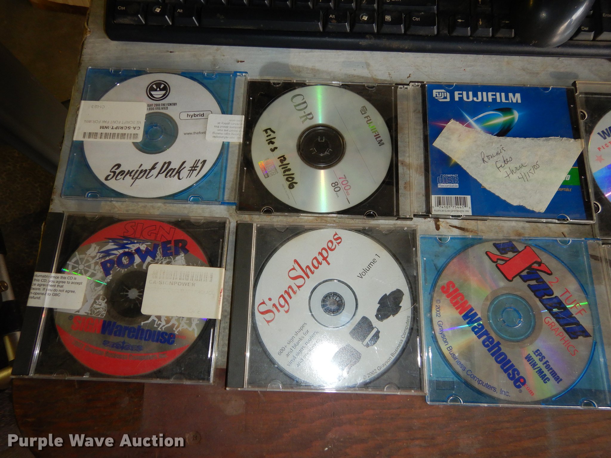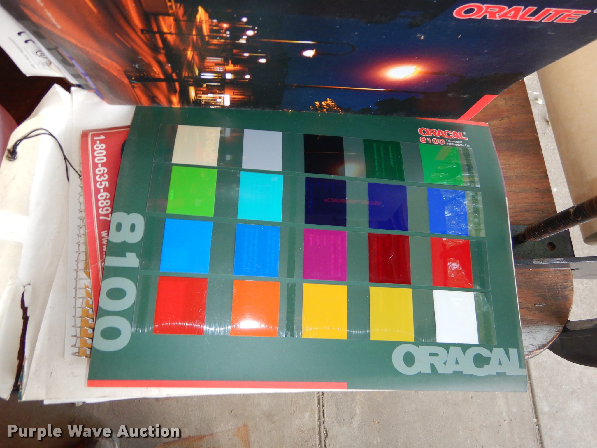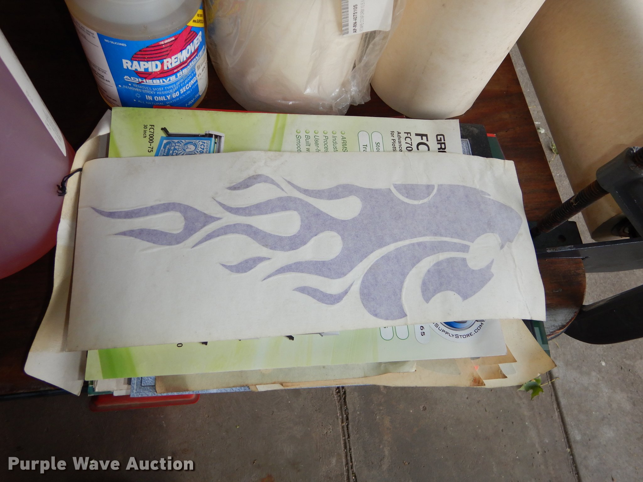 Purple Wave is selling a used Tools in Kansas. This item is a Vinyl express unit with the following: Applicator fluid, Sign warehouse tape, Rollers/scrapers, (13) assorted design CDs, LG CPU, Mac Innovision monitor, Keyboard, Mouse, Speakers, 24" vinyl cutter, Stand, Instruction/operators manual, Approx. 55 partial rolls of vinyl, Various widths, 18" and 24", Rack, Sample artwork not included, Table not included