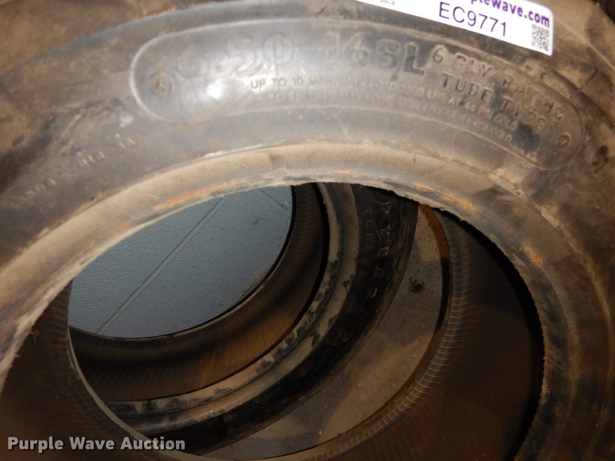 Purple Wave is selling a used Industrial Tires or Tracks in Kansas. This item is a (2) implement tires with the following: Goodyear 6.00-16, Farm Service 6.50-16, Six ply, Unused
