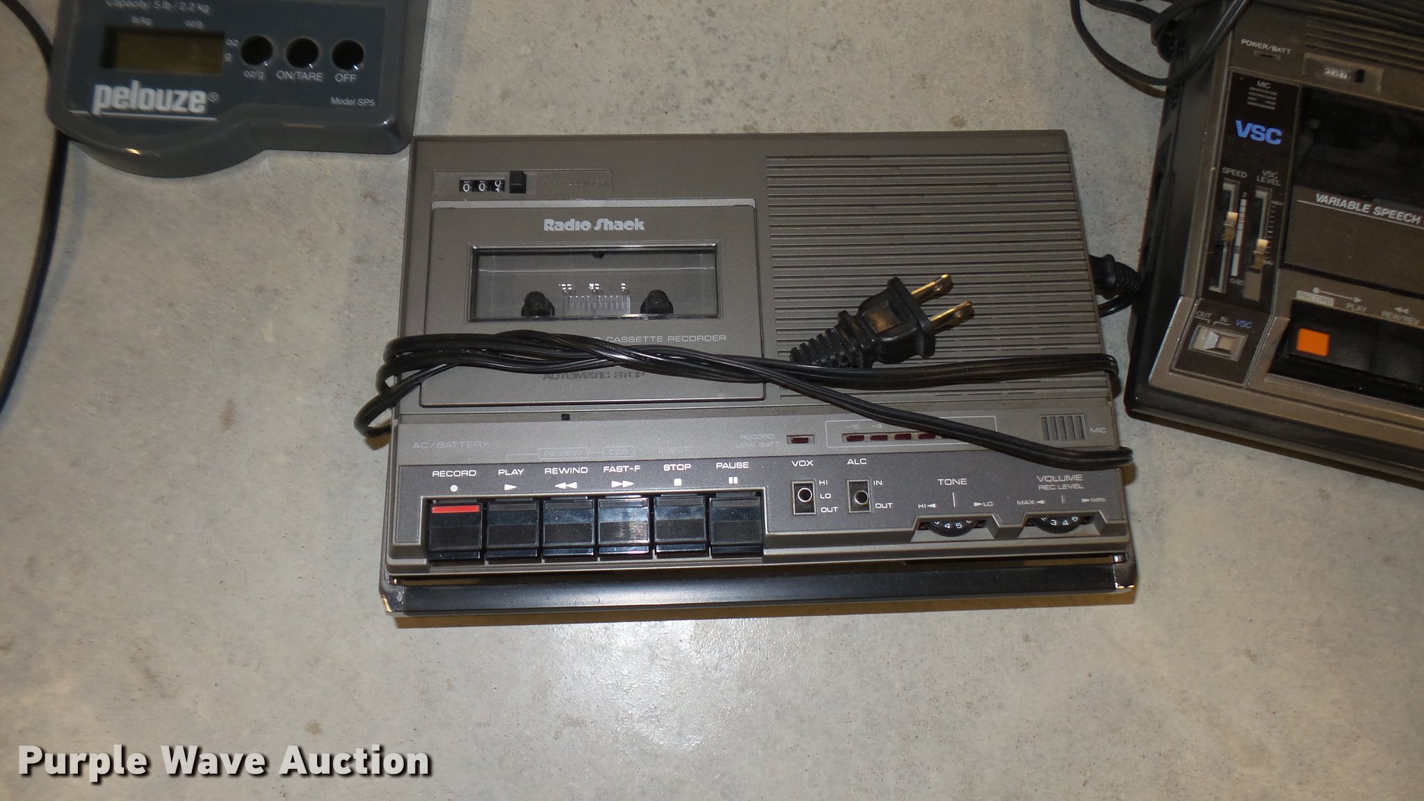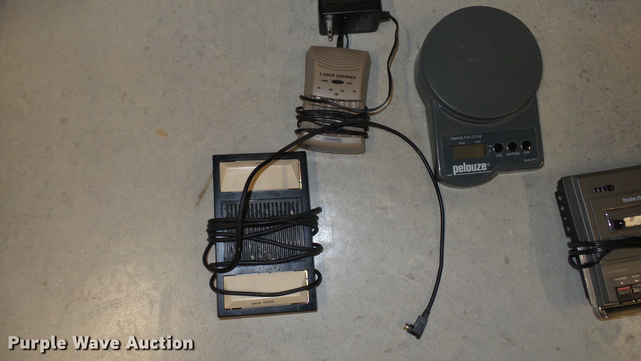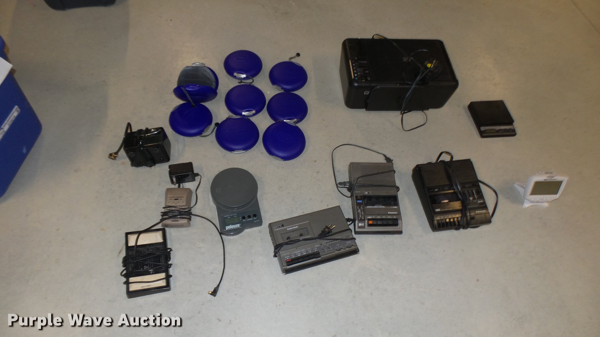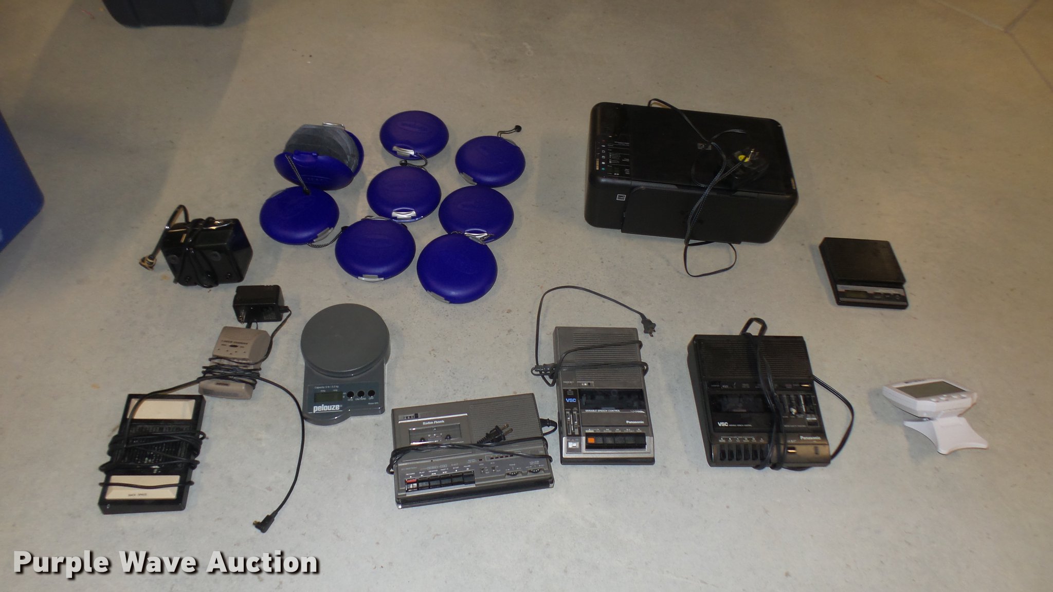 Purple Wave is selling a used Office Supplies and Equip. in Kansas. This item is a Office supplies with the following: (3) tape recorder/players, Caller ID, Pencil sharpener, (2) digital scales, AA battery charger, Dictation foot pedal, HP F4480 printer, (8) plastic CD/DVD cases